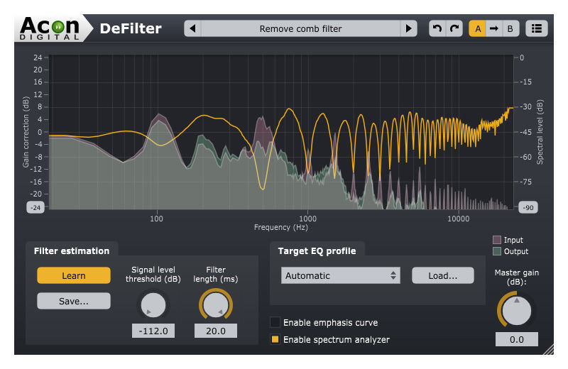 DeFilter is an efficient tool to even out tonal imbalances in a mix or reduce resonant peaks or dips in the frequency spectrum. Even severe issues such as comb filter effects or standing waves from untreated rooms can be addressed. DeFilter can match recordings to target profiles such as music or speech, or alternatively extract the overall timbre from the source – the large strokes – while evening out narrow peaks and dips. The latter removes resonances and comb filter effects effectively while preserving the tonal character of the input signal. Recordings can also be equalized to match a reference recording.