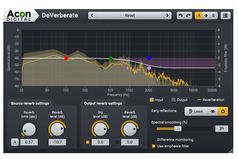 DeVerberate 2 introduces a new and unique Early Reflections Filter that works in conjunction with the late reverb suppression found in version 1. The Early Reflections Filter uses sophisticated statistical methods to estimate the so called impulse response of the early reflections. The impulse response is then utilized to calculate an inverse filter that cancels out the effect of the early reflections.