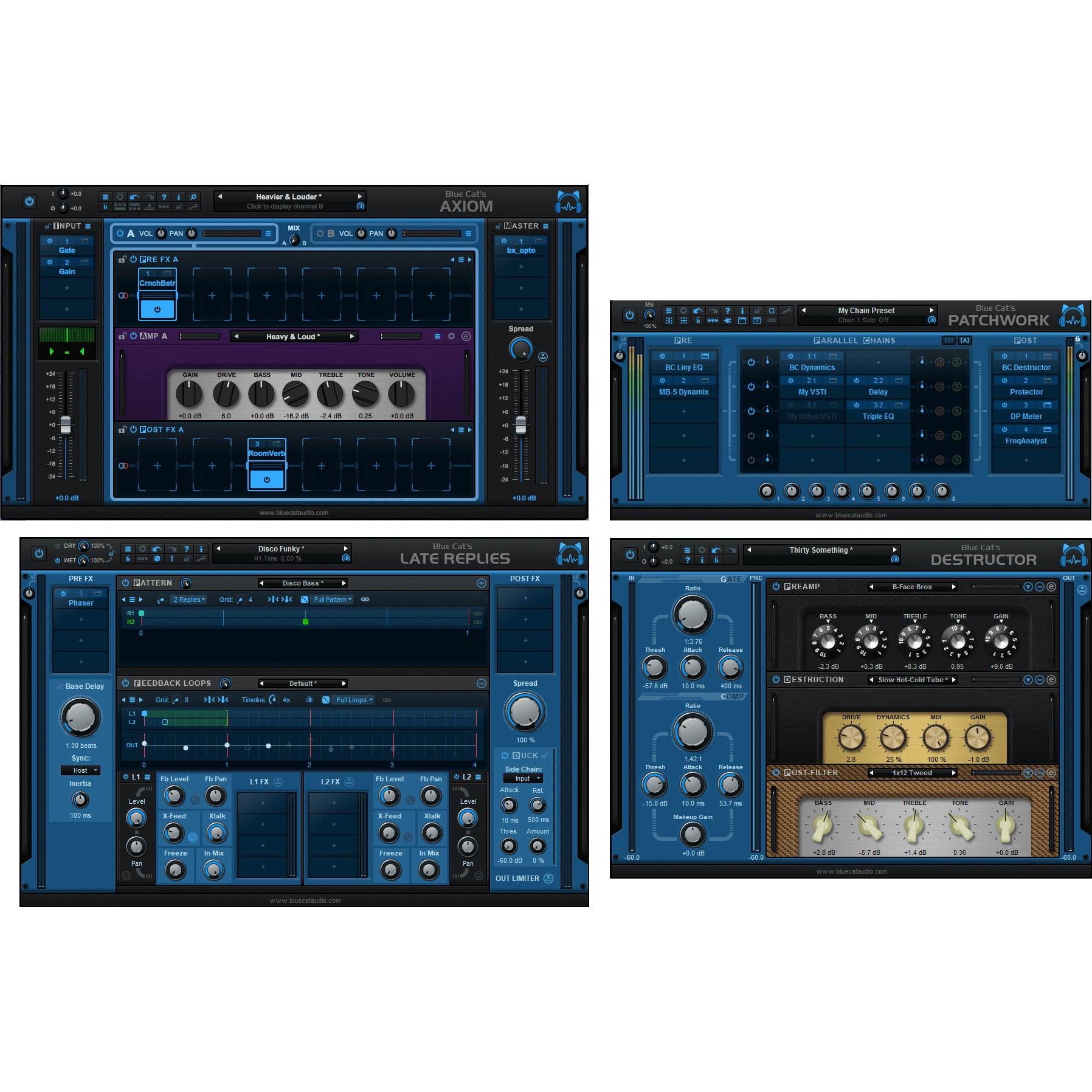 The Blue Cat's Axiom application and plug-in, our multi effects processor and amp simulator for guitar and bass, already contains built-in versions of Blue Cat's Destructor, Re-Guitar, Hot Tuna and Late Replies. The independent and full versions of these plug-ins are part of this bundle, to let you use them outside of Axiom, anywhere in your favorite DAW.