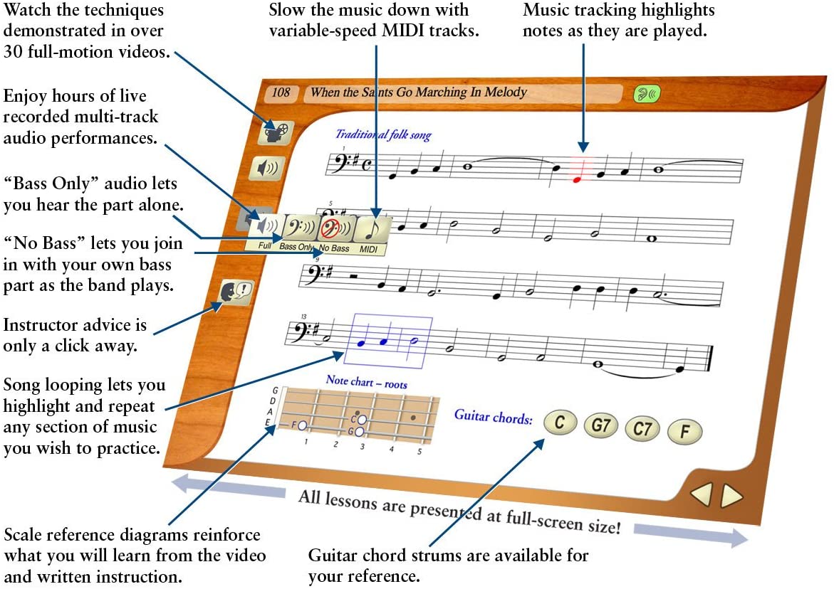 This program includes both multi-track audio and variable-speed MIDI audio, as well as bass-only and no-bass audio options. Many songs in eMedia Bass Method are also found in eMedia Guitar Method, so students can learn with over 200 songs and exercises, making learning fun and interesting.