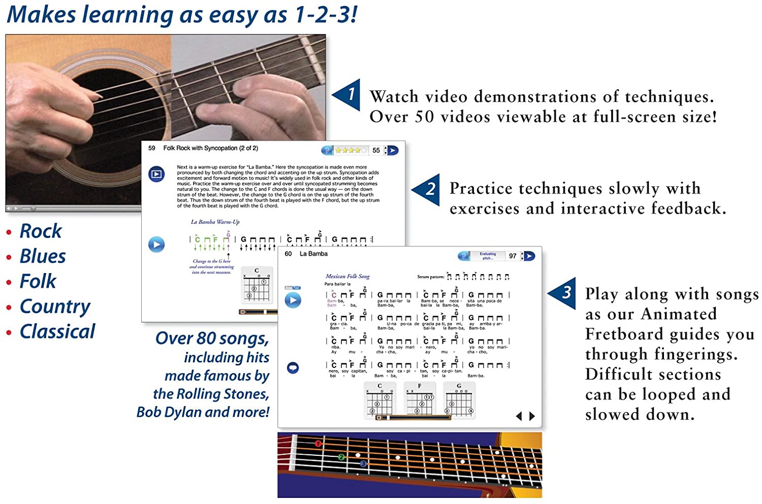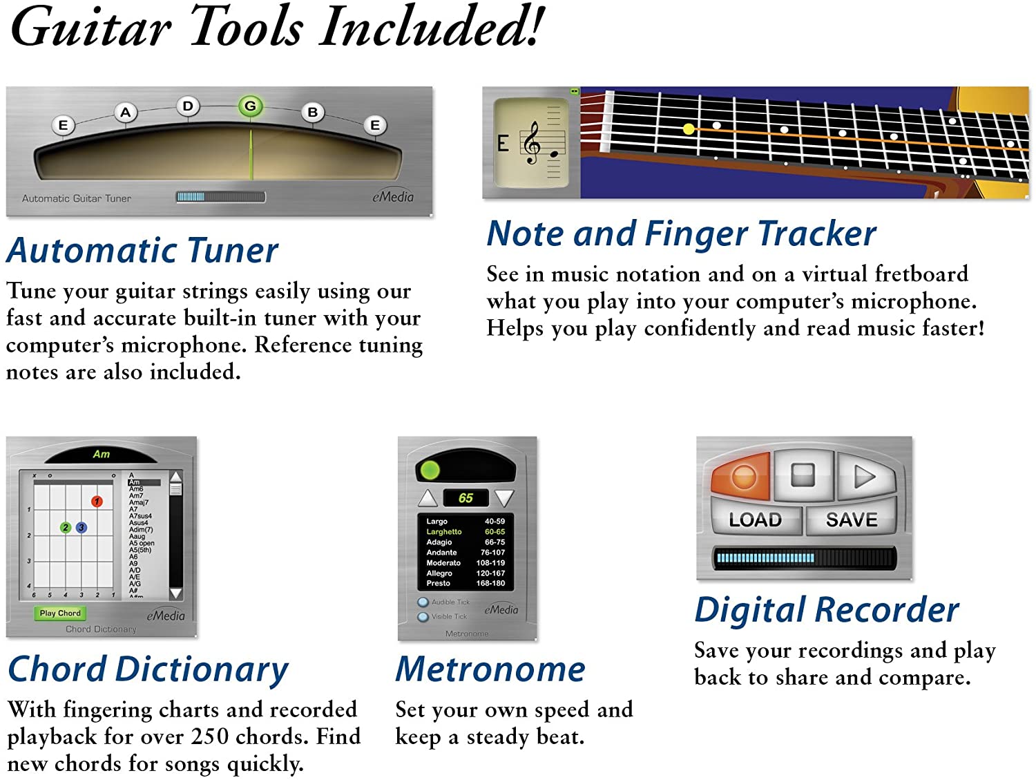 Guitar Method v6 offers a suite of powerful practice tools including an automatic tuner, a chord dictionary with fingering charts and audio playback for over 250 chords, a digital metronome for improving rhythm, an audio recorder to hear your performance and share it with friends, and a note and finger tracker to help you play confidently and read music faster.