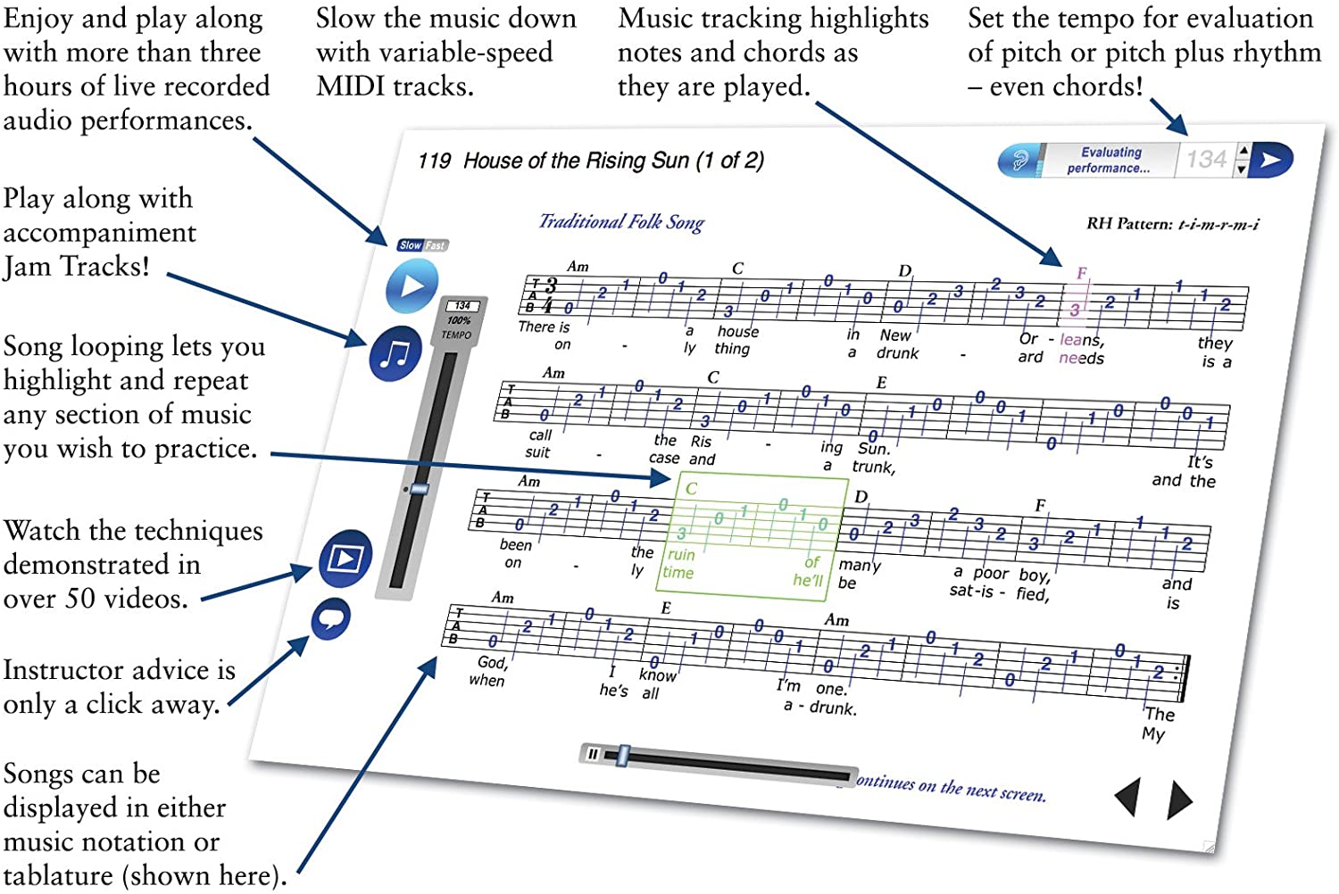 Learn to read tablature and standard music notation, play melodies, fingerpicking