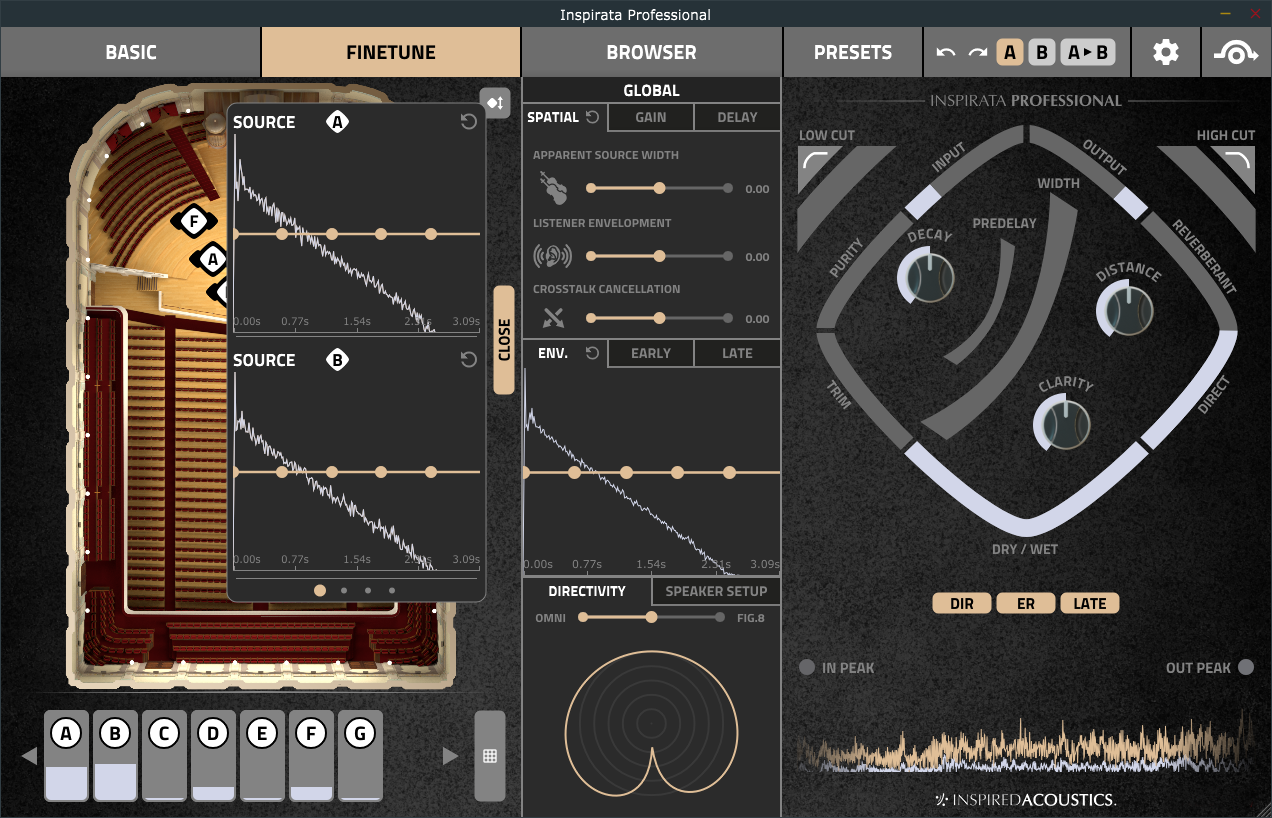 In Inspirata, we make it possible for you to control parameters that really matter to your ears - you can directly adjust acoustics and the sound of the space instead of the indirect properties that have no change to the sound. Gone is the time when you needed to bother with hall size, wall diffusion, or decorrelation only to get different results in each space. You now have full and independent control on how wide your sound source is in the space, how much of the blended sound reaches you, and how much it envelopes around your ears. Spatial room acoustical parameters such as apparent source sound width (ASW) and listener envelopment (LEV) are controllable for the first time directly in any reverberation solution. In addition to these revolutionary controls, you can also adjust the orientation of your speaker feeds in space - facing your stereo or surround setup in any direction. And you can change and automate all of these in real-time..