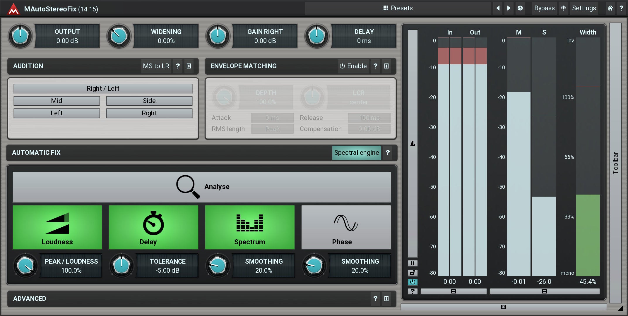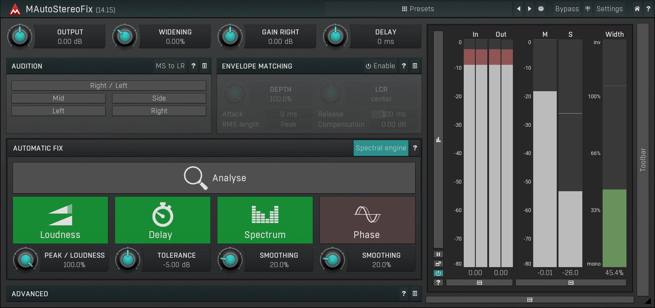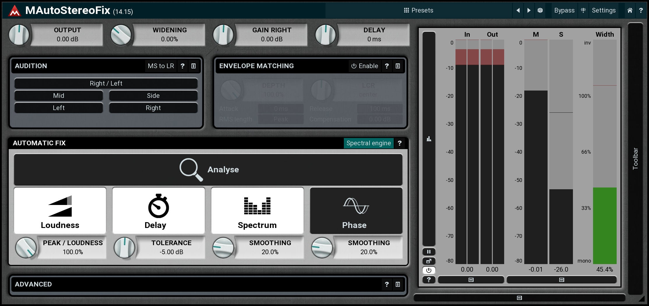MAutoStereoFix is a magical tool, that fixes problems in stereo recordings even if you didn't even know there are any! It has been designed for stereo microphone recordings such as overheads and rooms, but can be used on master tracks as well.