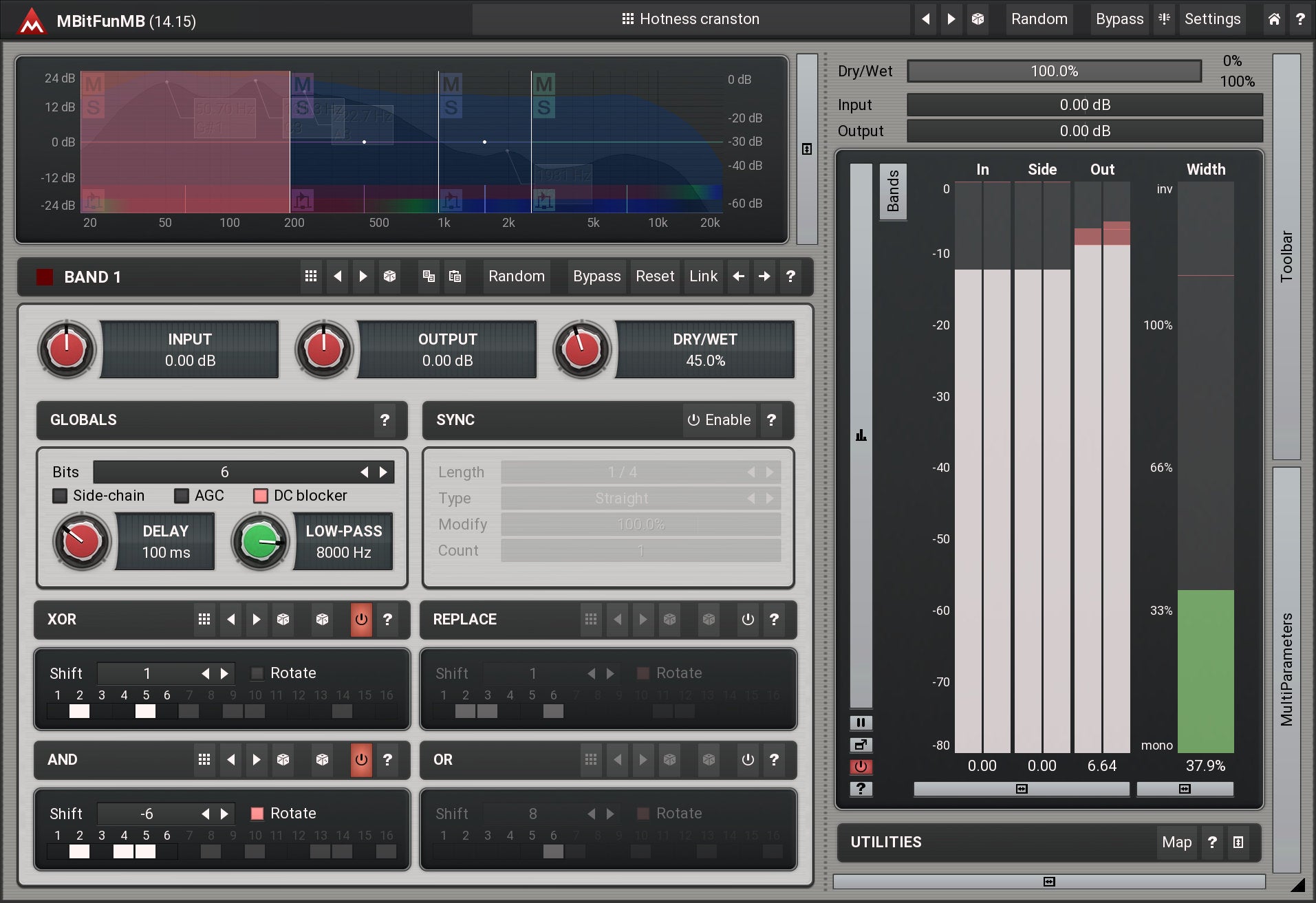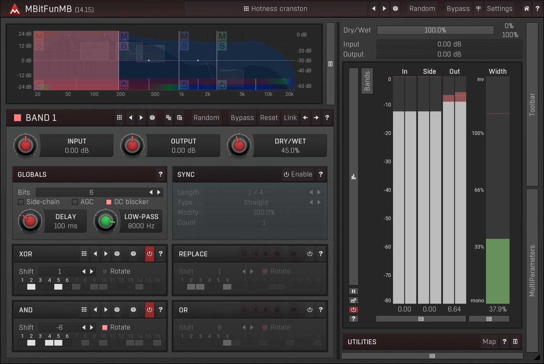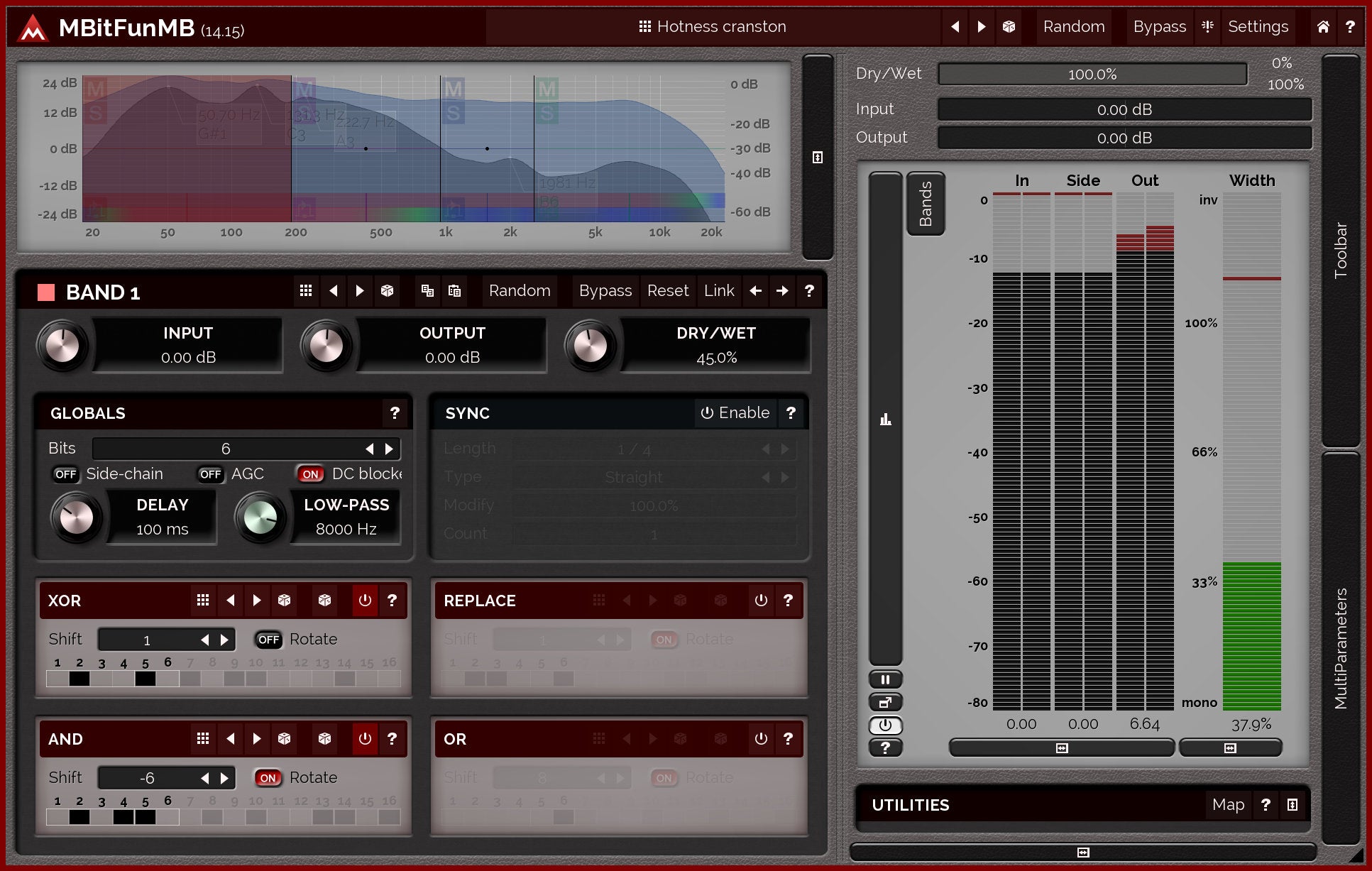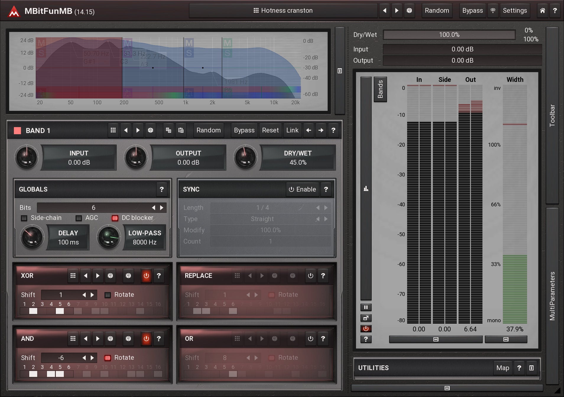 MBitFunMB is a serious tool for extreme distortion lovers. It converts the incoming audio into limited fixed-point precision data of 1-16 bits per sample and lets you access each bit with several bit-manipulation operations and finishes the processing with a low-pass filter. All with up to 6 independent frequency bands, 4 modulators.