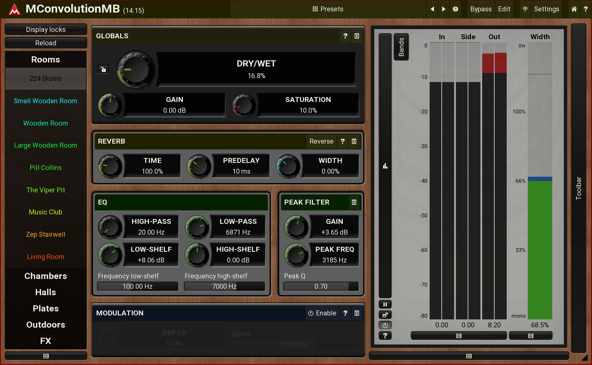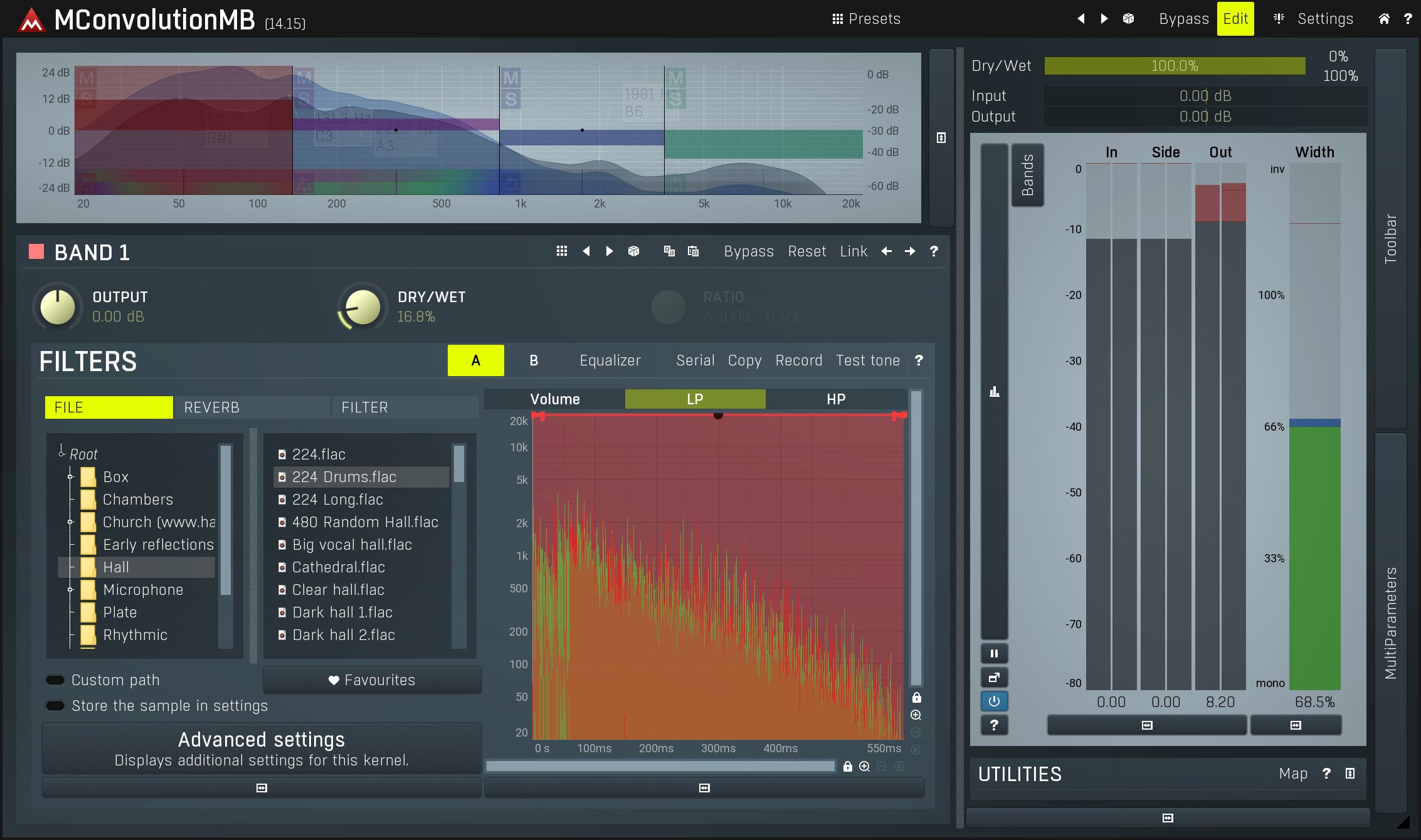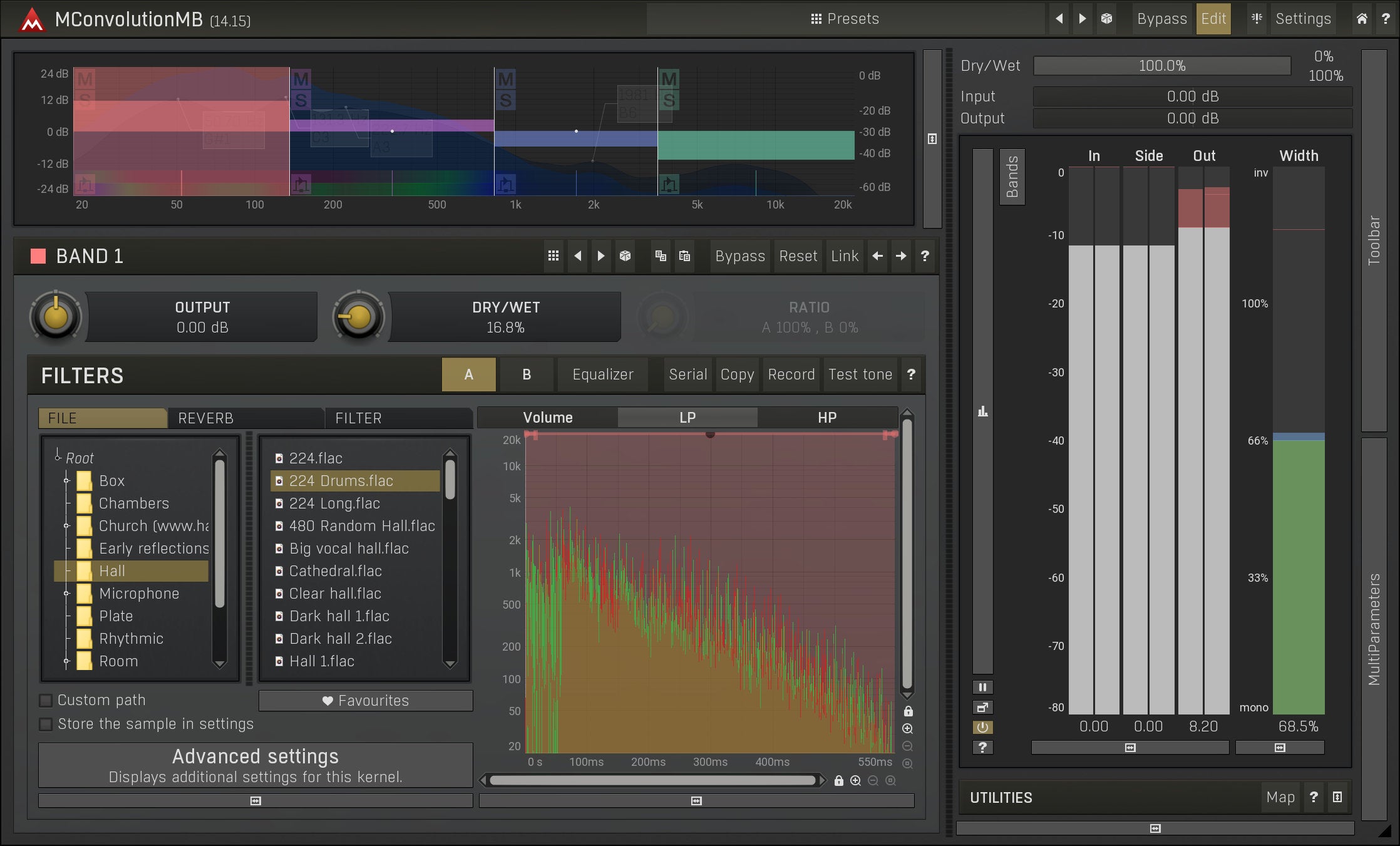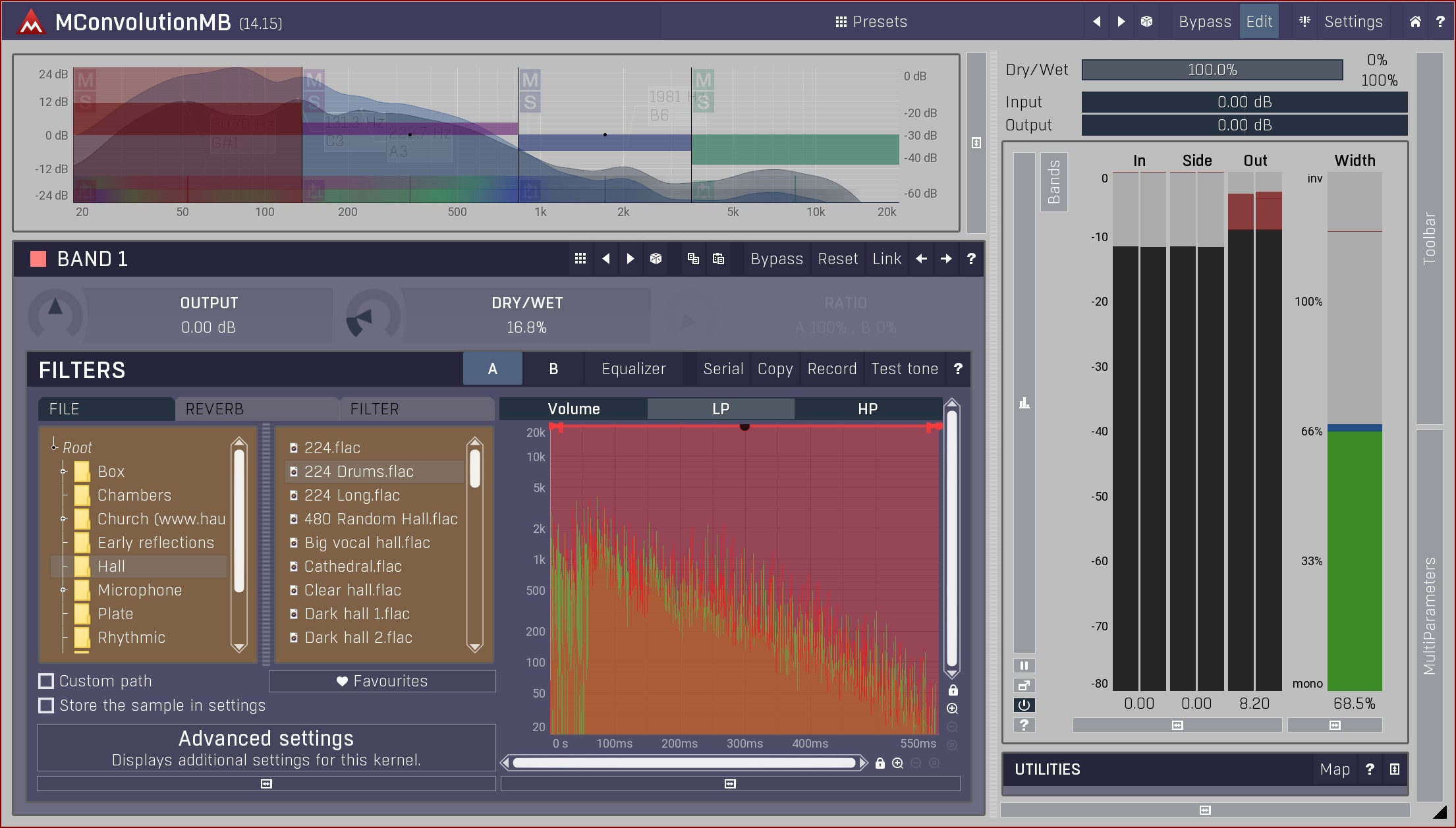 Each band can have 2 IR generators of any type (file, reverb or filter) and using a simple slider you can control the ratio between these two to create extremely realistic dynamic reverbs. By attaching the slider to one of the modulators you can easily make this process completely automatic yet extremely versatile.