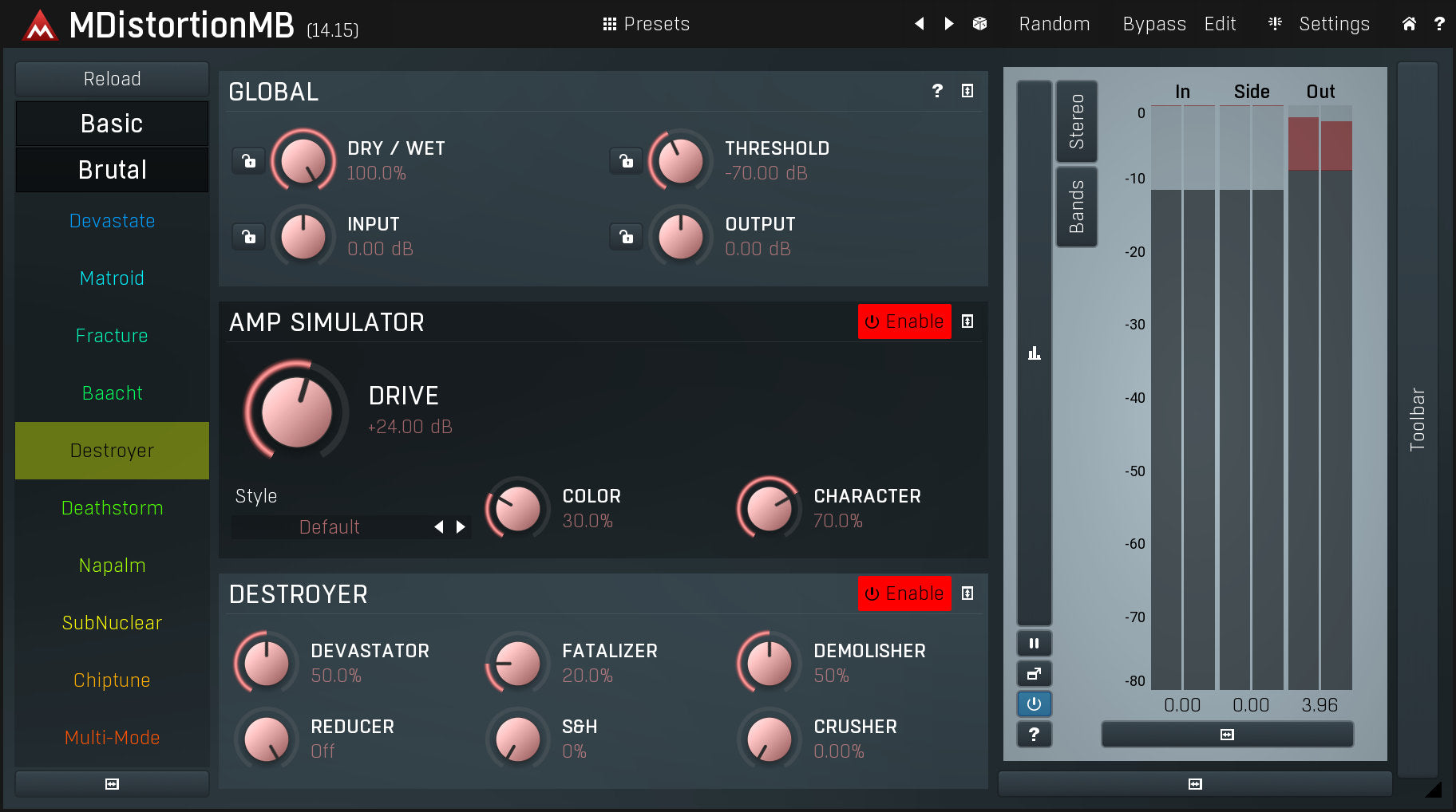 MDistortionMB is a unique distortion plugin combining a generalized amp simulator with a digital distortion processor. It combines the best from the analogue and digital worlds and is perfect for guitars, keyboards, drums or even just sound mangling.