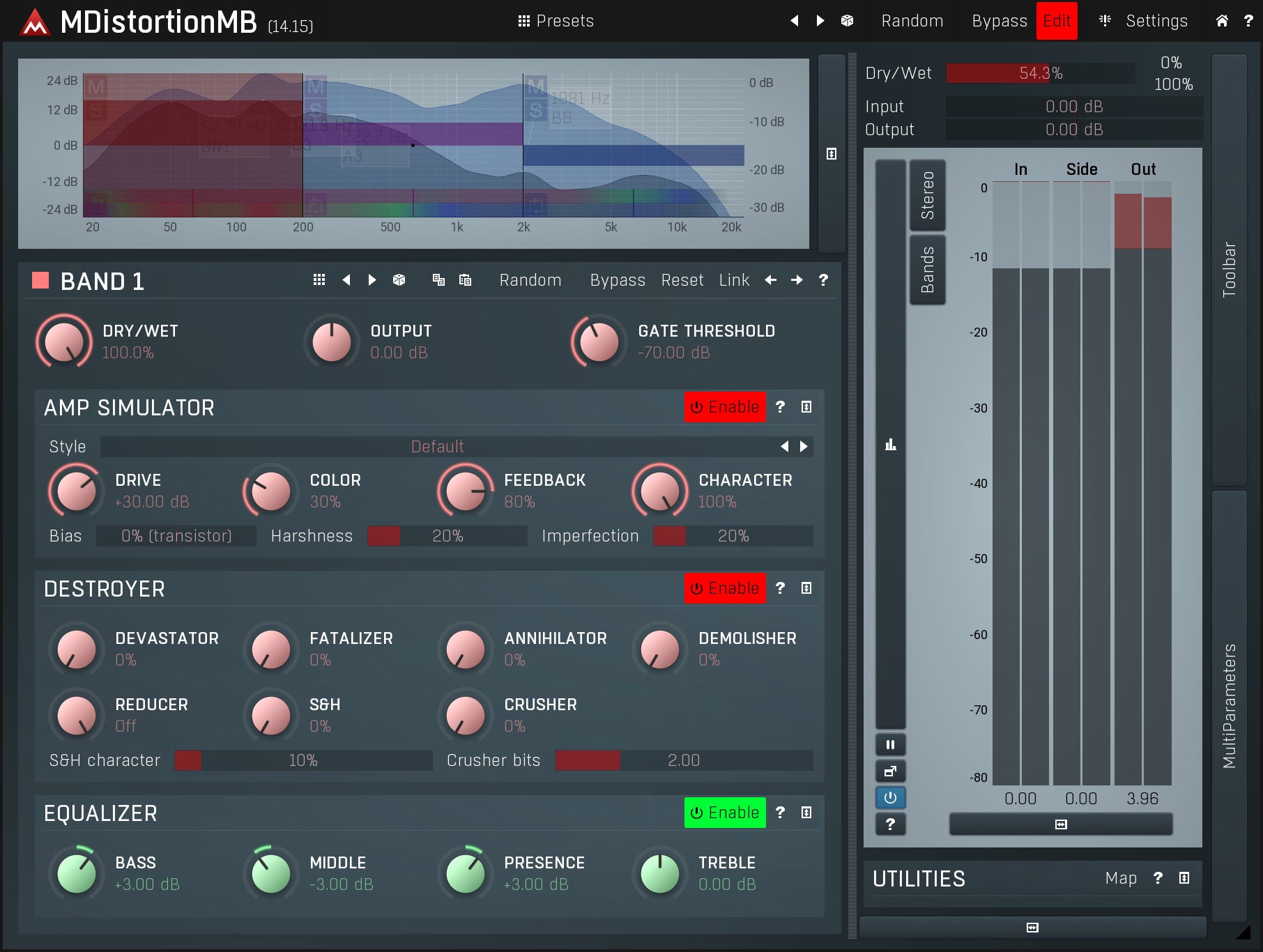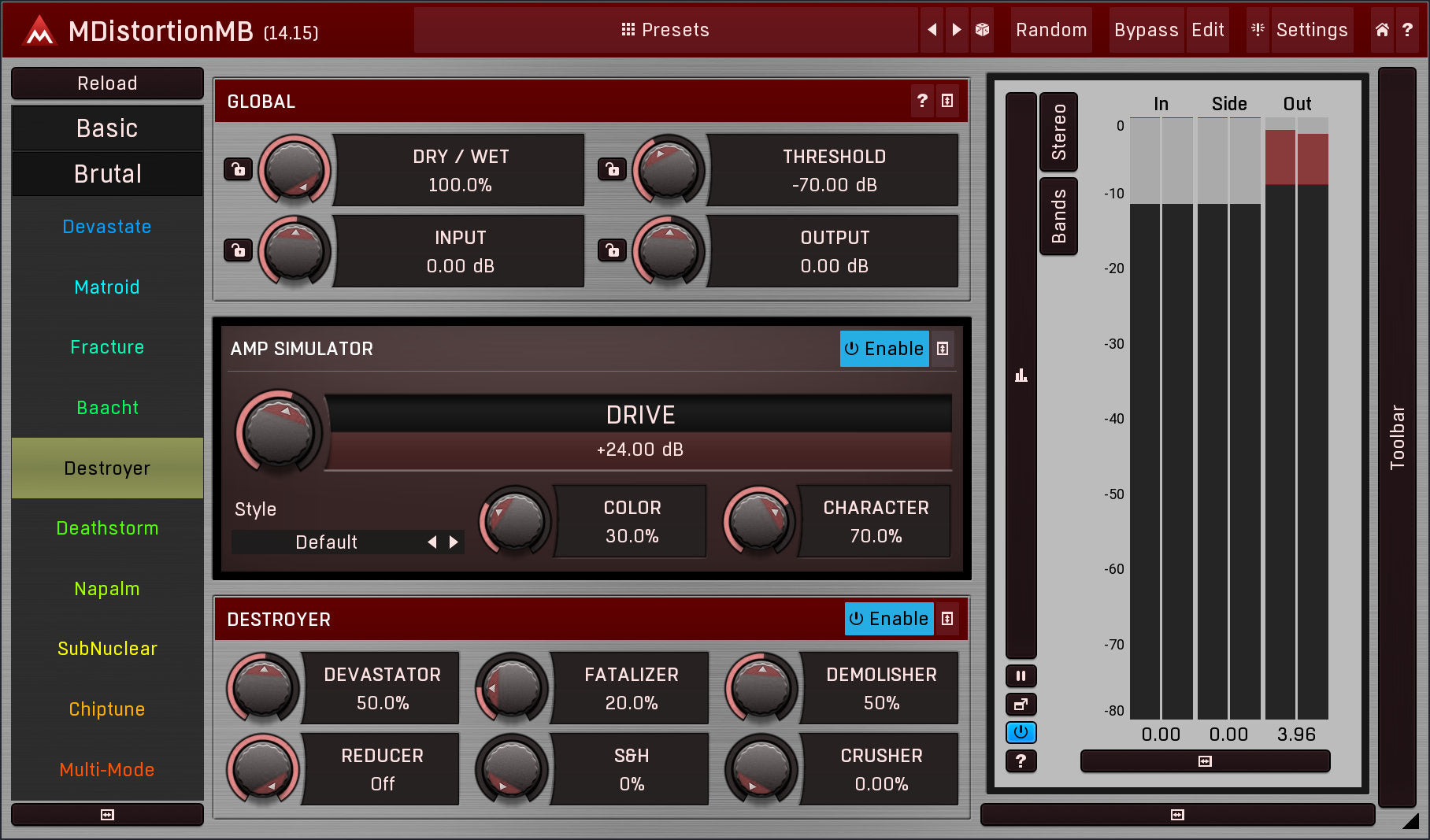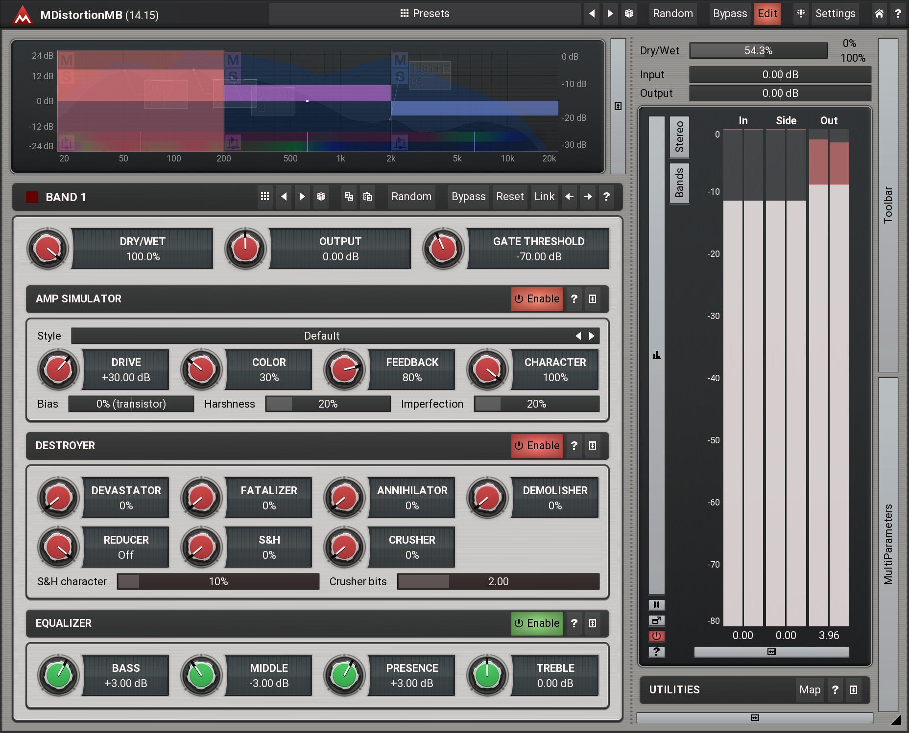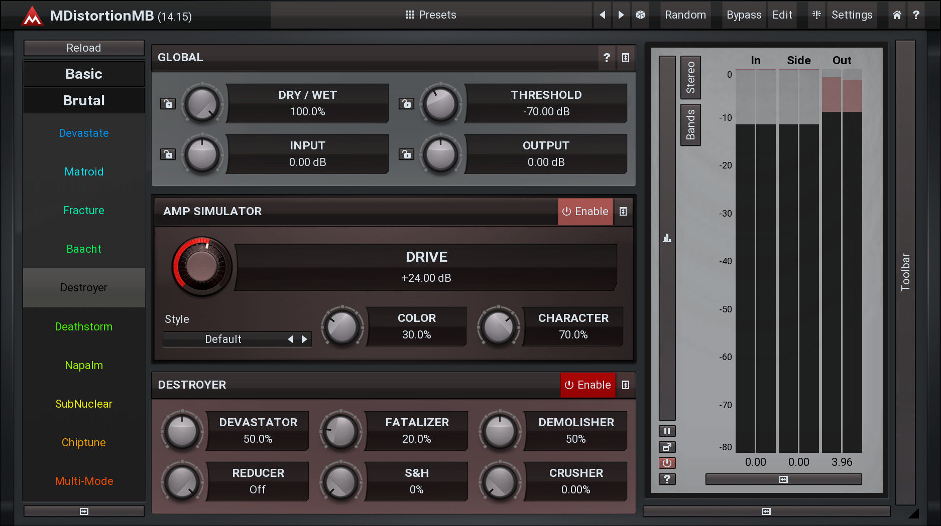 MDistortionMB implements a generalized amp simulation, rather than providing models of particular existing amps. It can simulate a whole range of amps and contains a set of 12 predefined sounds organized by styles, including metal or rock. You can customize each sound with an exhaustive set of controls and an equalizer. It may not sound like your favorite amp, but it might sound better.