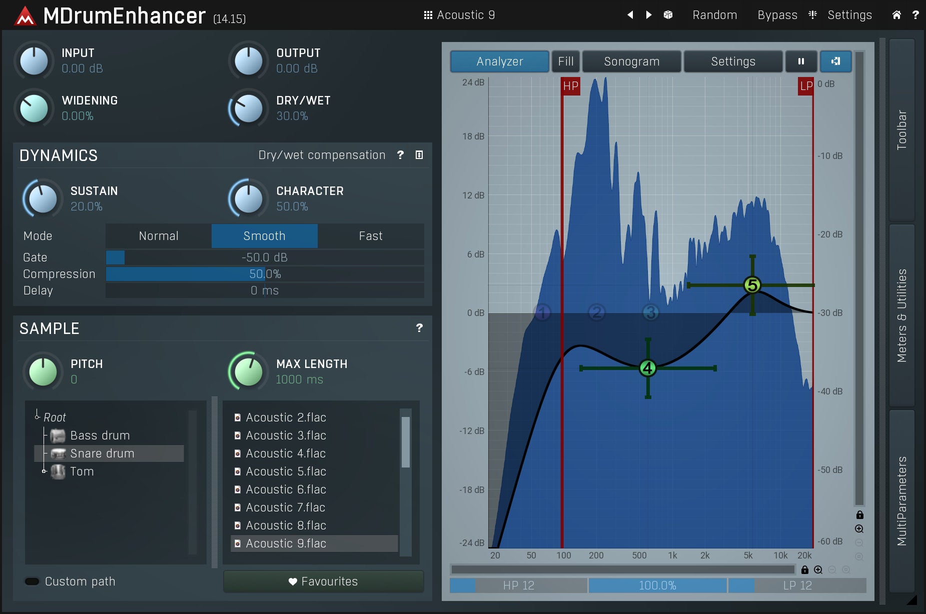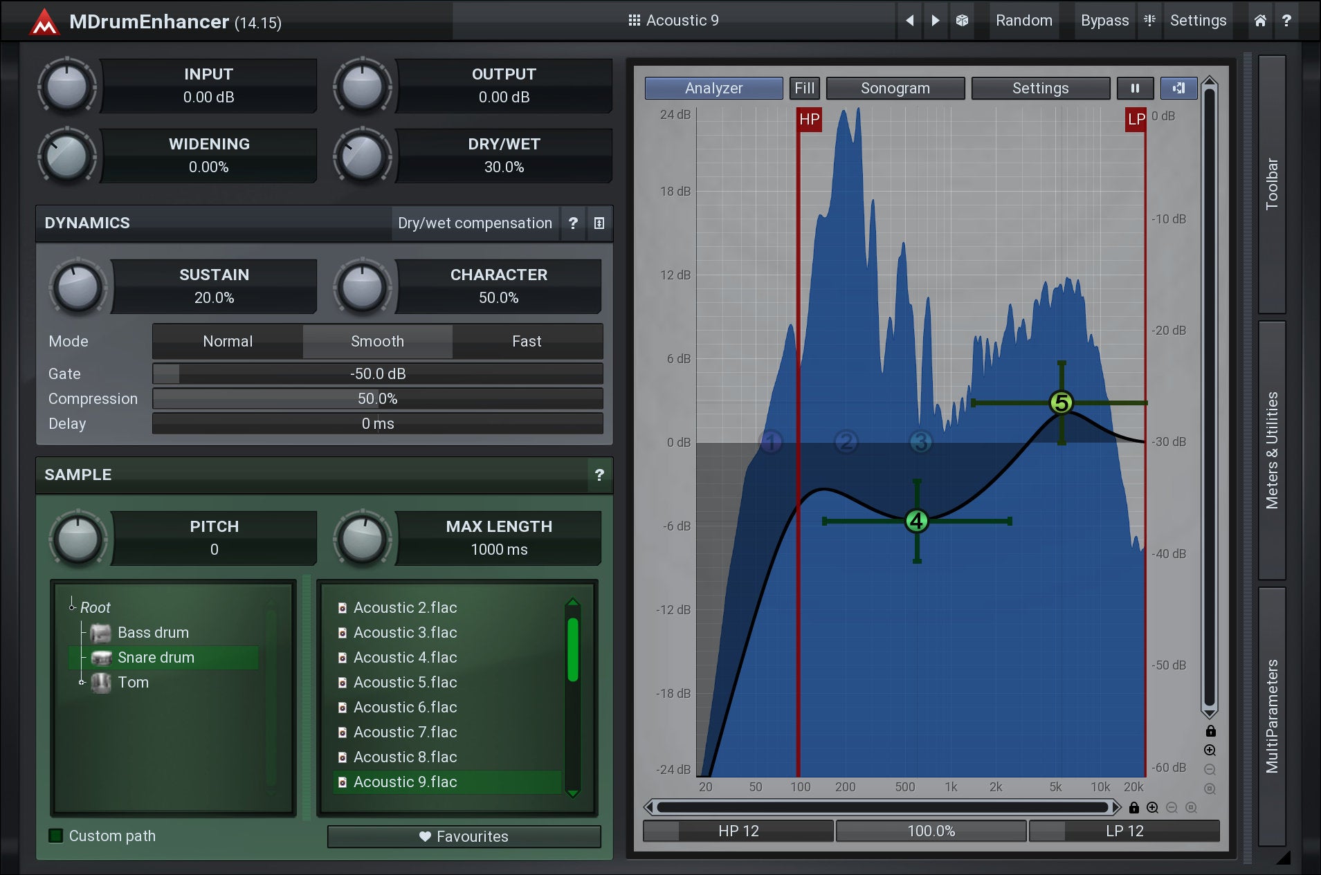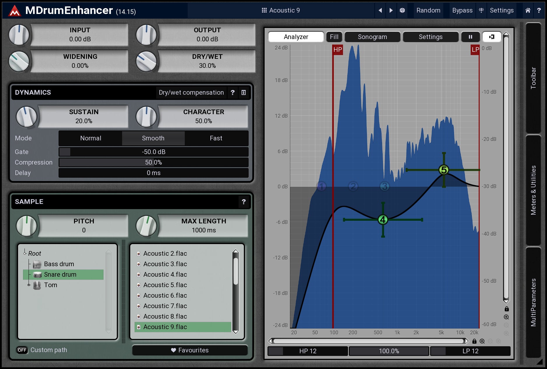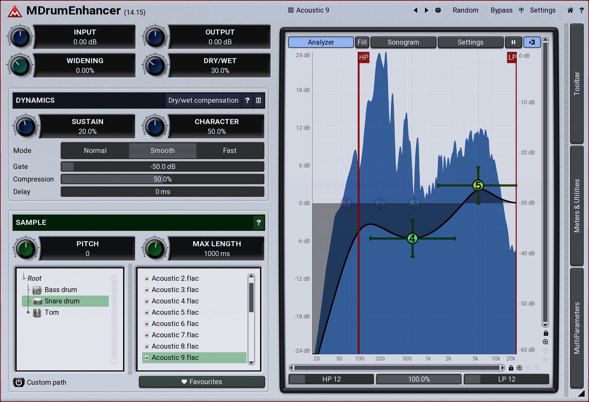 MDrumEnhancer is quite a straightforward plugin to use, but ithas enough controls to let you fine-tune it for any material. You can change the pitch of the samples to tune it to your drum track, it has a full dynamic equalizer so you can tweak the spectrum of the enhancement signal, sustain control lets you make the drum hits shorter but also longer than they actually are and even provide cool reverberation.