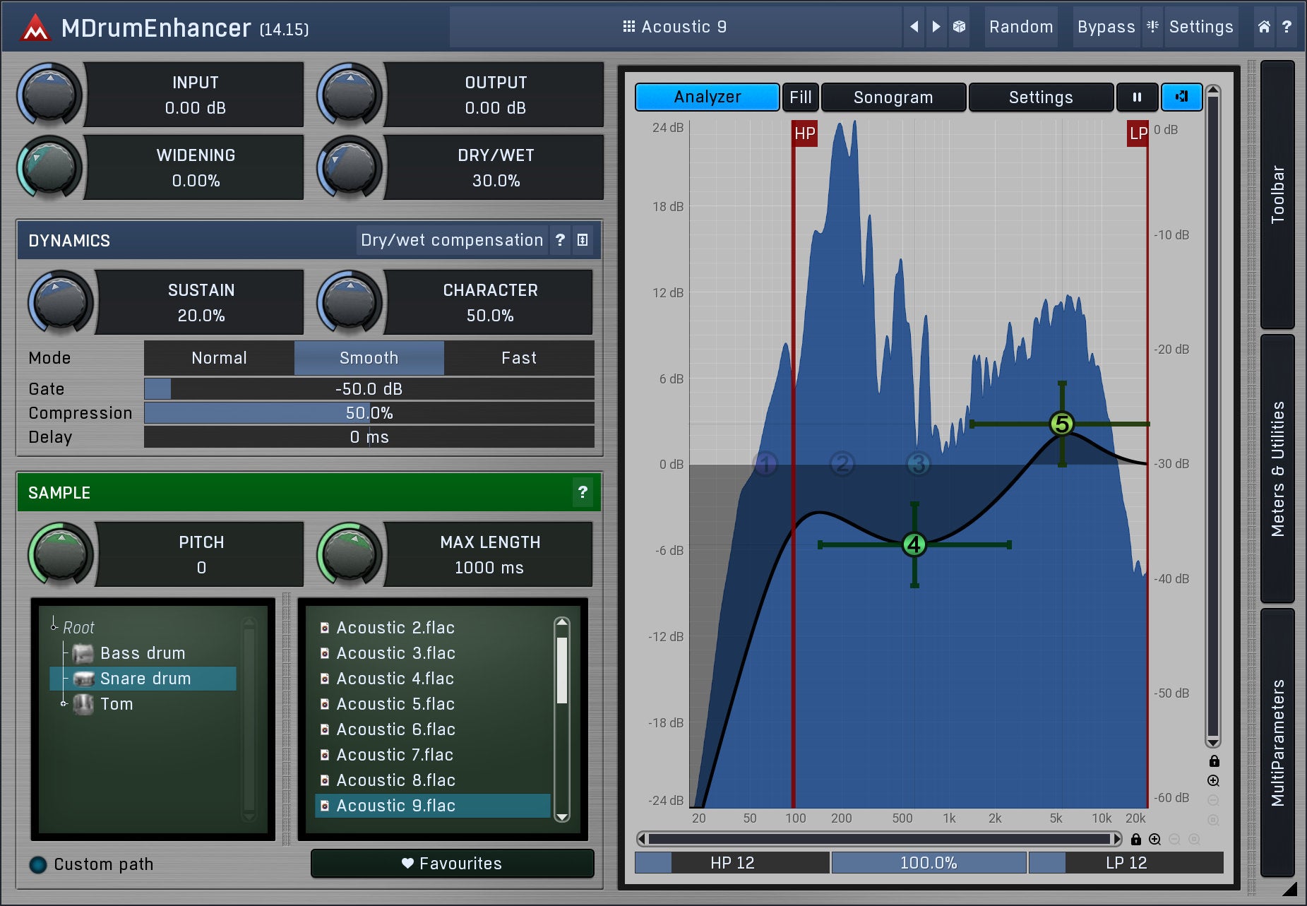 MDrumEnhancer is a unique tool that follows your drum track and synthesizes its own additional signal using samples to make it sound big and phat, without any of the problems that arise from traditional drum replacement. Add snare noises, improve bass drum's boom or snap, or even resynthesize the sound completely.