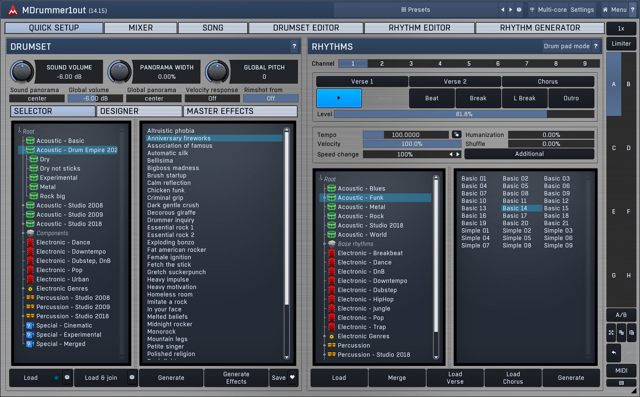 MDrummer truly understands what a rhythm is in the same way that humans do and you have access to everything it knows. It can cover any style and any percussive instrument. MDrummer can play pop, drum'n'bass, rock, r'n'b, salsa, jungle, jazz, rumba on congas, progress-metal in 11/4 signature... anything you can imagine. MDrummer can generate new rhythms for you, merge multiple rhythms, add shakers and other background percussion. Humanization, shuffling, half/double tempo & feel and many more advanced features let you transform your ideas into reality with a few mouse clicks.