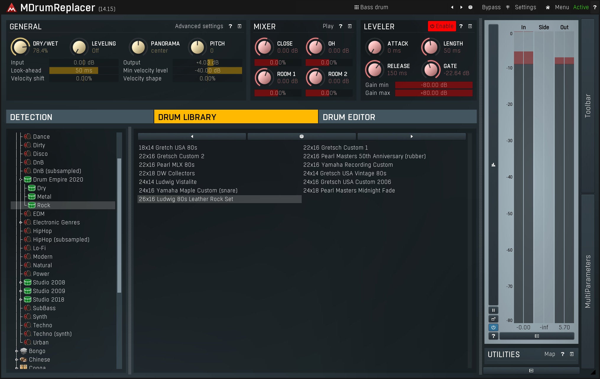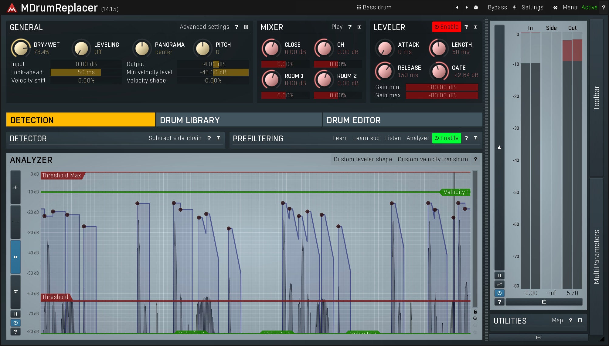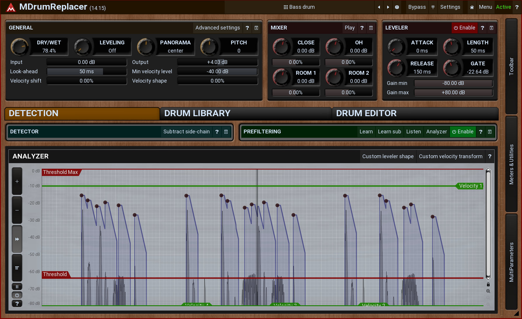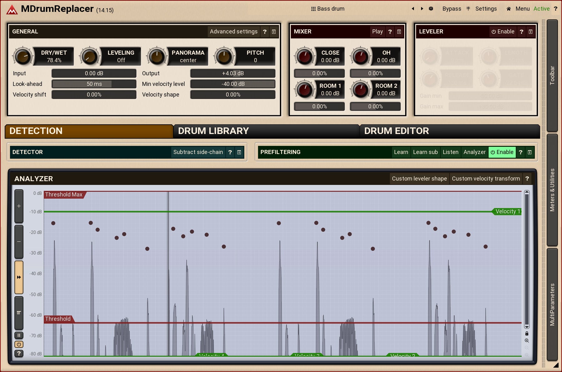 MDrumReplacer basically includes the whole MDrumLeveler plugin. Therefore you may successfully use MDrumReplacer not just for replacing „bad hits“ but also to iron the drummer‘s performance. Just let the detector find an event and compute its correct level. The processor applies the requested gain to the event. Your drummer will seem to have a firm hand and solid performance.