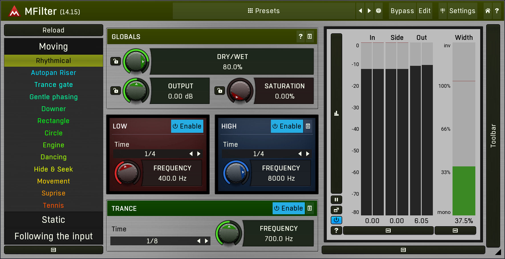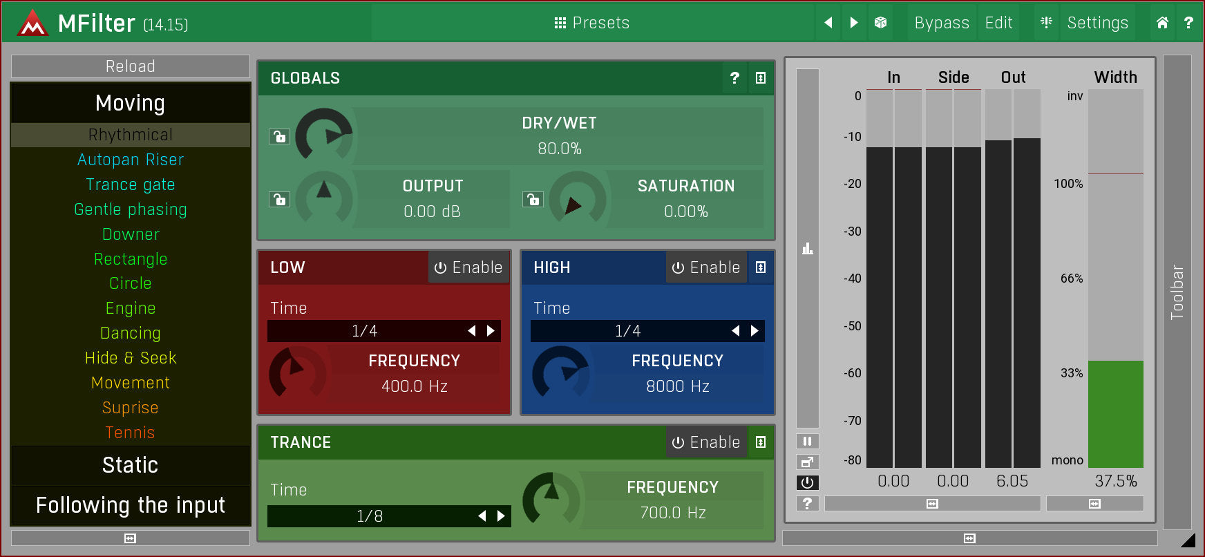 Whenever you need to add some movement to an otherwise static sound, a filter is one of the first processors to try. MFilter can probably do more than you could imagine a filter would be capable of.