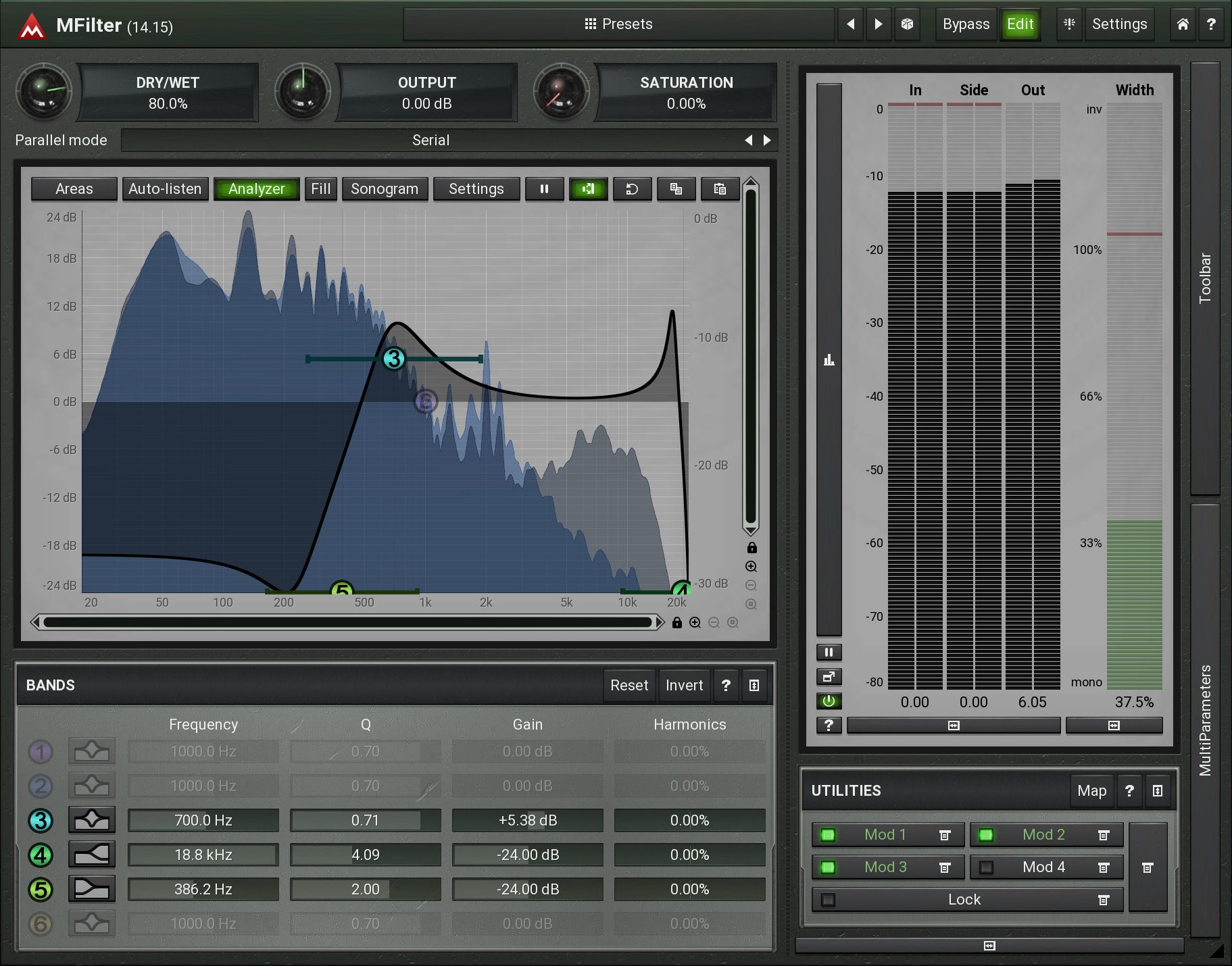 Most filters are just simple parametric equalizers, they just don't tell you that. MFilter doesn't pretend. See exactly what it does right away. Toss in 4 modulators and the only limit is your imagination.