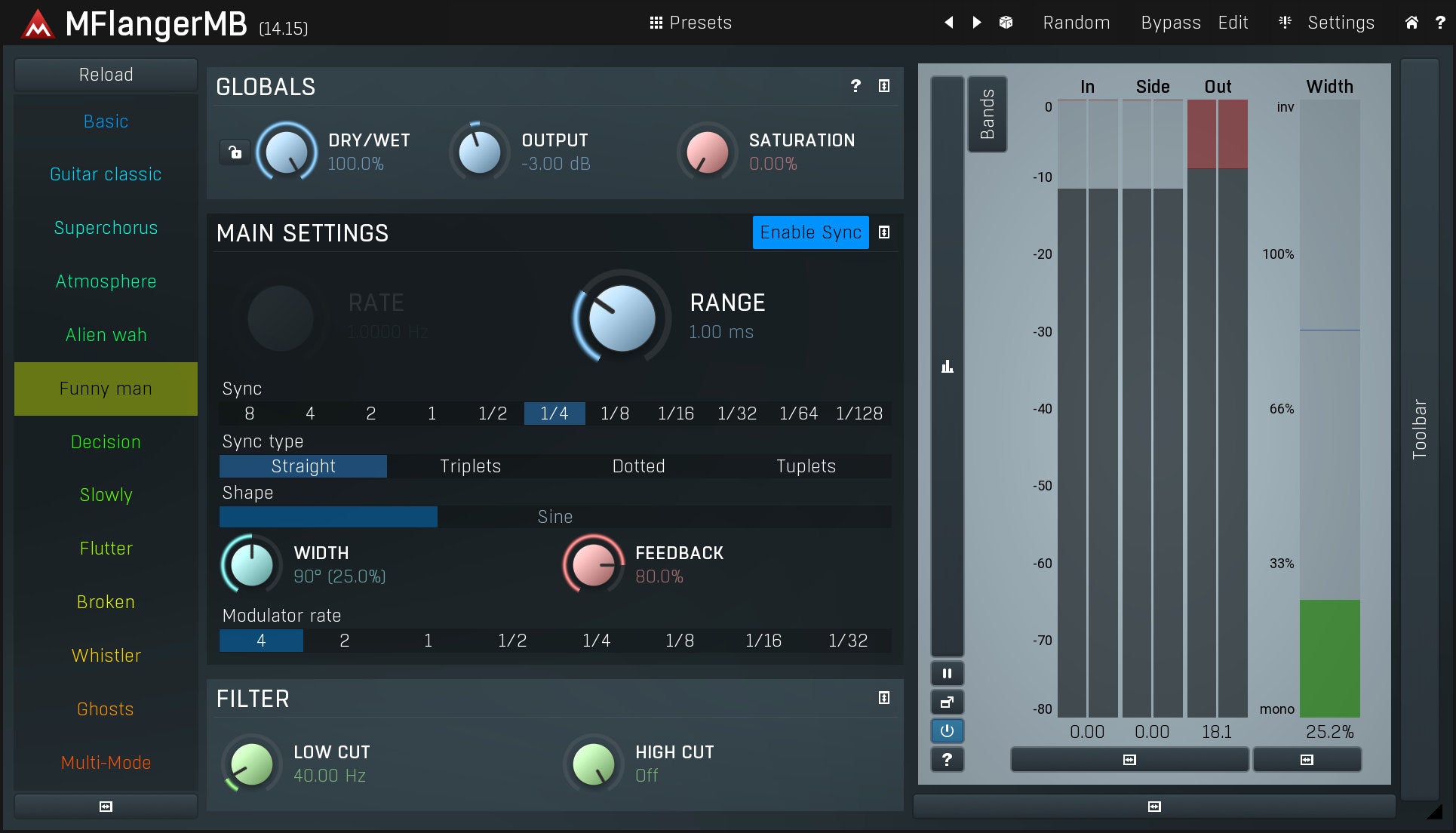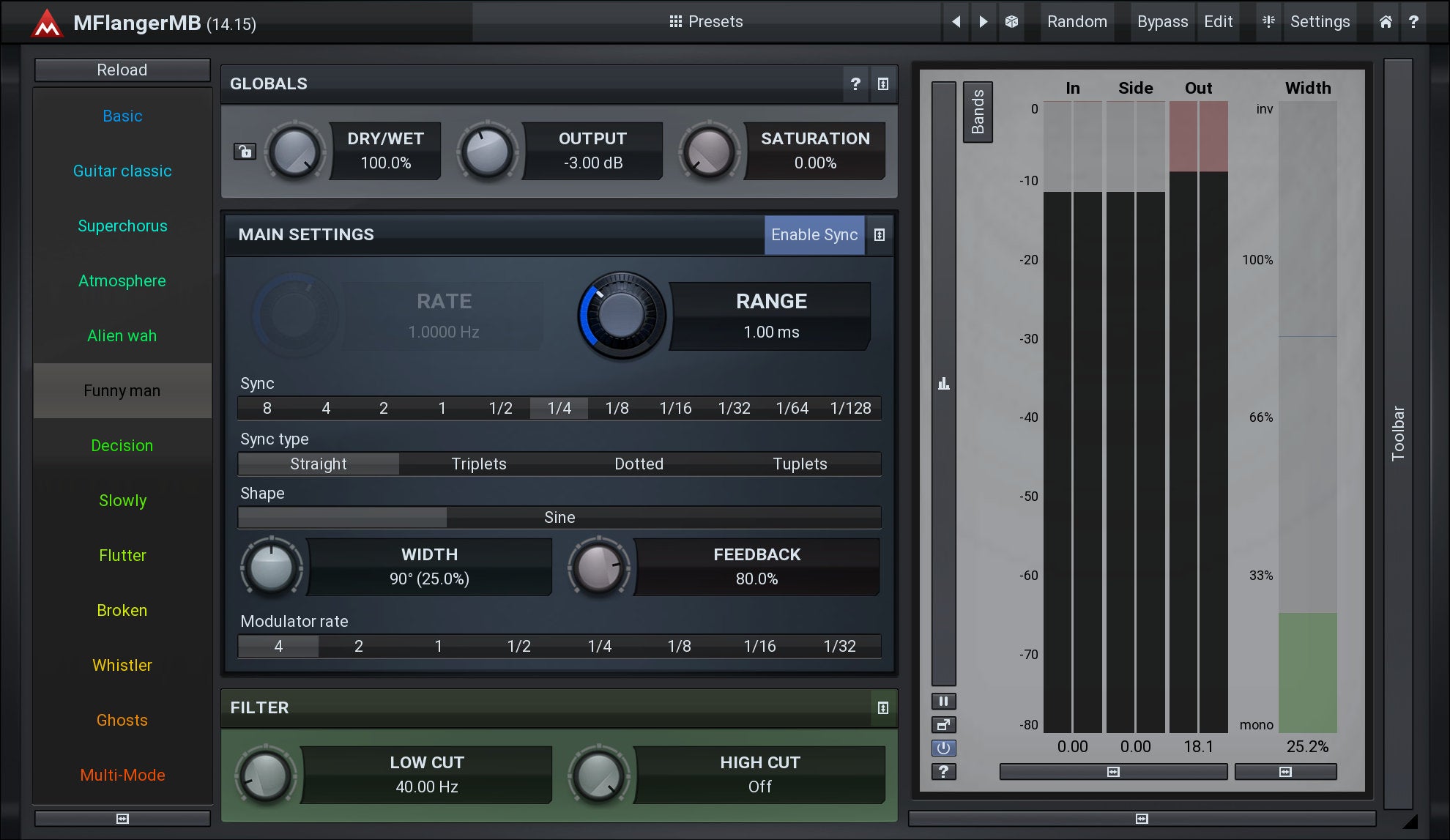 Flangers are tools with a specific character and are indispensable for guitars, and a wide range of other instruments. MFlangerMB is the top class representative, which will beat every other flanger on the market in terms of both audio quality and features.