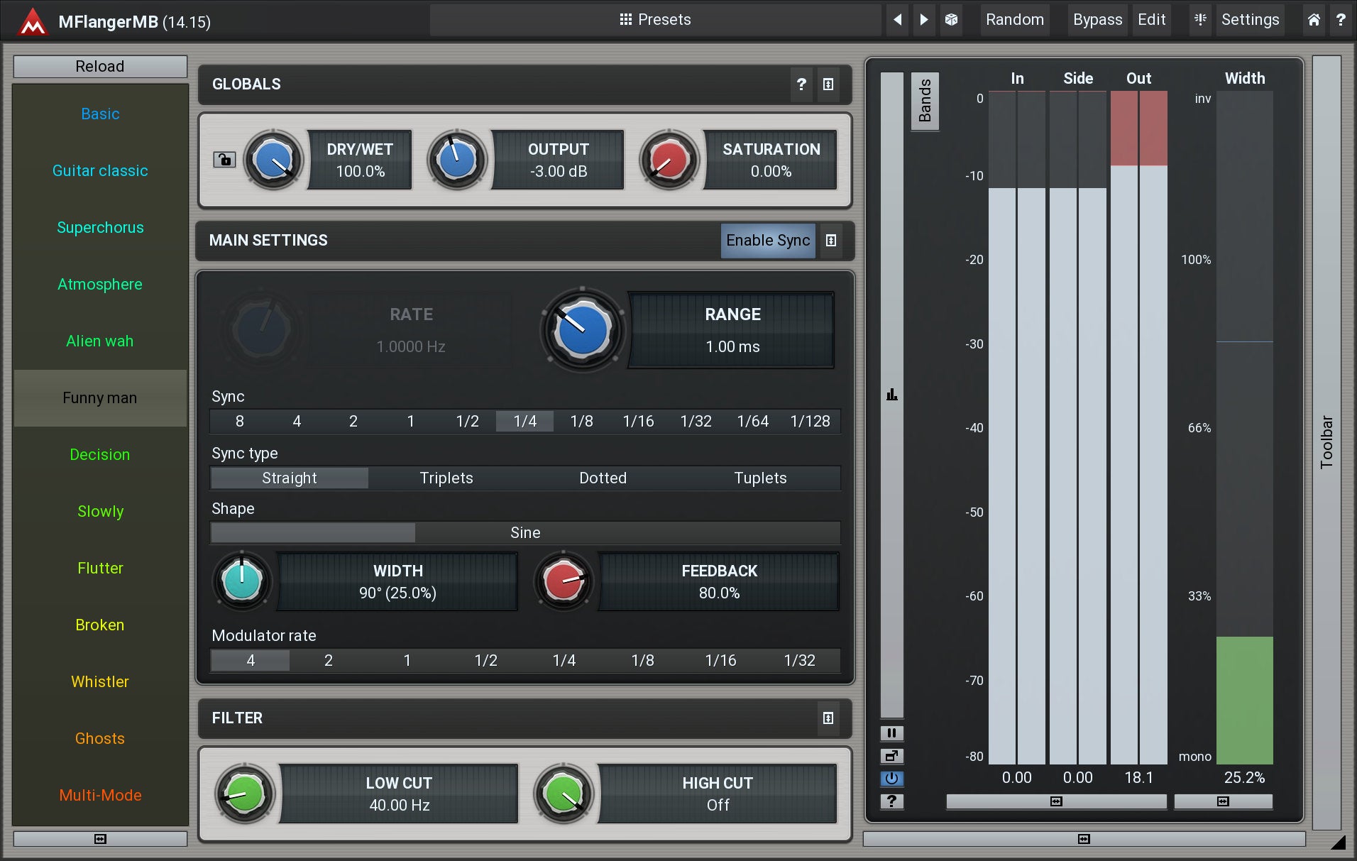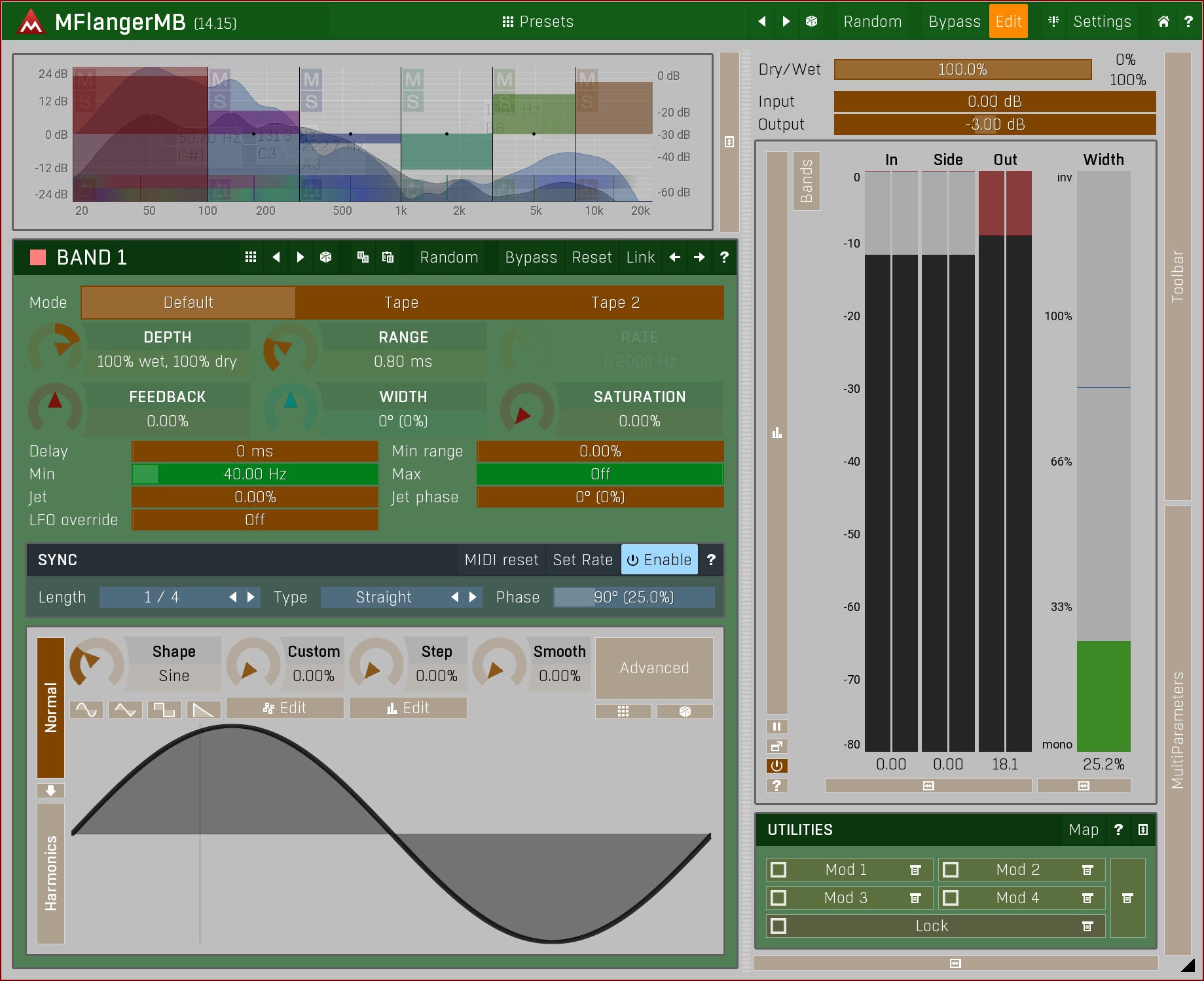 MFlangerMB features up to 16x upsampling, sinc-interpolation, analog-style saturation and other features. The results will satisfy everyone searching for the maximum audio quality.