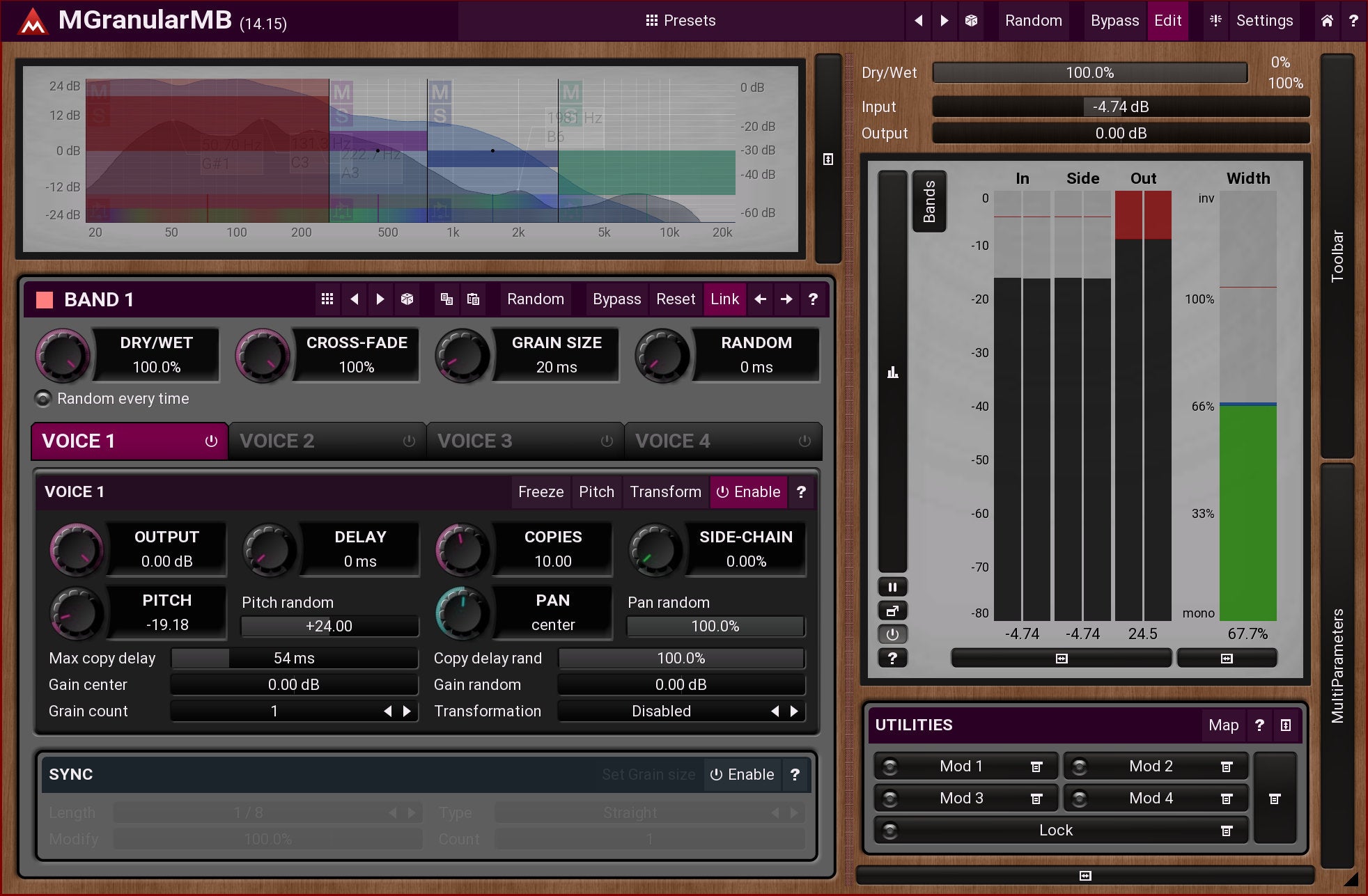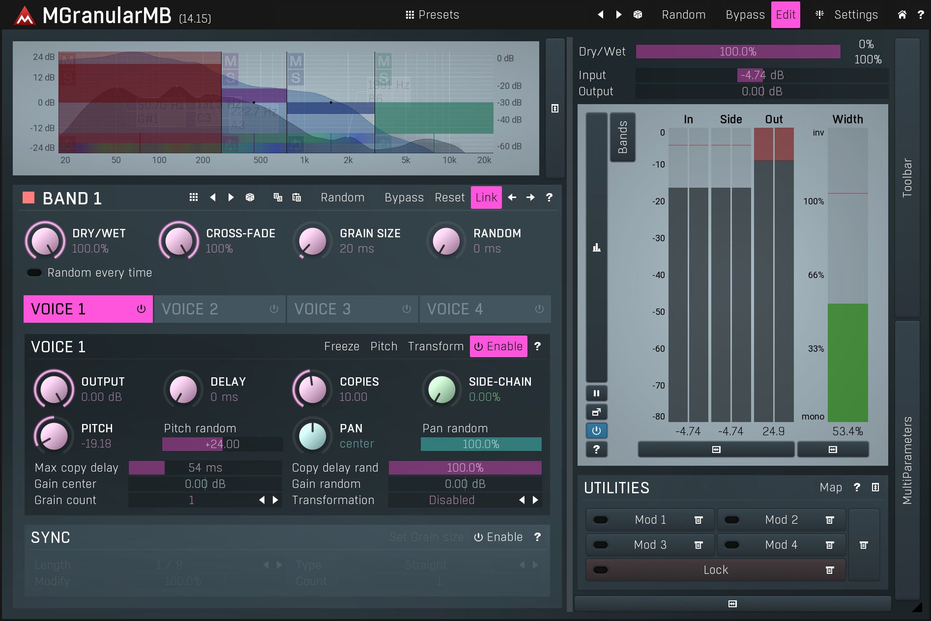 Panorama and pitch shifting is common with granular resynthesizers, but we go further. Graph based transformations, pitch adjustment of each grain to harmonise, and up to 20 layers at once create a true grain cloud, all of it in up to 6 frequency bands. And that's just the beginning.