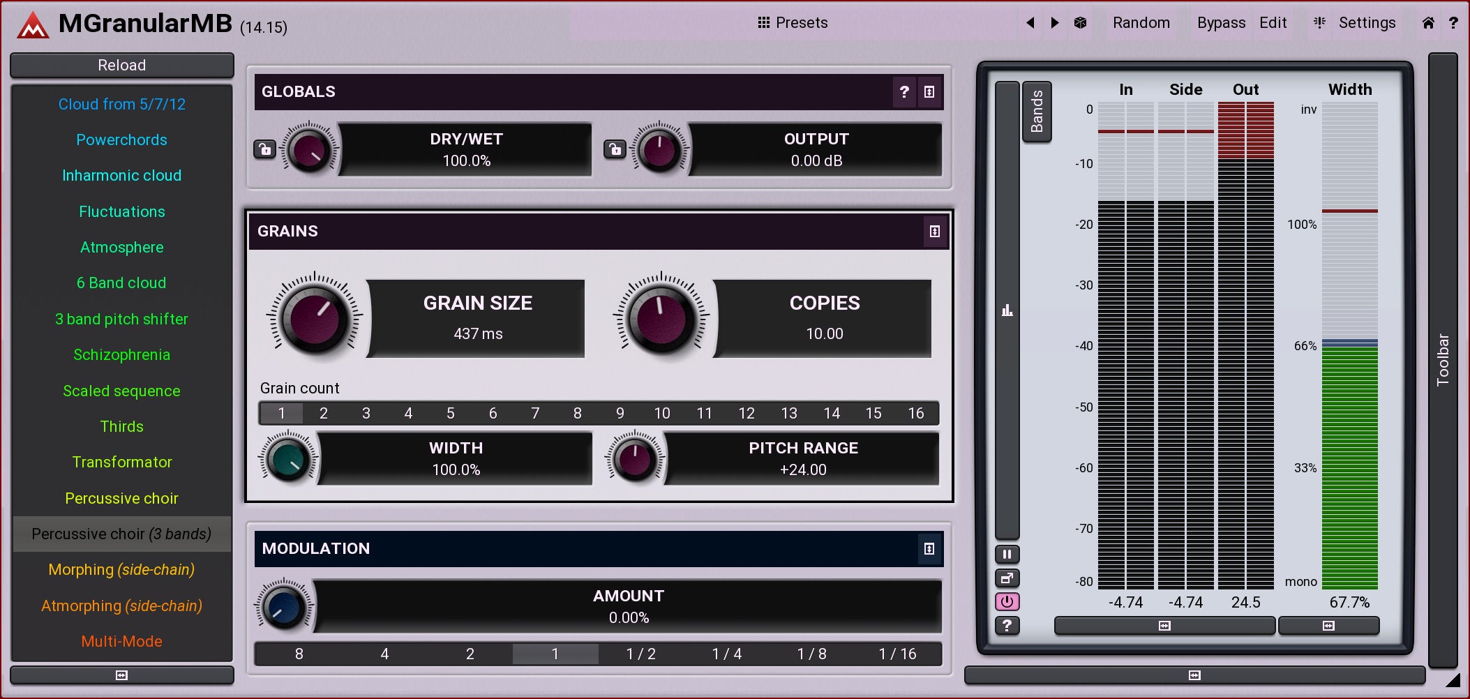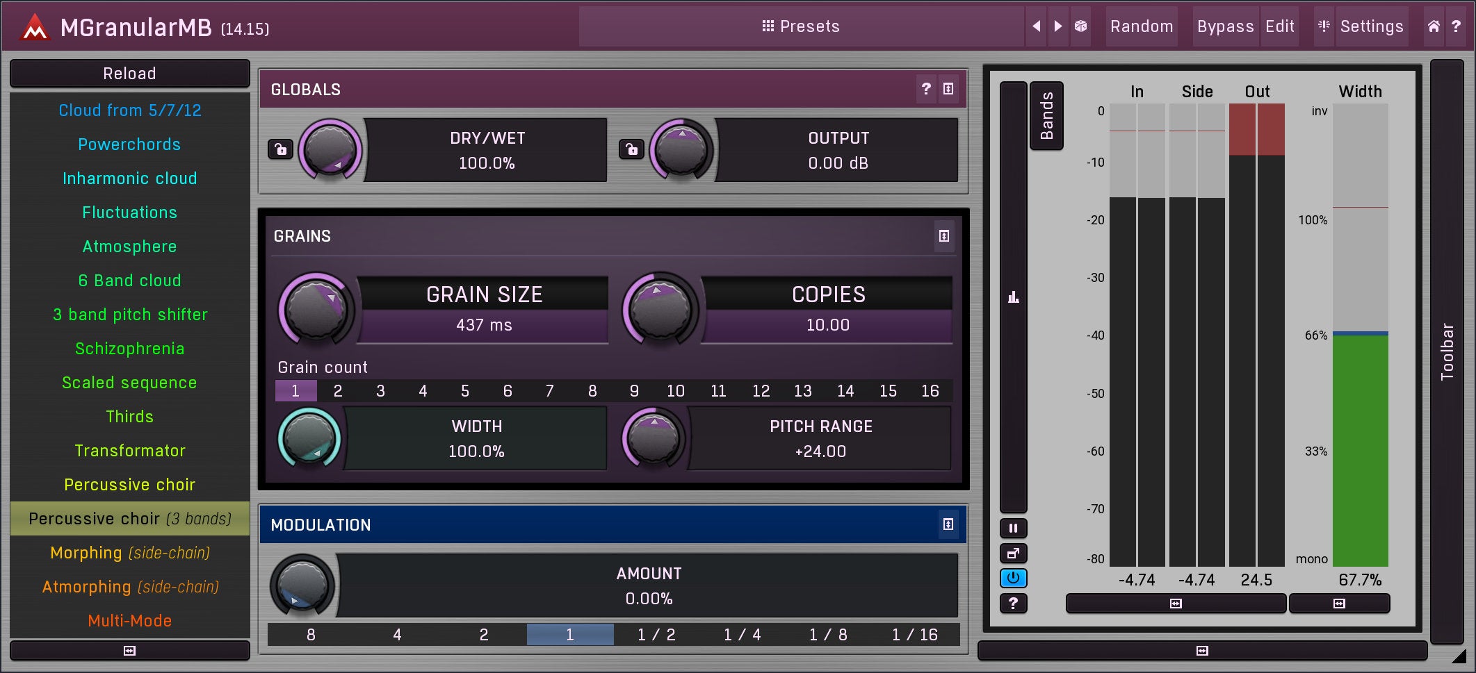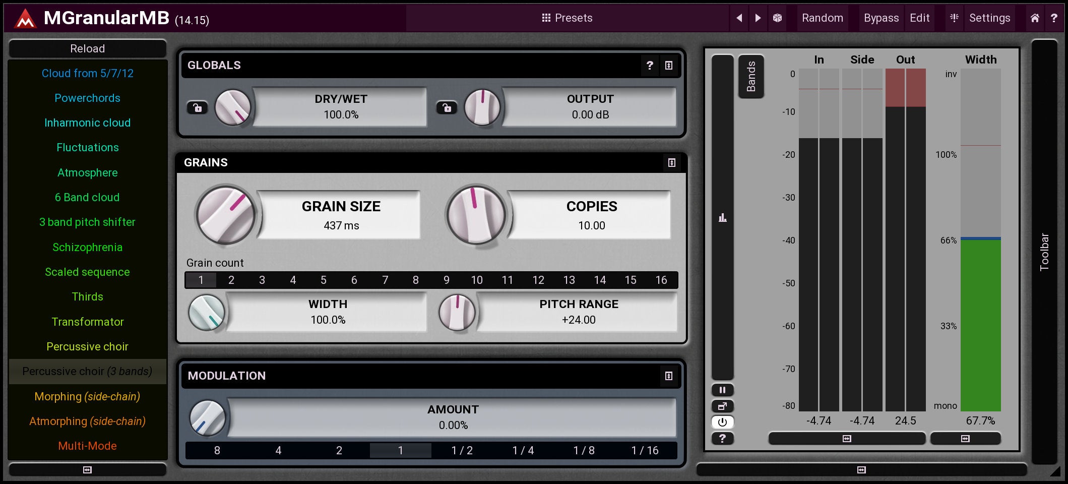 MGranularMB is an extremely versatile granular resynthesizer, which can make your lead sound like a pad, make your drums more powerful and much more. The plugin cuts your audio material into small pieces ("grains") and creates an entirely new sound from them. In multiple bands of course.