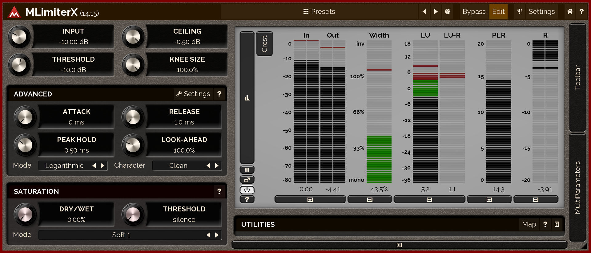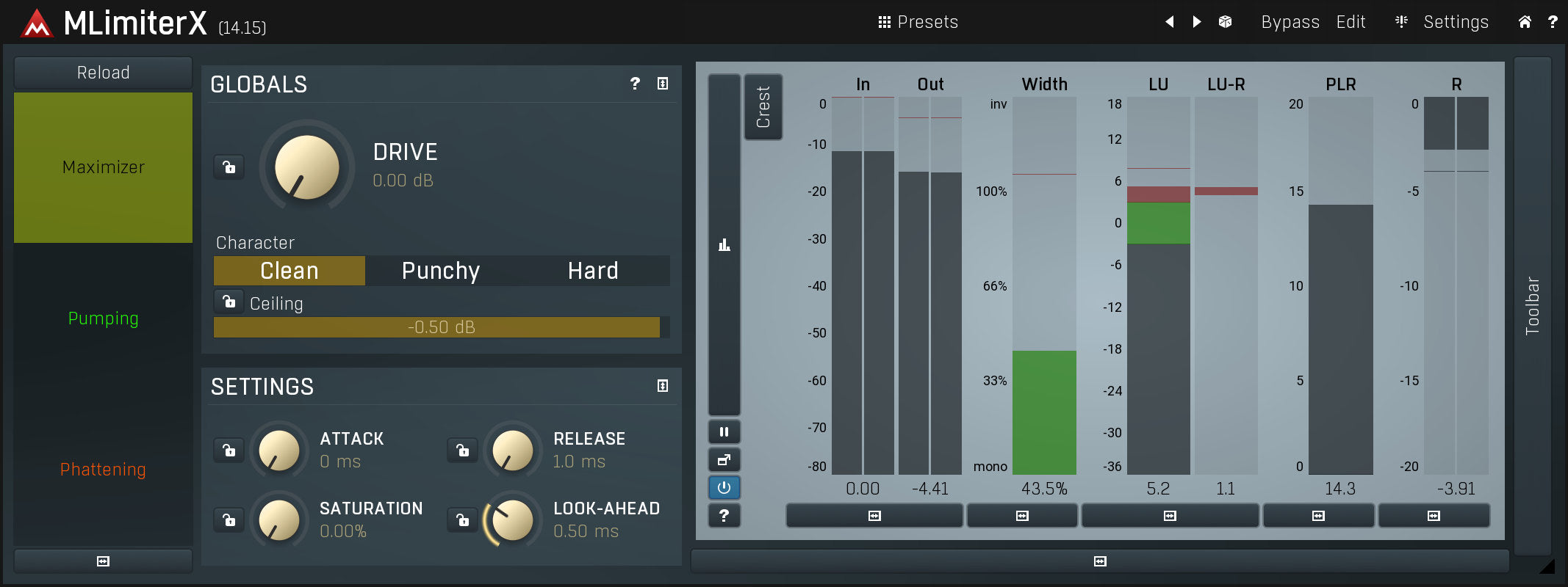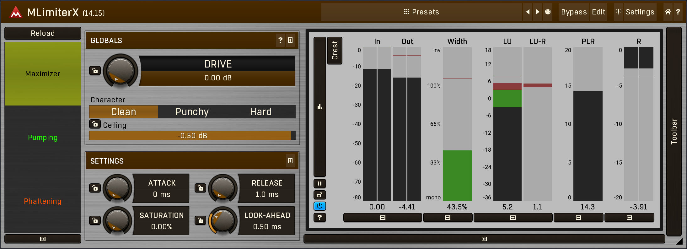 MLimiterX features our magnificent saturation system, which can give a pleasant analogue character to your music and even make it louder!