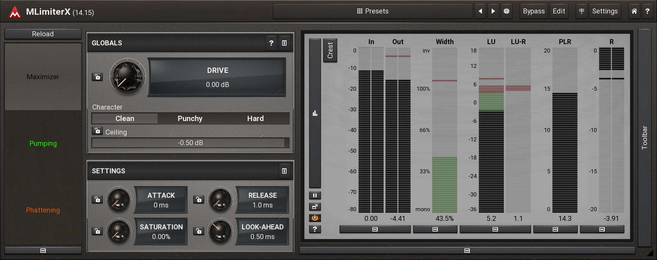 A limiter is an essential tool for every mixing and mastering engineer. If you are looking for the big guns that can make your recordings sound louder while keeping transparency, but add character if you ask for it, MLimiterX is the weapon for you!