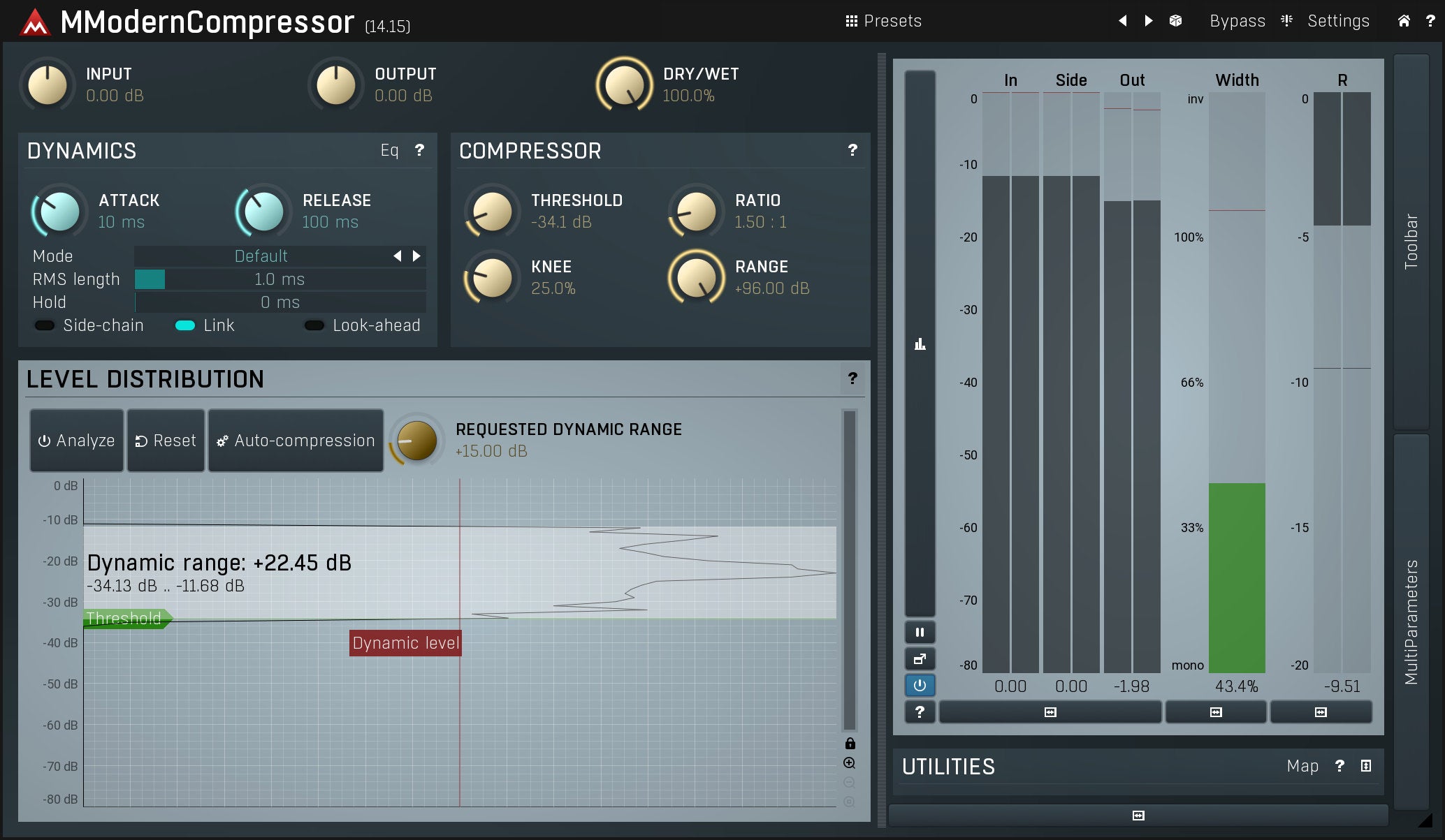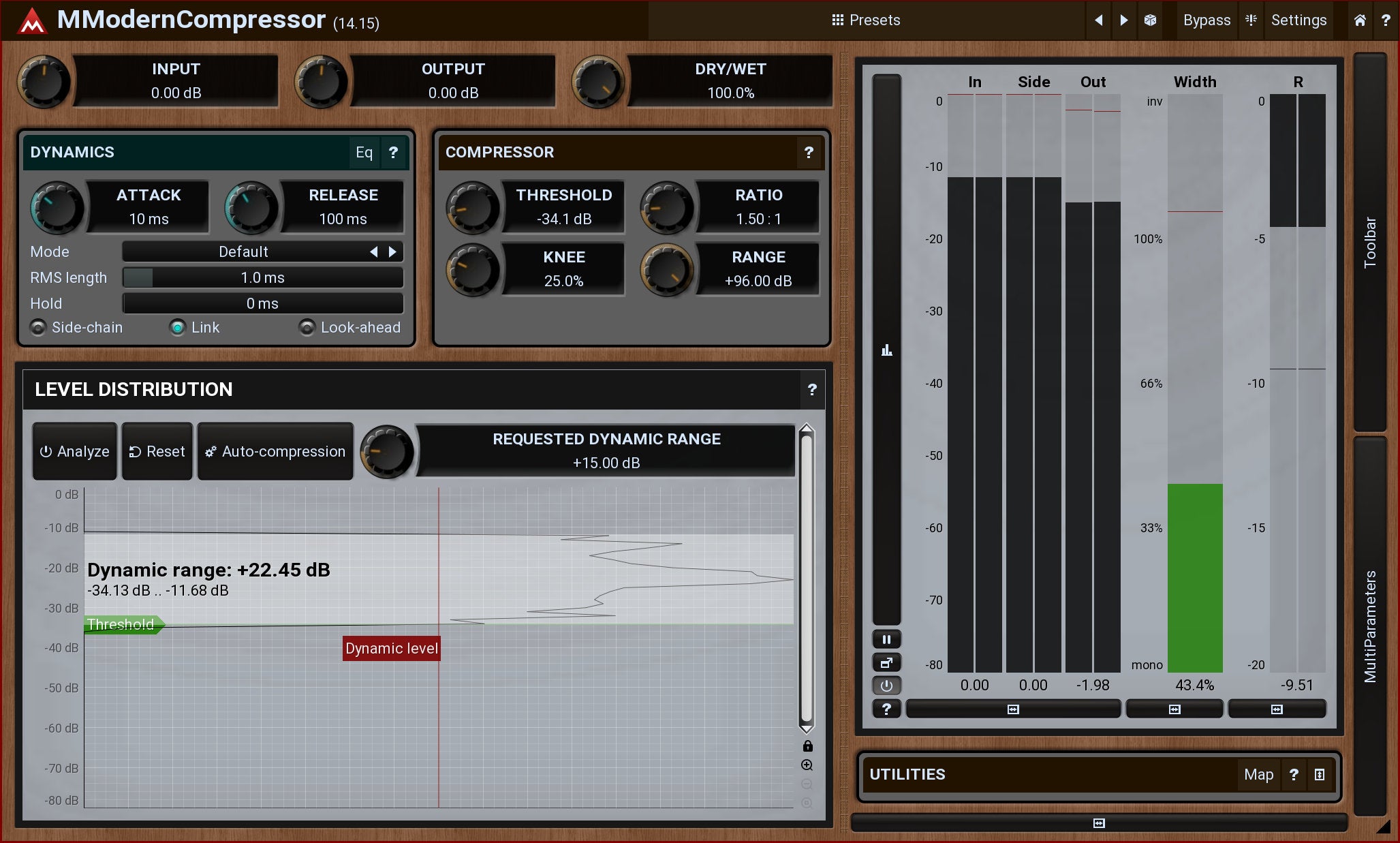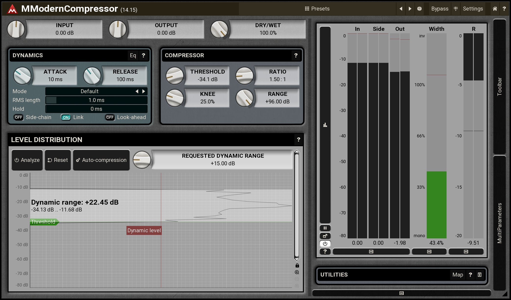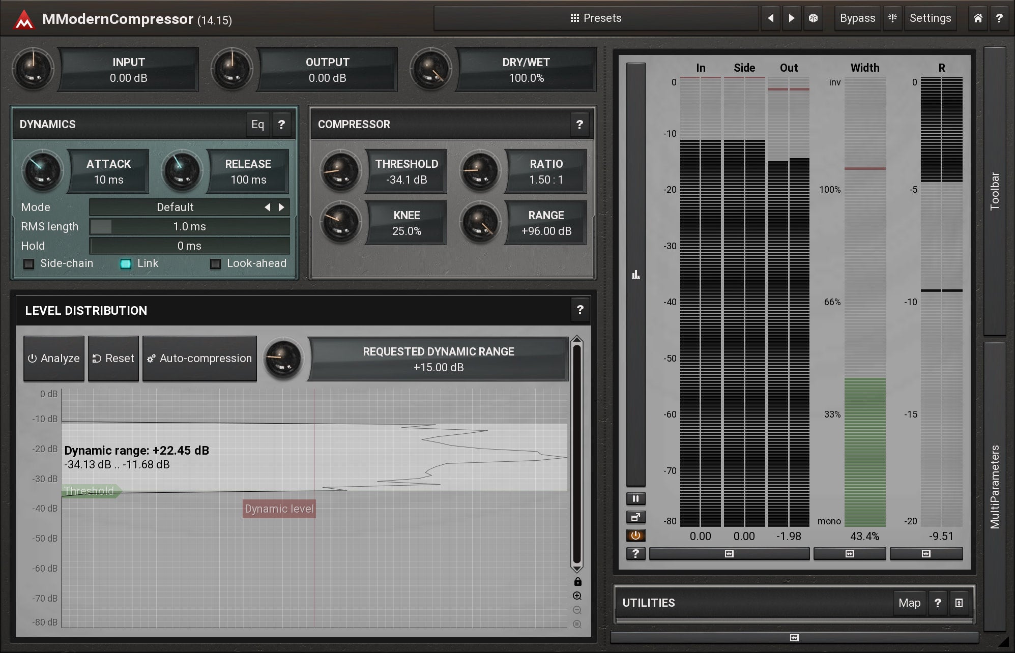 MModernCompressor of course provides the typical control parameters, gain reduction, output peak and loudness values, but it also shows a level distribution graph, from which the plugin can analyse the signal and actually setup compressor parameters automatically.
