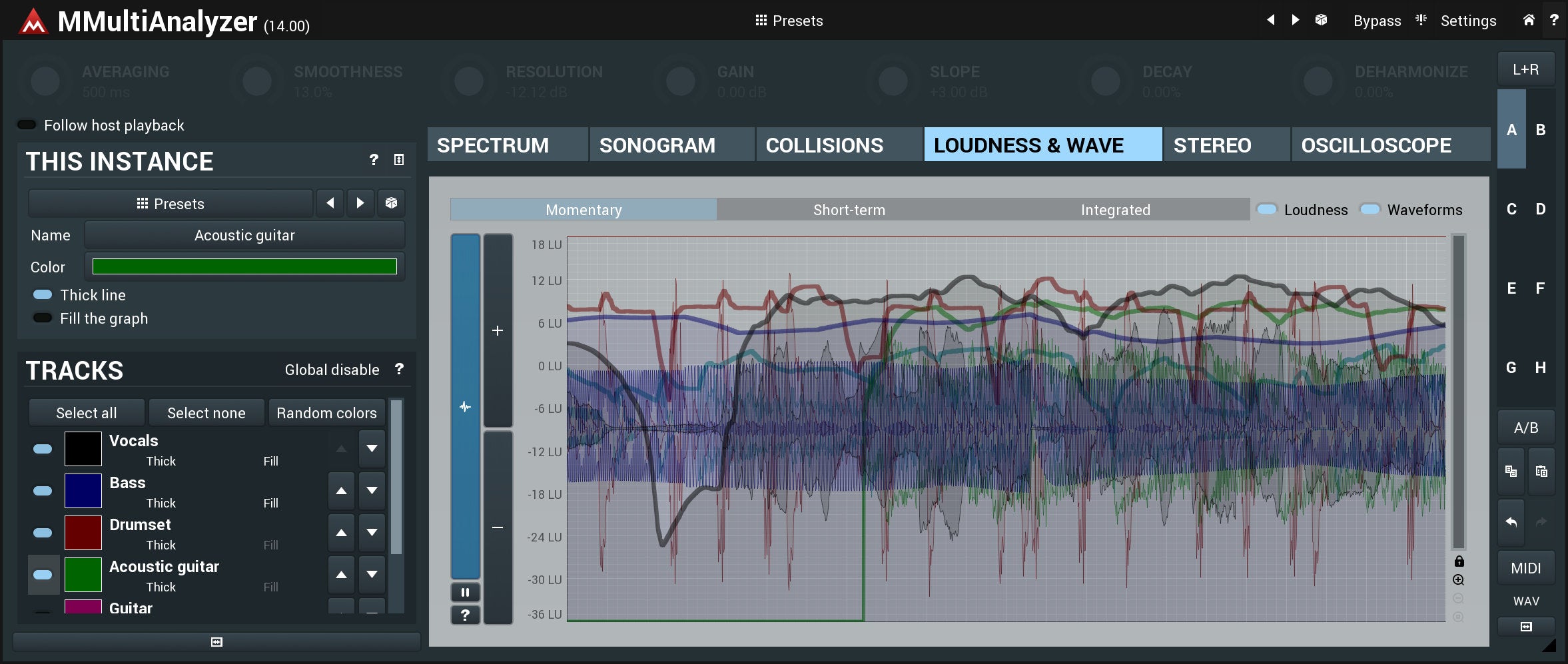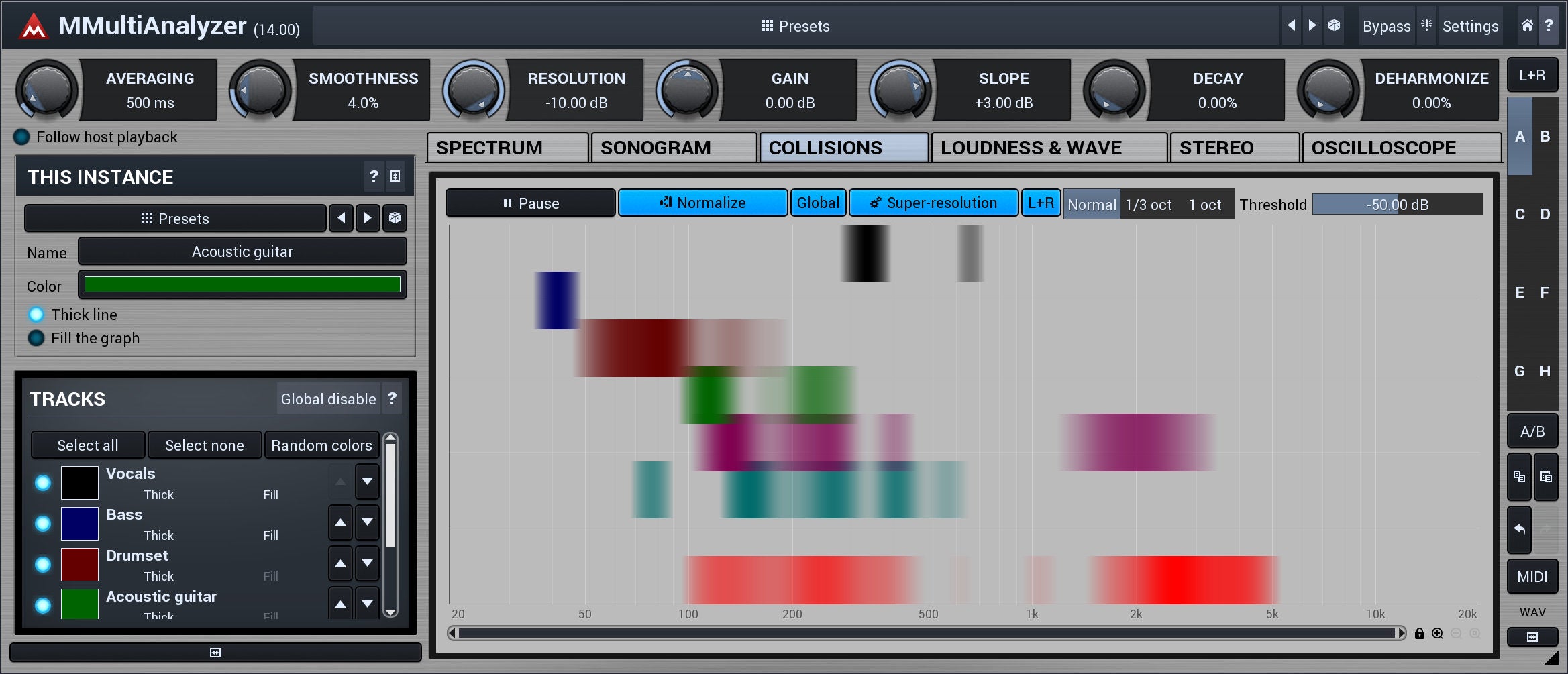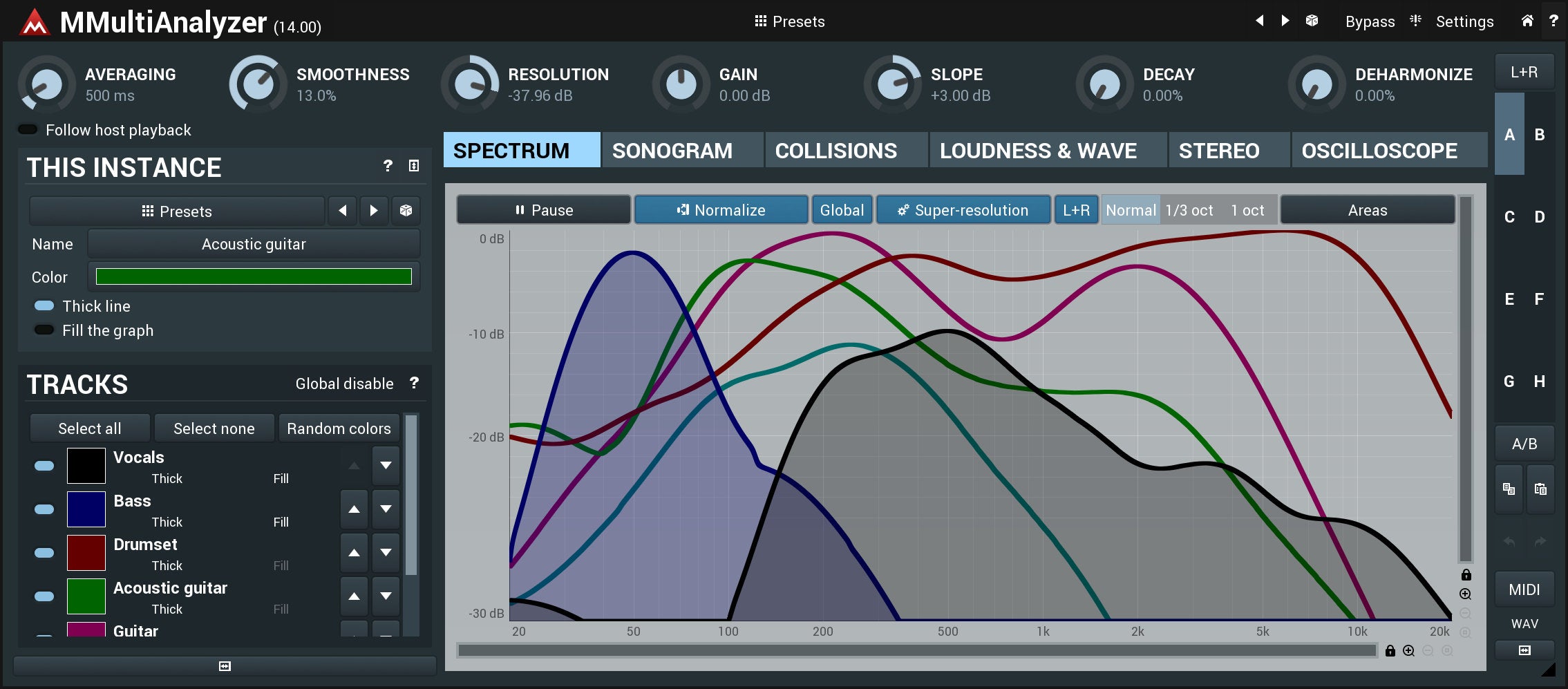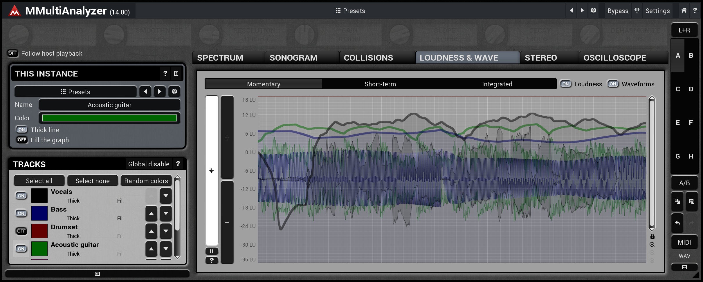 MMultiAnalyzer is a unique multi-track spectrum, loudness and stereo analyzer and sonogram, which reveals problems and frequency collisions quickly, easily, and with astonishing accuracy. Just put an instance on each track in which you are interested and they automatically find each other and exchange their respective analyses.