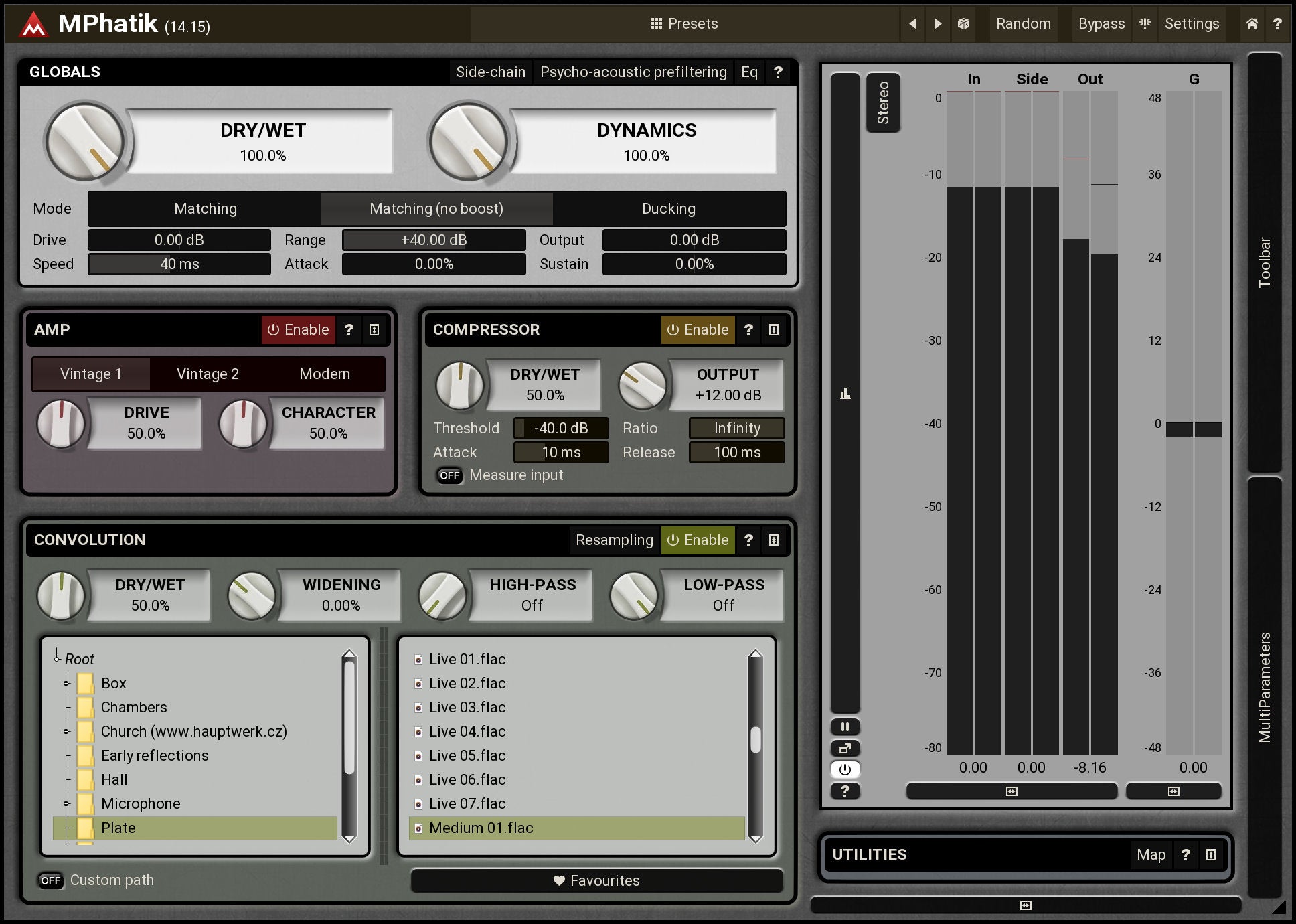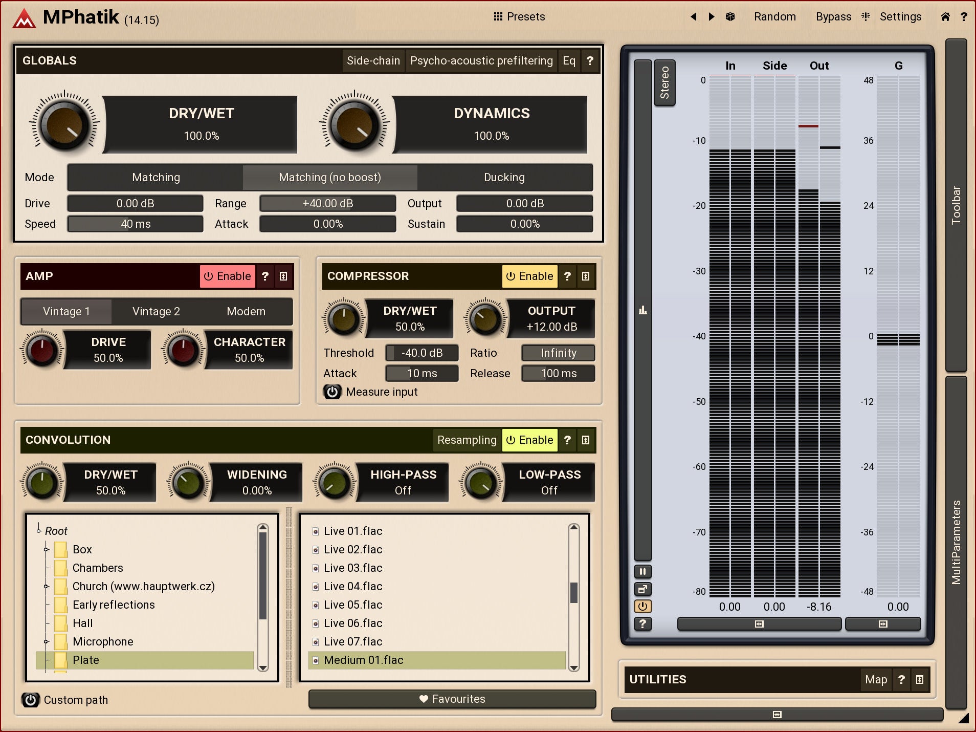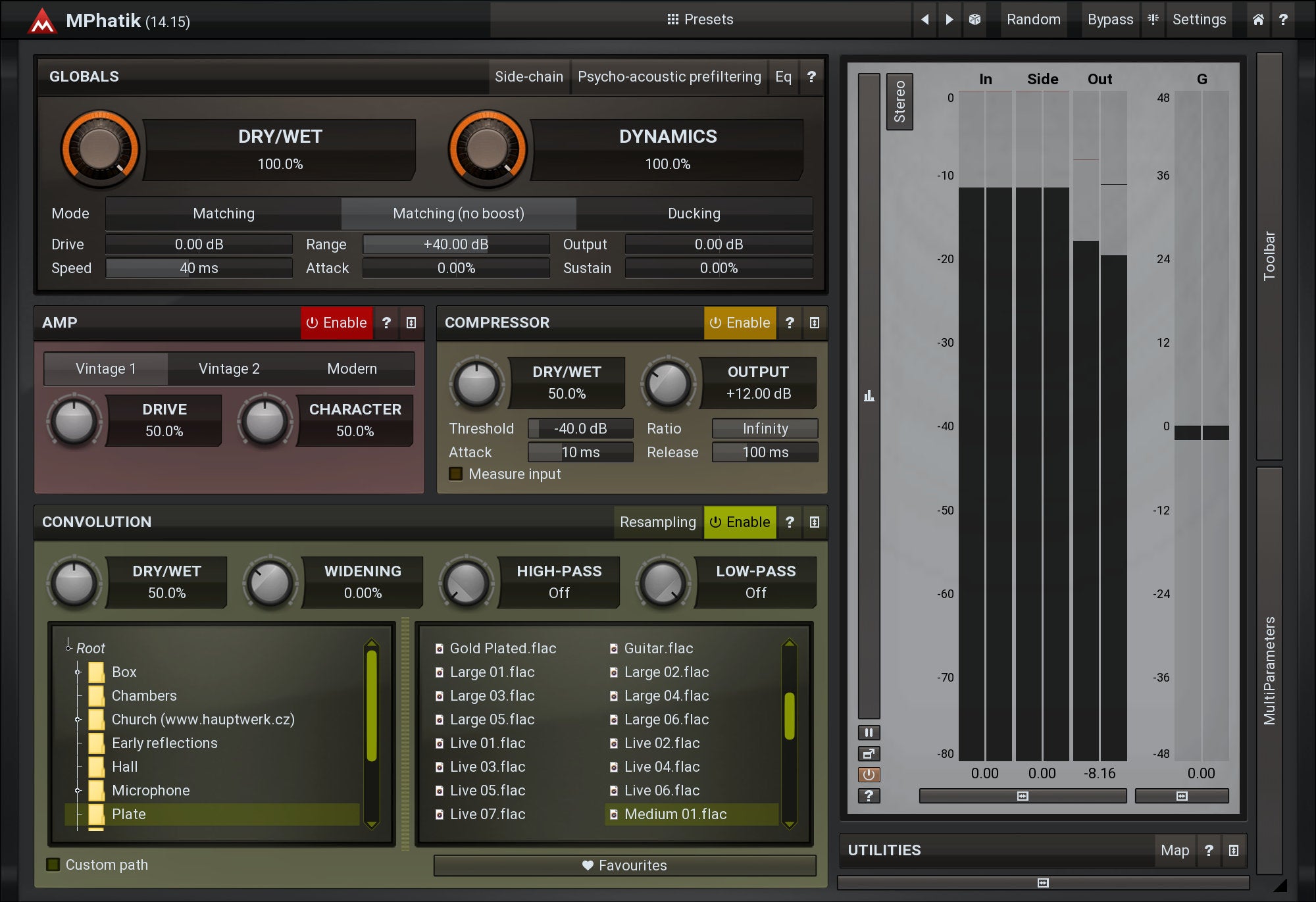 MPhatik comes equipped with a powerful amp simulator, convolution reverb (featuring all kinds of impulse responses from plate reverbs to halls, rooms etc., or your own IR files of course) and a compressor. If that's not enough, you can also use the side-chain input to drive MPhatik and process the audio with your own tools, leaving MPhatik to restore the dynamics.