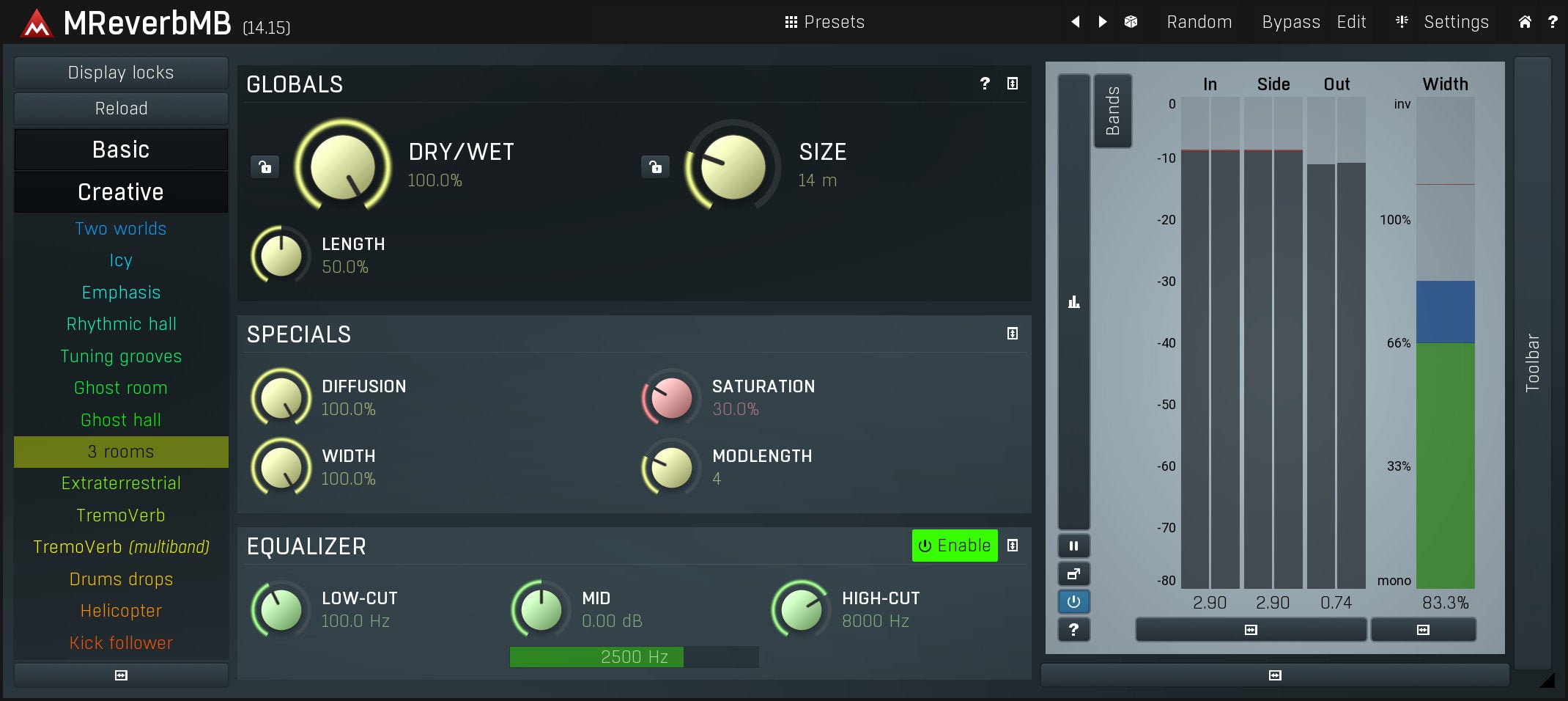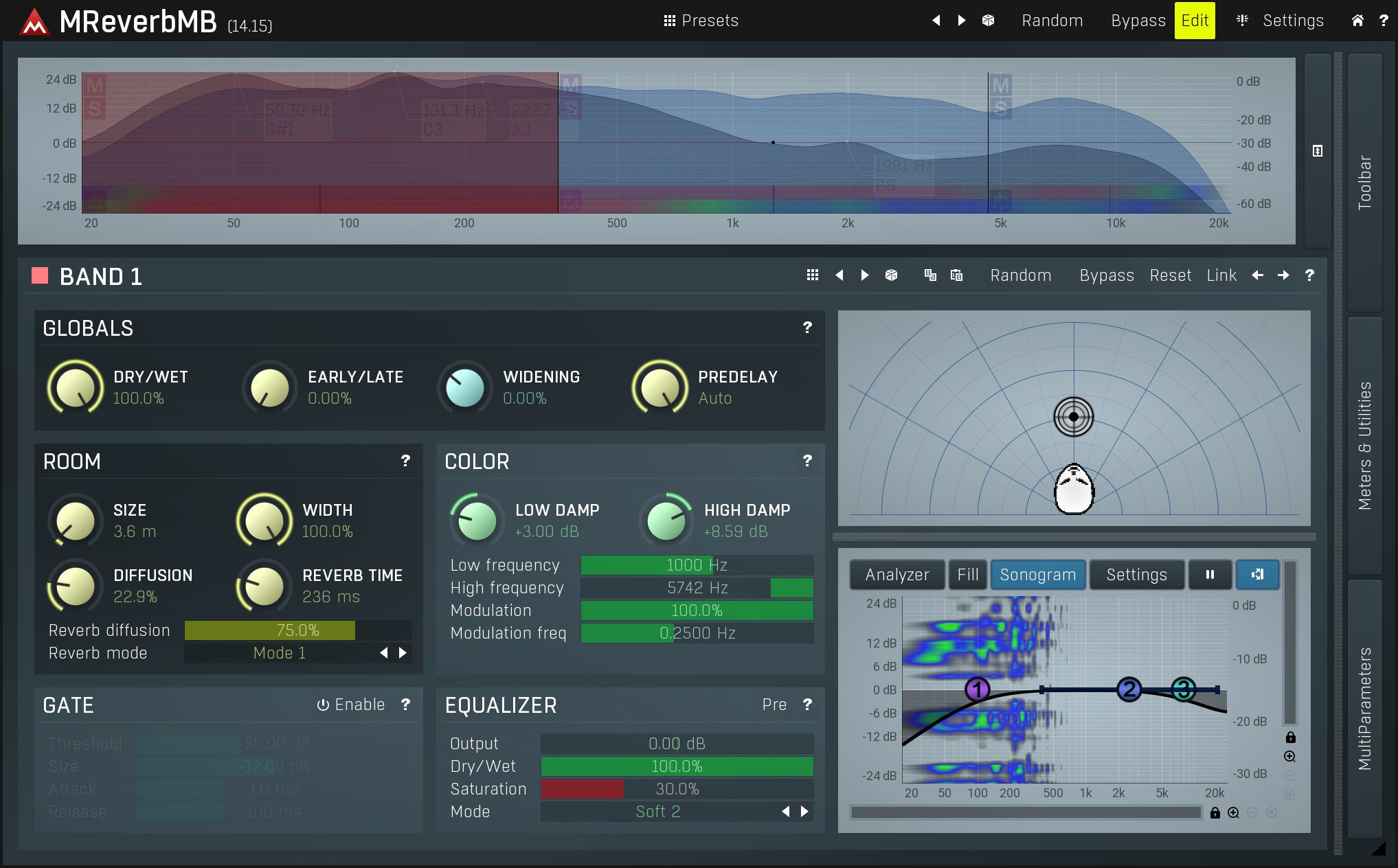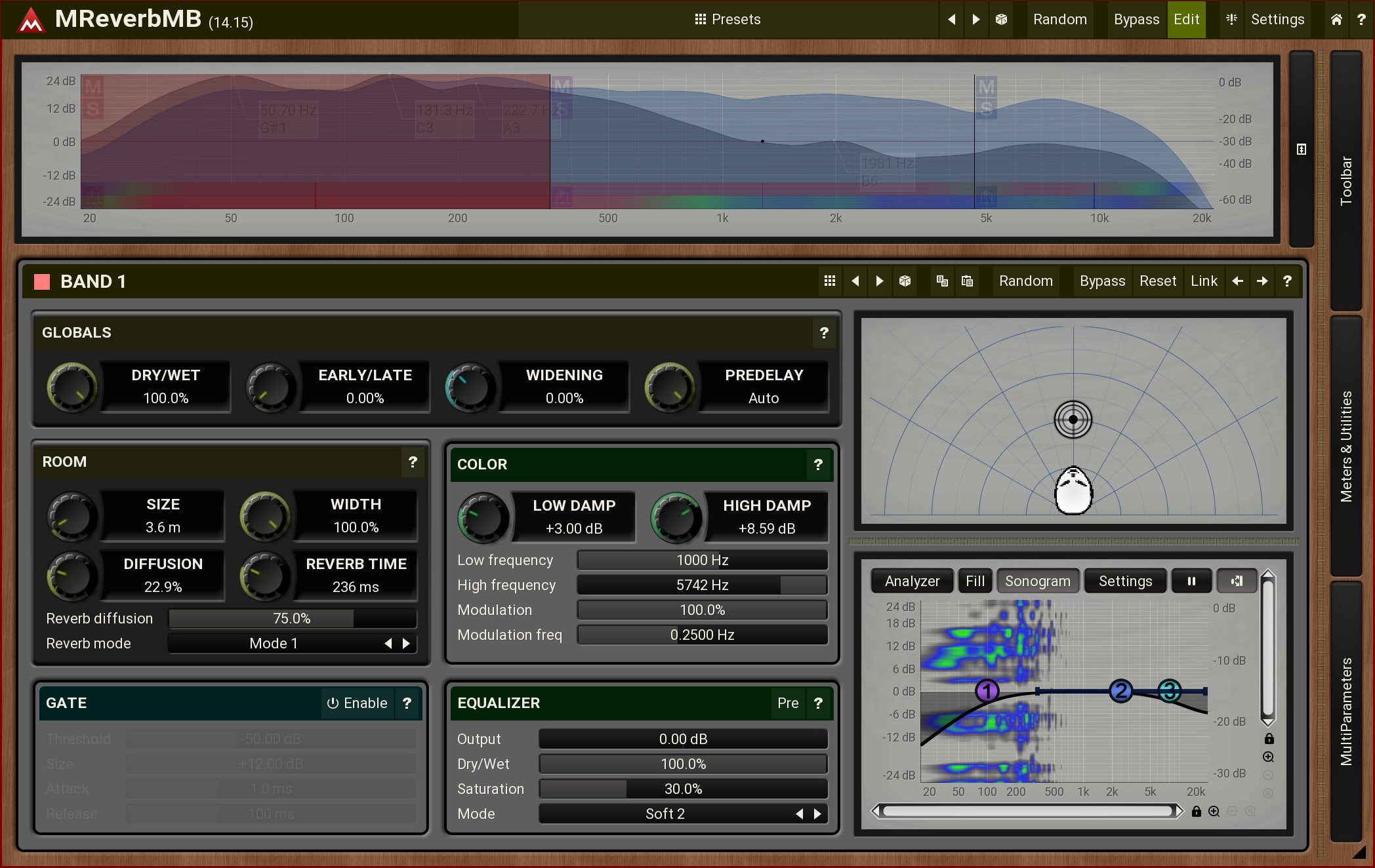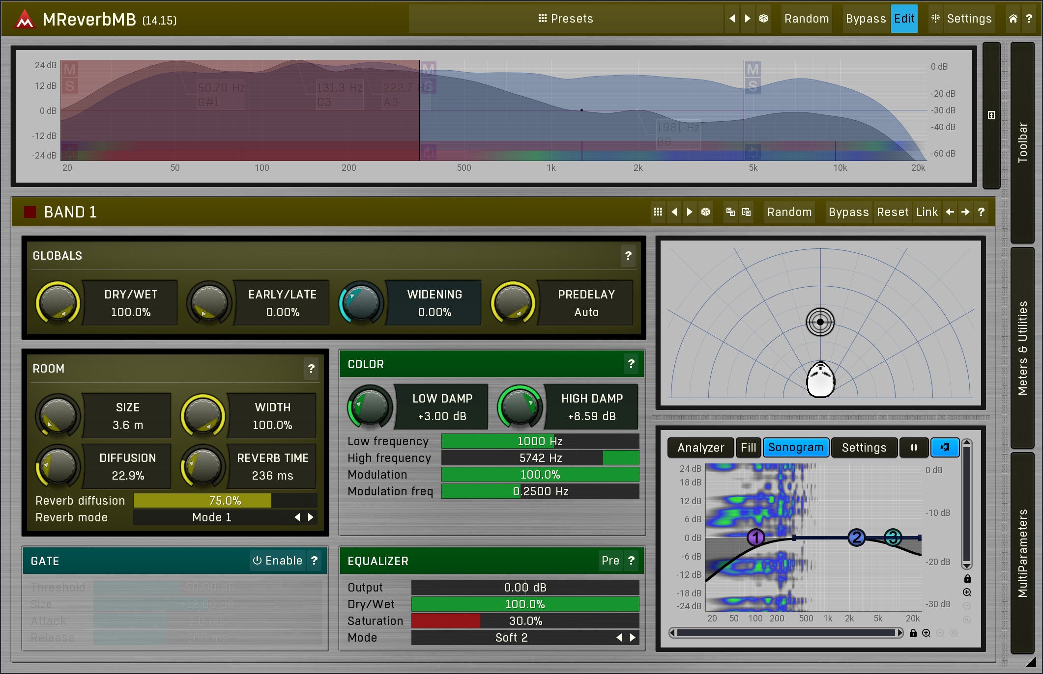 MReverbMB extends the possibilities well beyond that of standard quality reverbs by allowing you to process up to 6 distinct bands simultaneously. This reverb plugin can provide everything from extremely realistic halls to unbelievable effects.