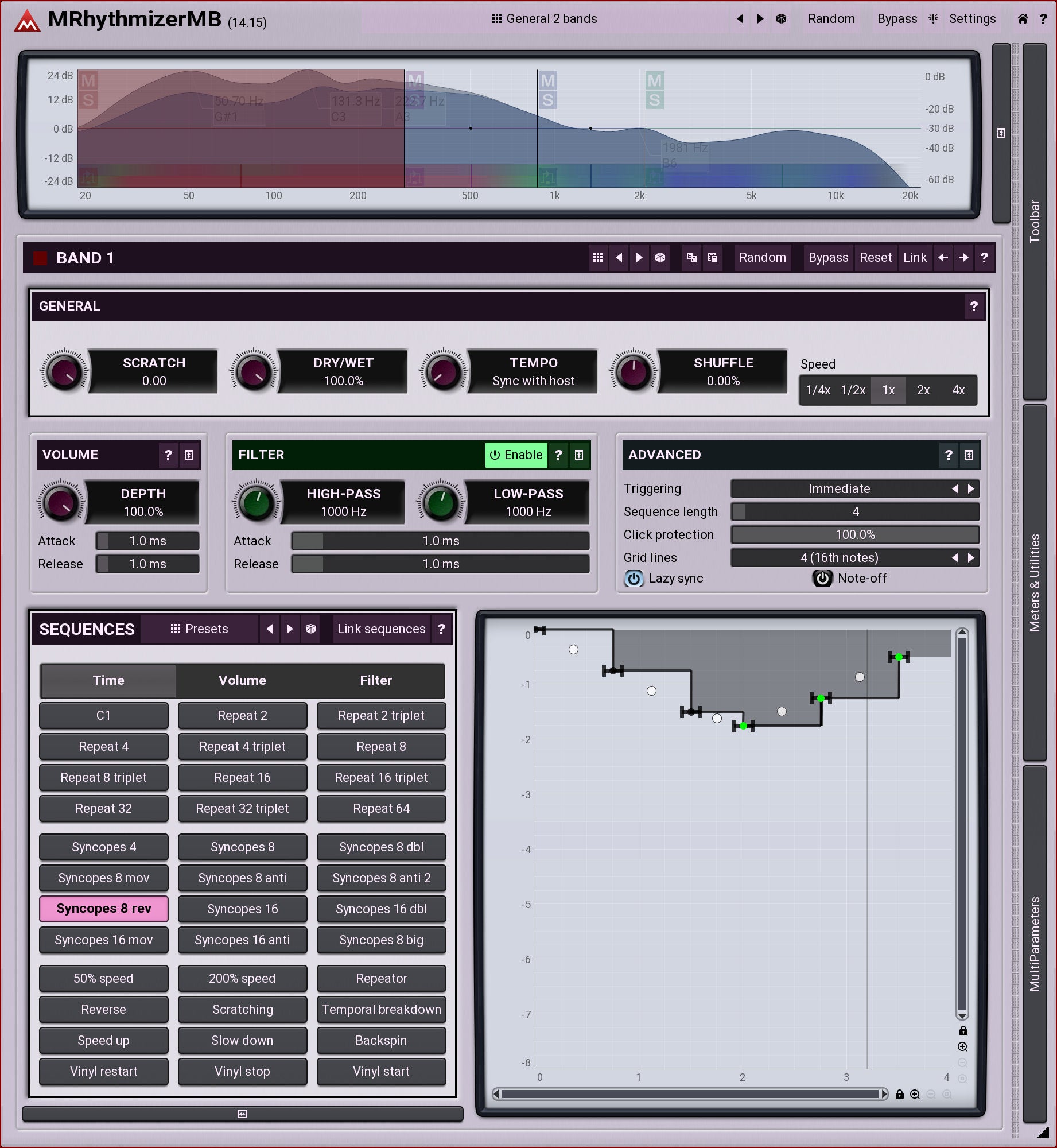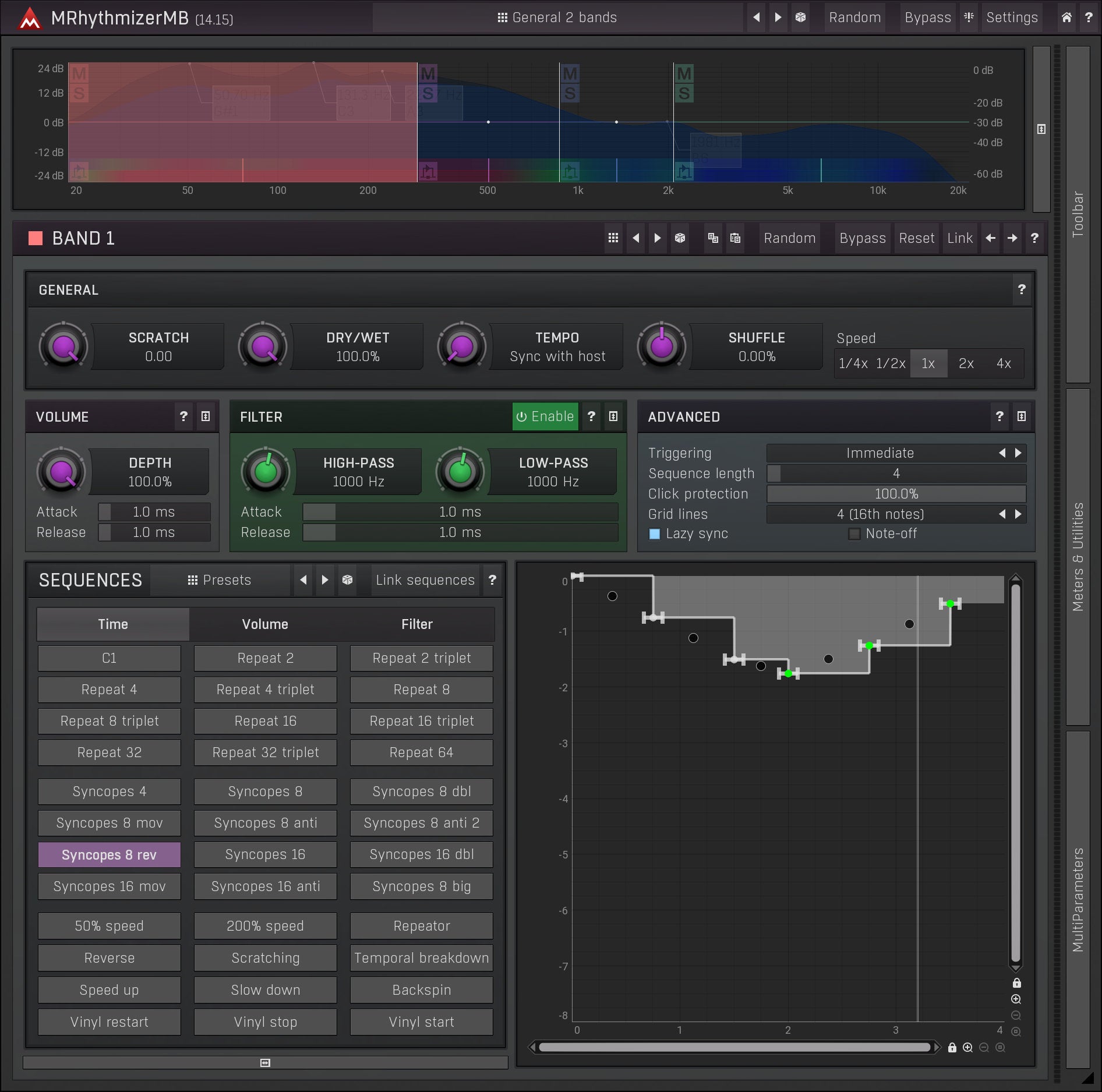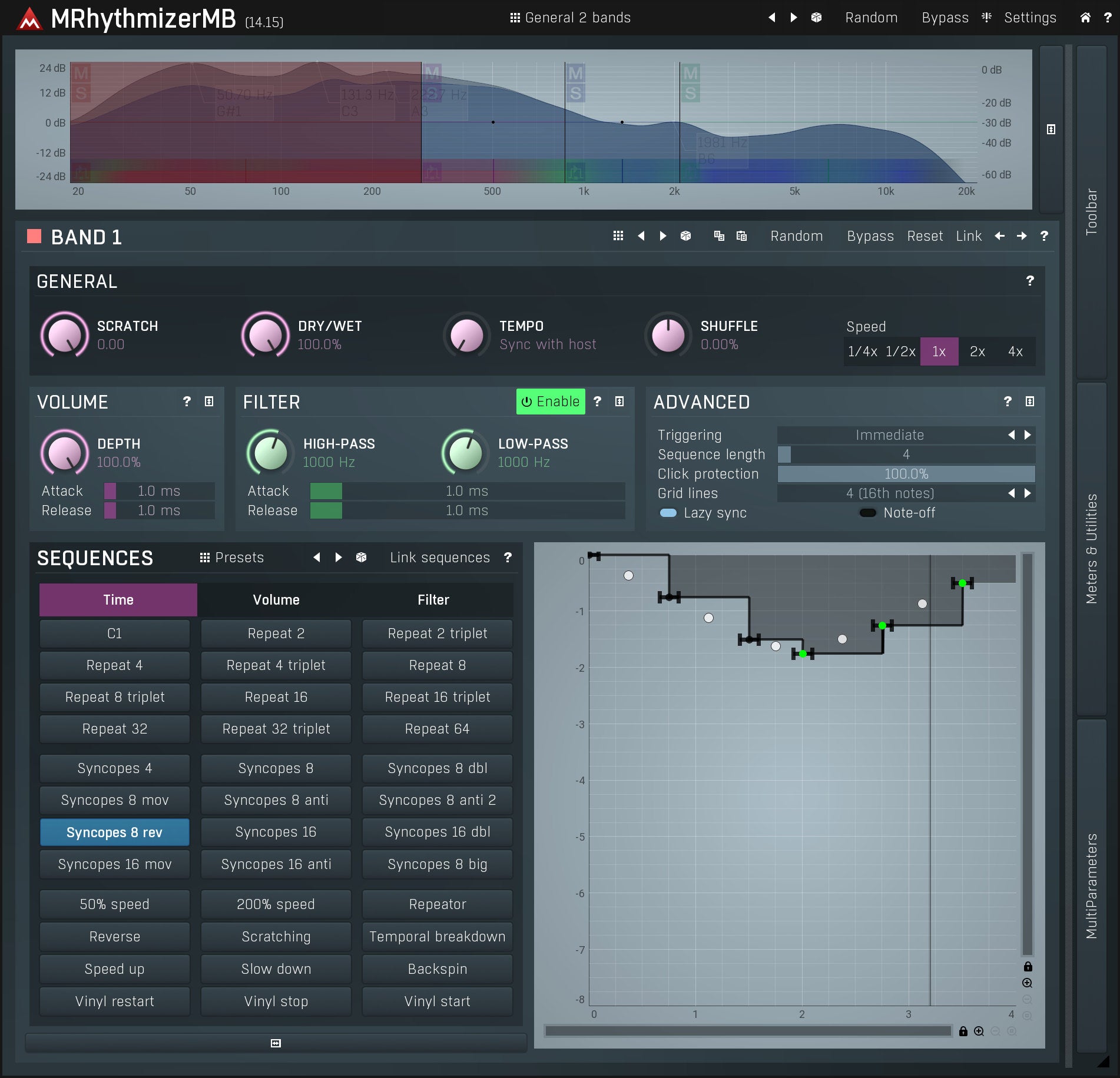 From gating to glitching, repeating hits to scratching, all with stunning audio quality and up to 6 distinct bands, that's MRhythmizerMB. A unique time manipulation effect that uses an integrated sequencer to control time, volume and filters. MRhythmizerMB brings your music to life, say goodbye to boring audio performances!