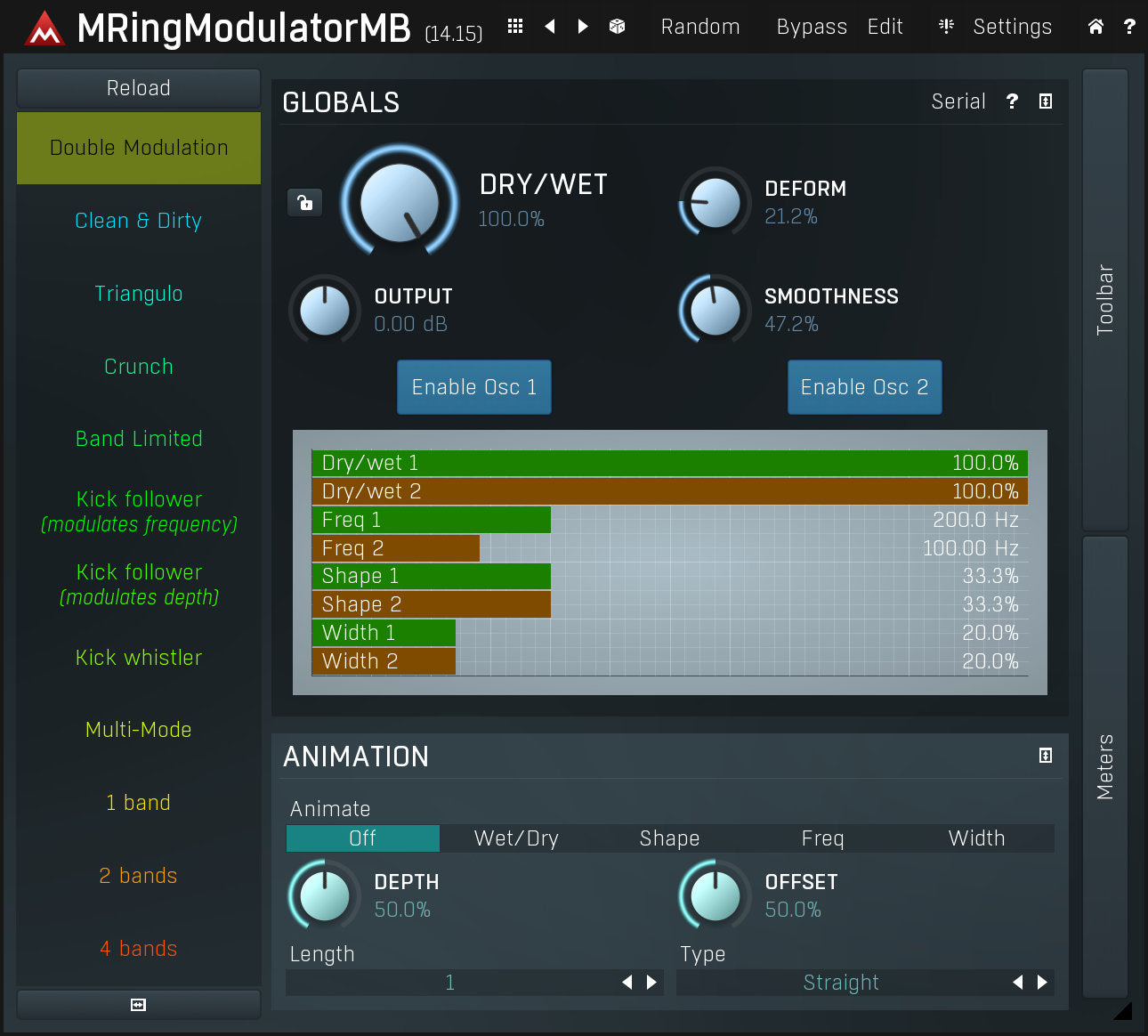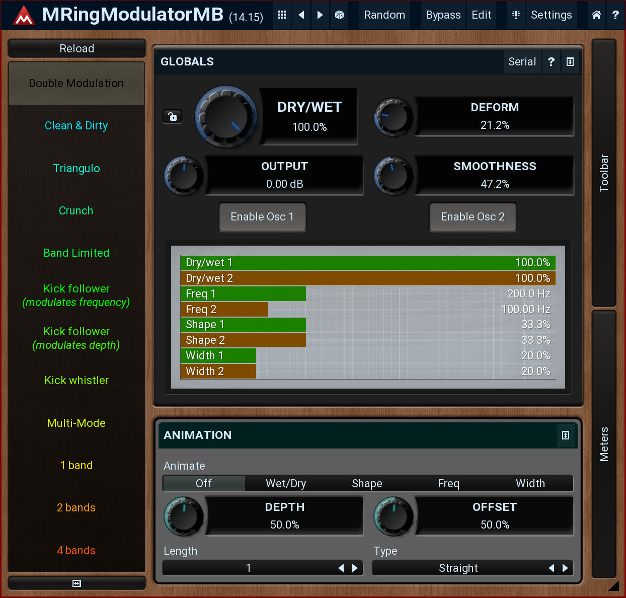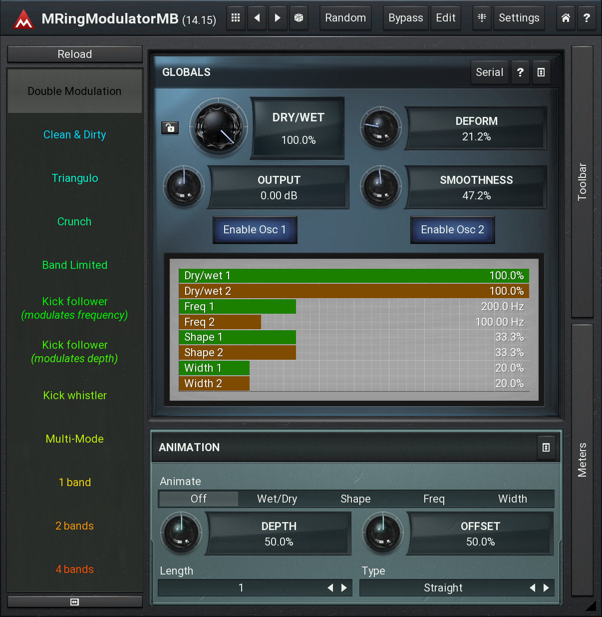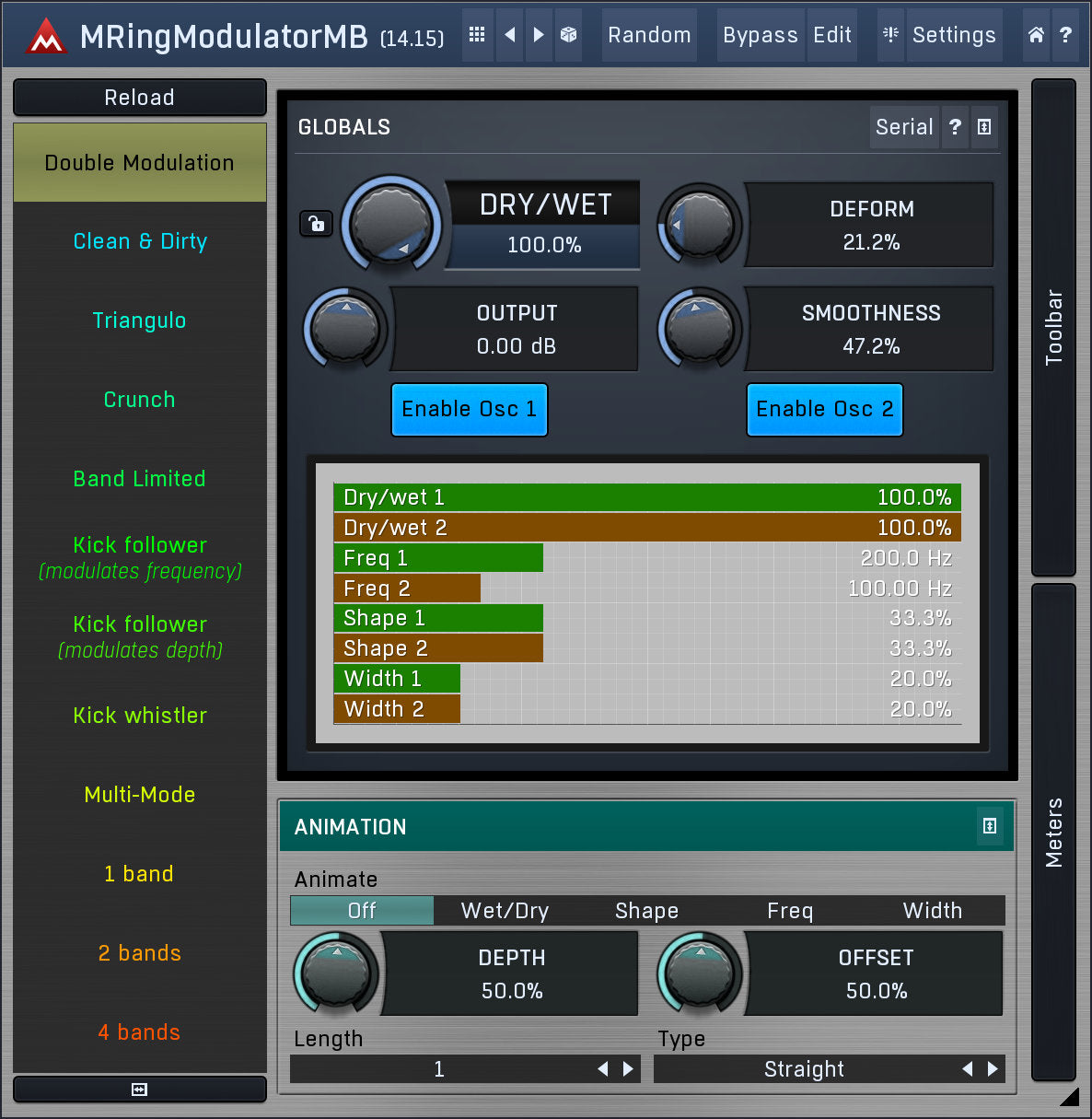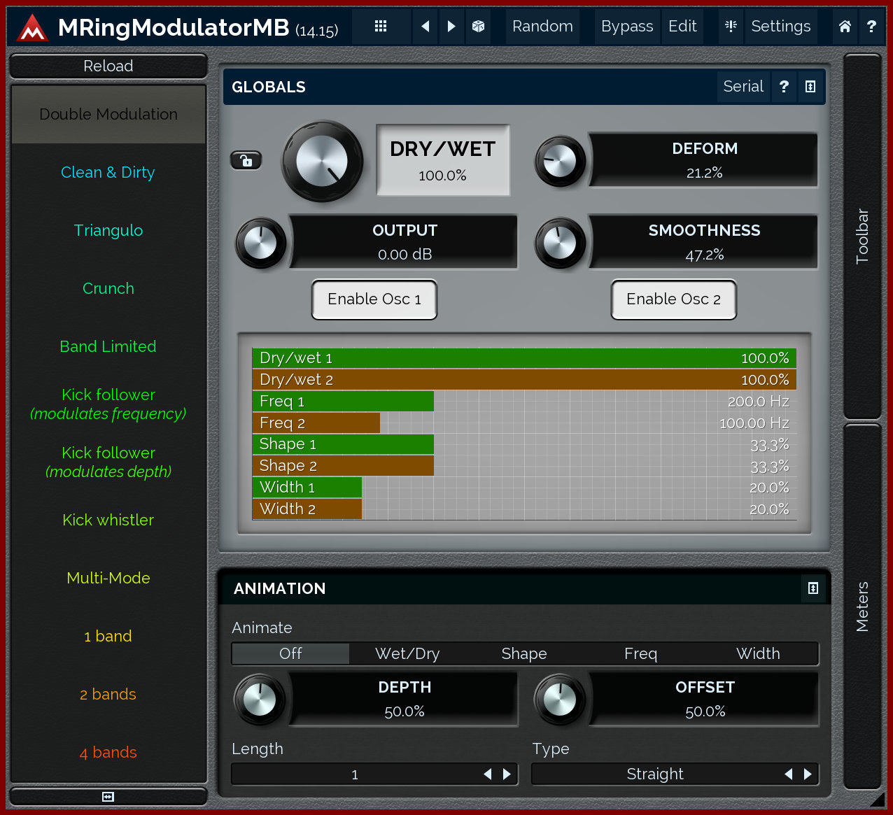 Ring-modulators are quite specialized effects used especially on non-harmonic audio materials, such as drums. MRingModulatorMB is a very advanced ring-modulation effect, which is, due to its multiband nature, highly suitable for many types of audio.