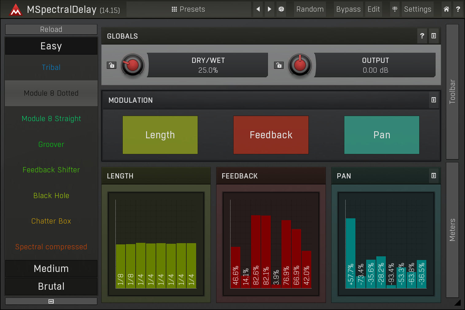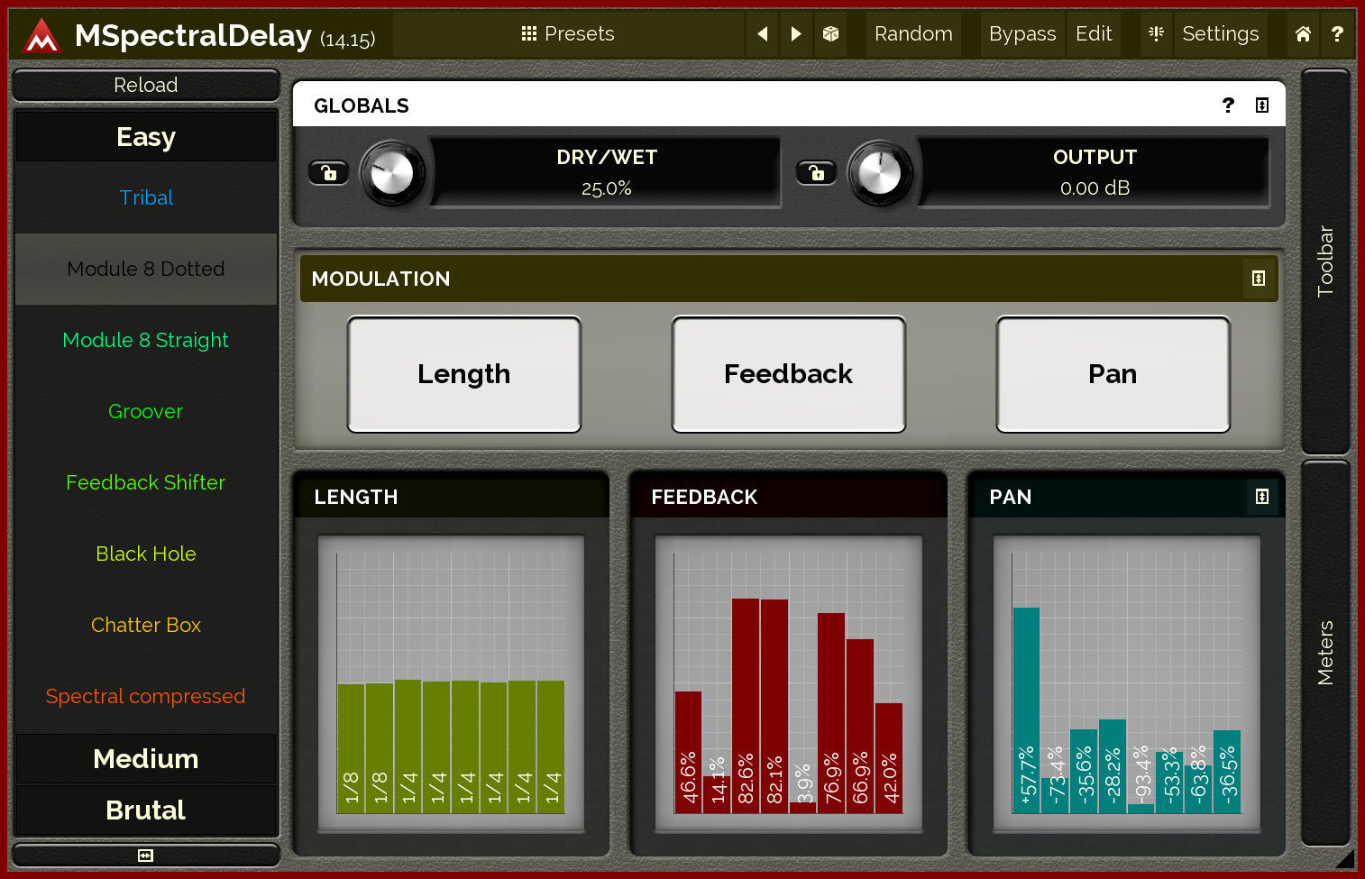 MSpectralDelay is extremely powerful, therefore also complex. So we have exploited its features and created 20 active presets on the easy screen, each as versatile as a dedicated plugin. These make using the plugin easy even for complete beginners.