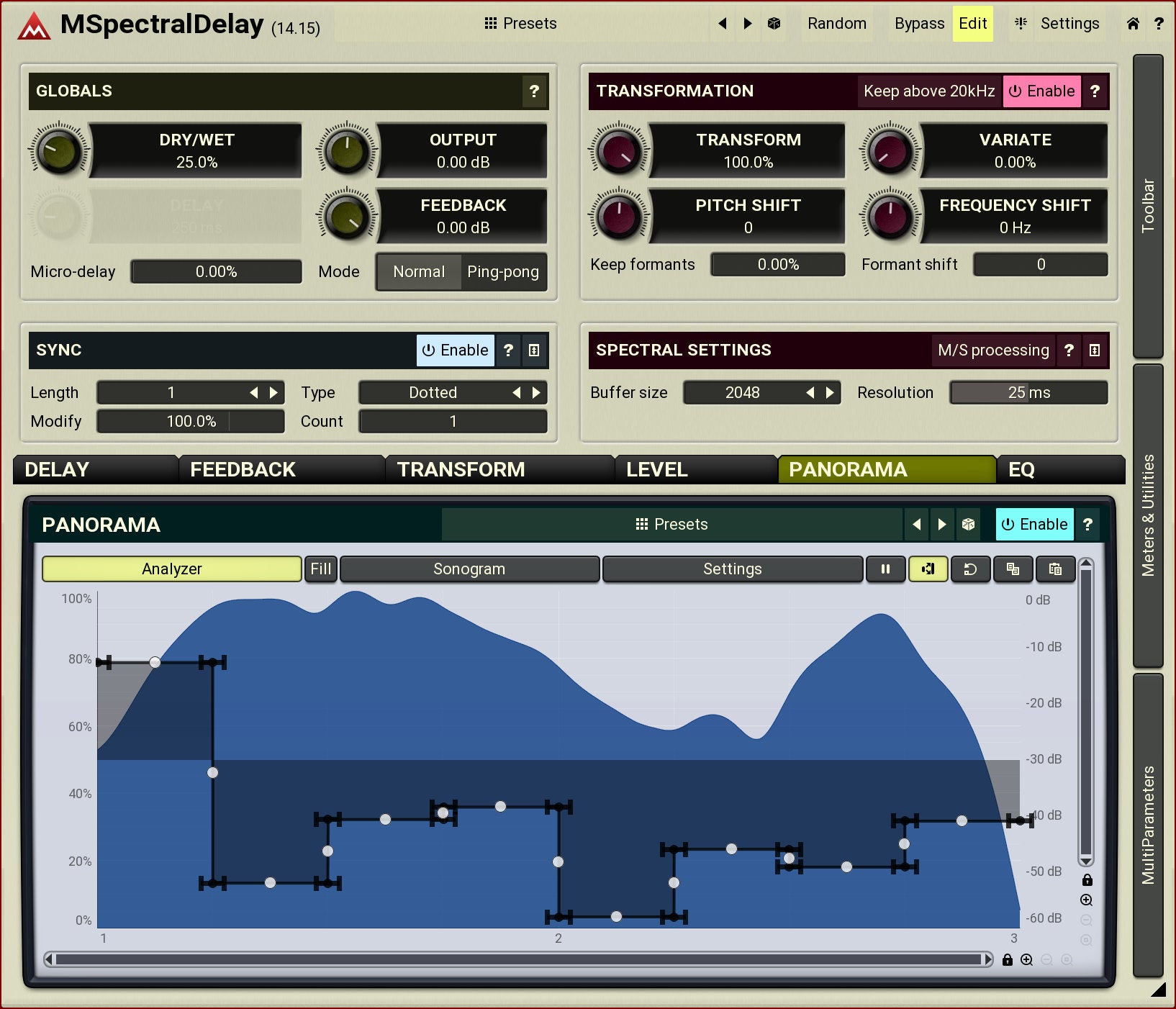 Traditional delay plugins feature a simple feedback delay, which produces identical copies of the original signal, sometimes with a possibility of filtering, distortion or other basic effects. MSpectralDelay lets you transform individual frequencies. First it lets you control the delay time, feedback, panorama and level (EQ) for each frequency. MSpectralDelay also provides complex spectral transformations - pitch, frequency shift, formants, plus an actual frequency to frequency transformation and level to level transformation.