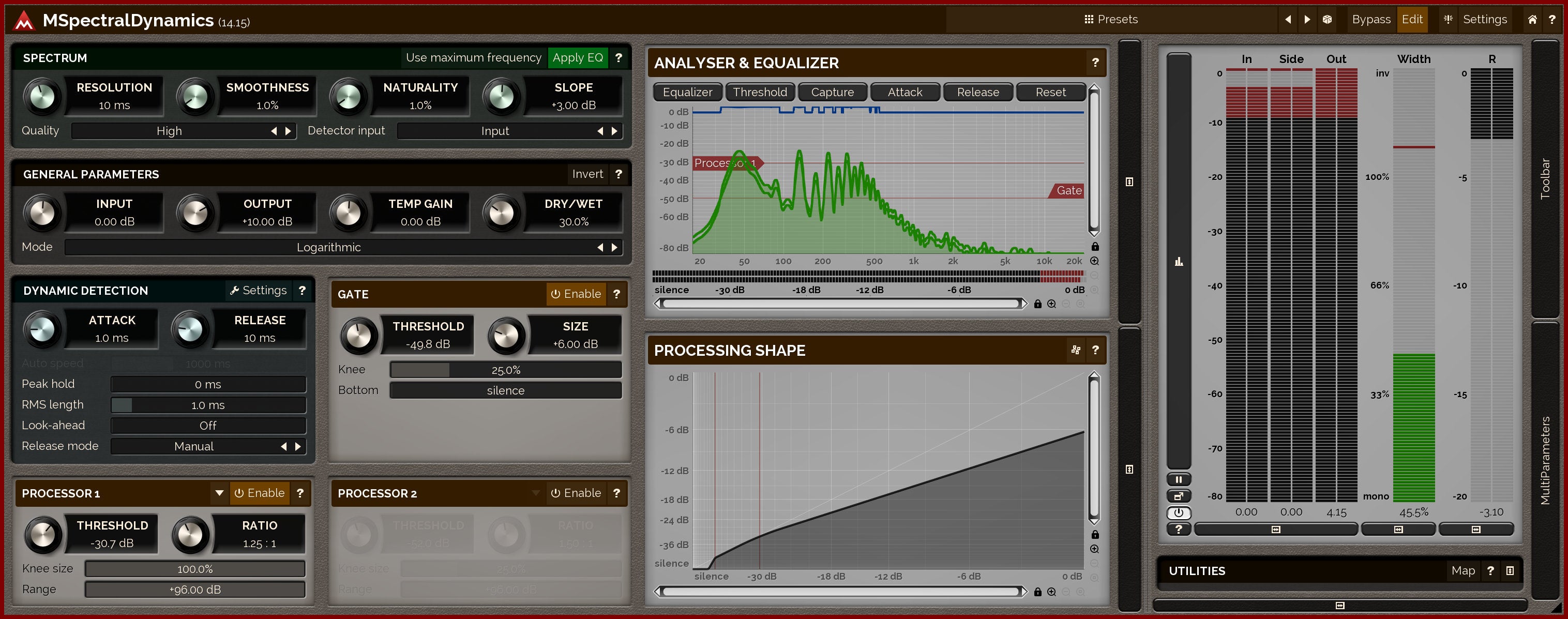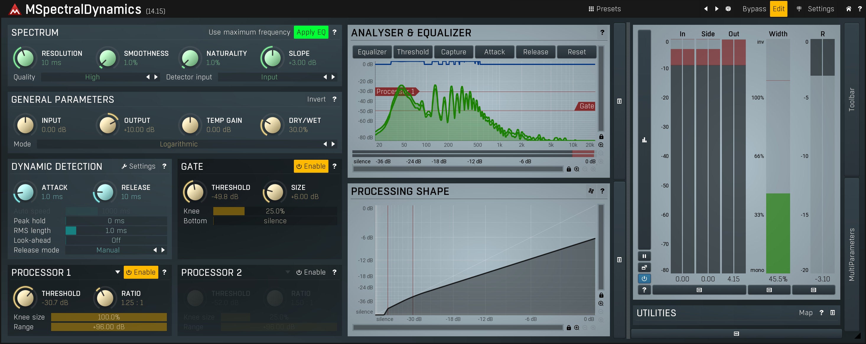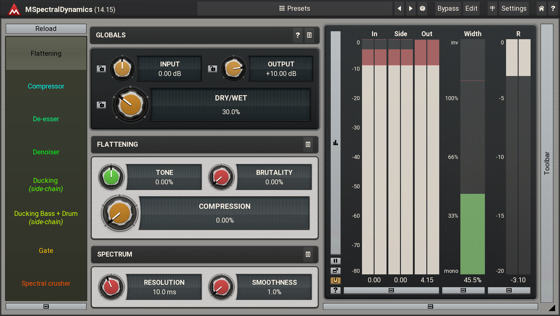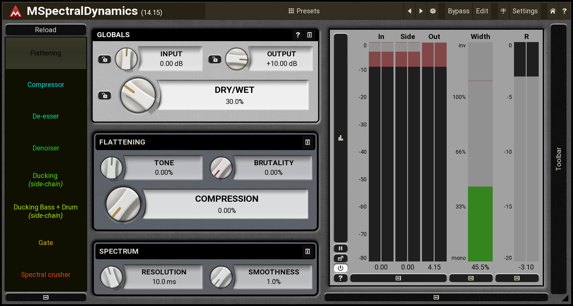 MSpectralDynamics is a true revolution in audio processing. It can flatten the spectrum, prevent collisions between tracks, remove noise, and open up myriad new creative possibilities.