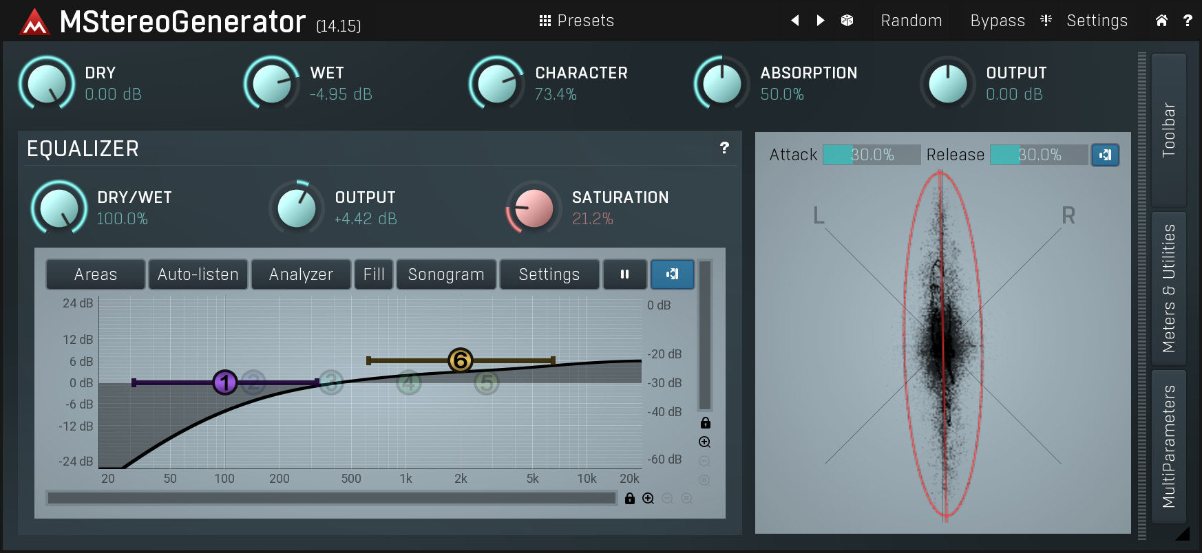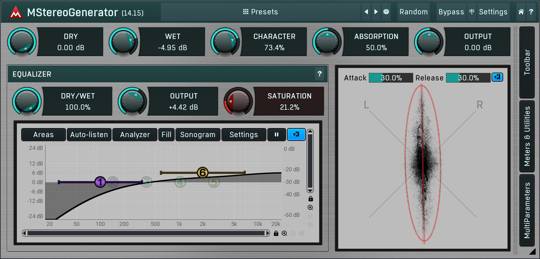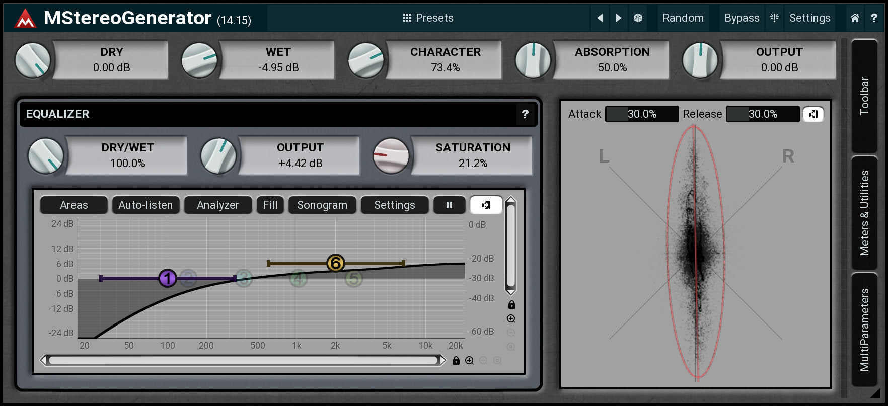 An integrated equalizer lets you adjust which parts of the spectrum you want to expand and the stereo scope gives you an immediate view of the resulting stereo width.