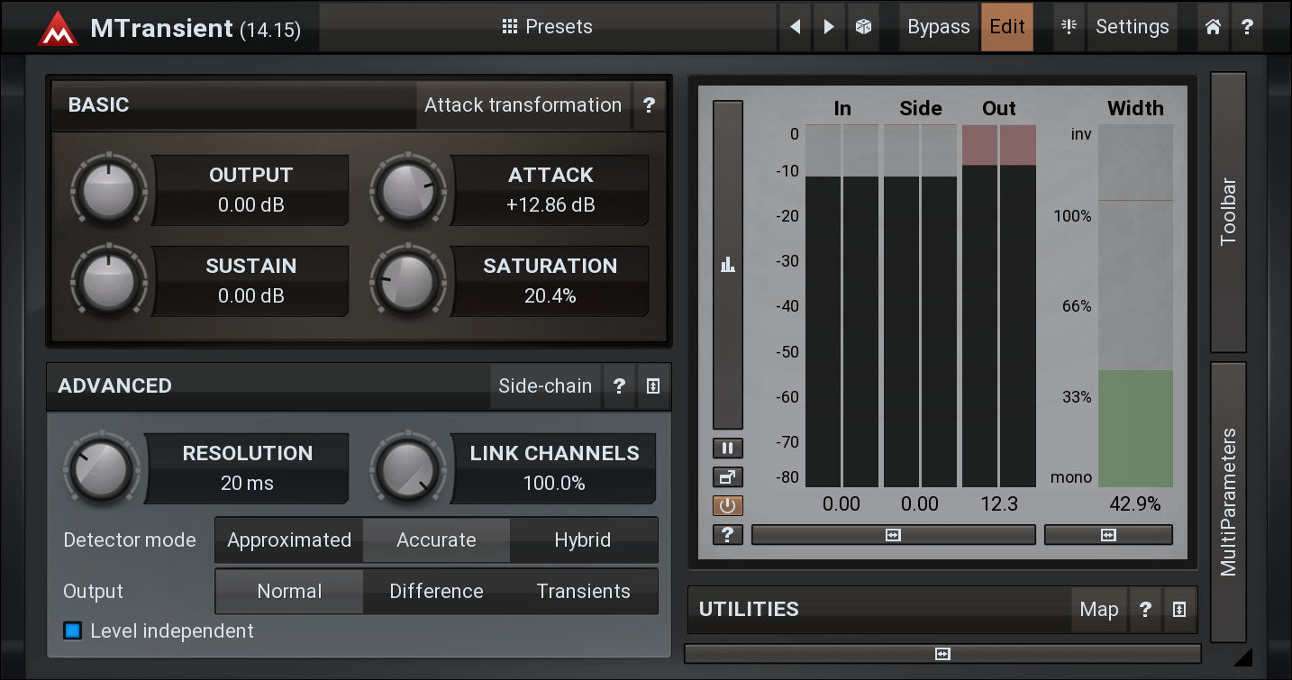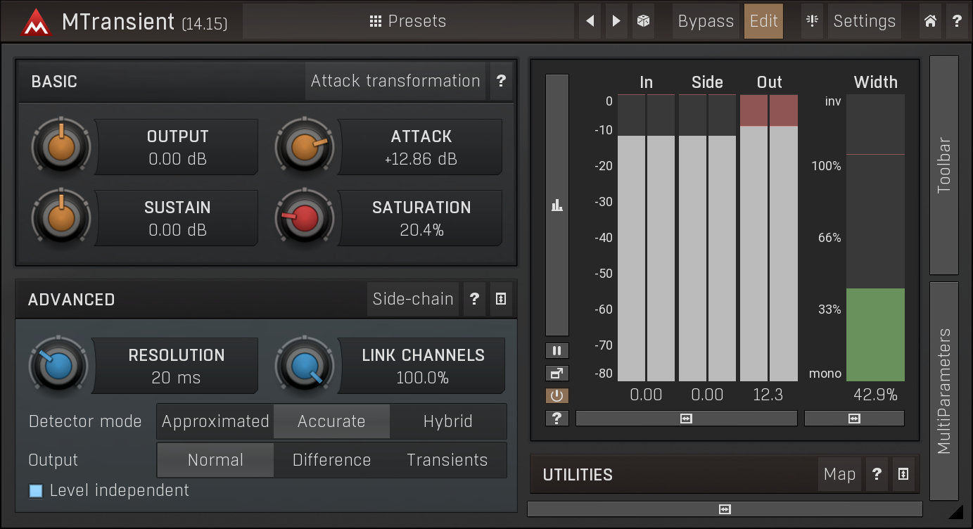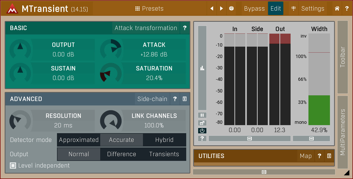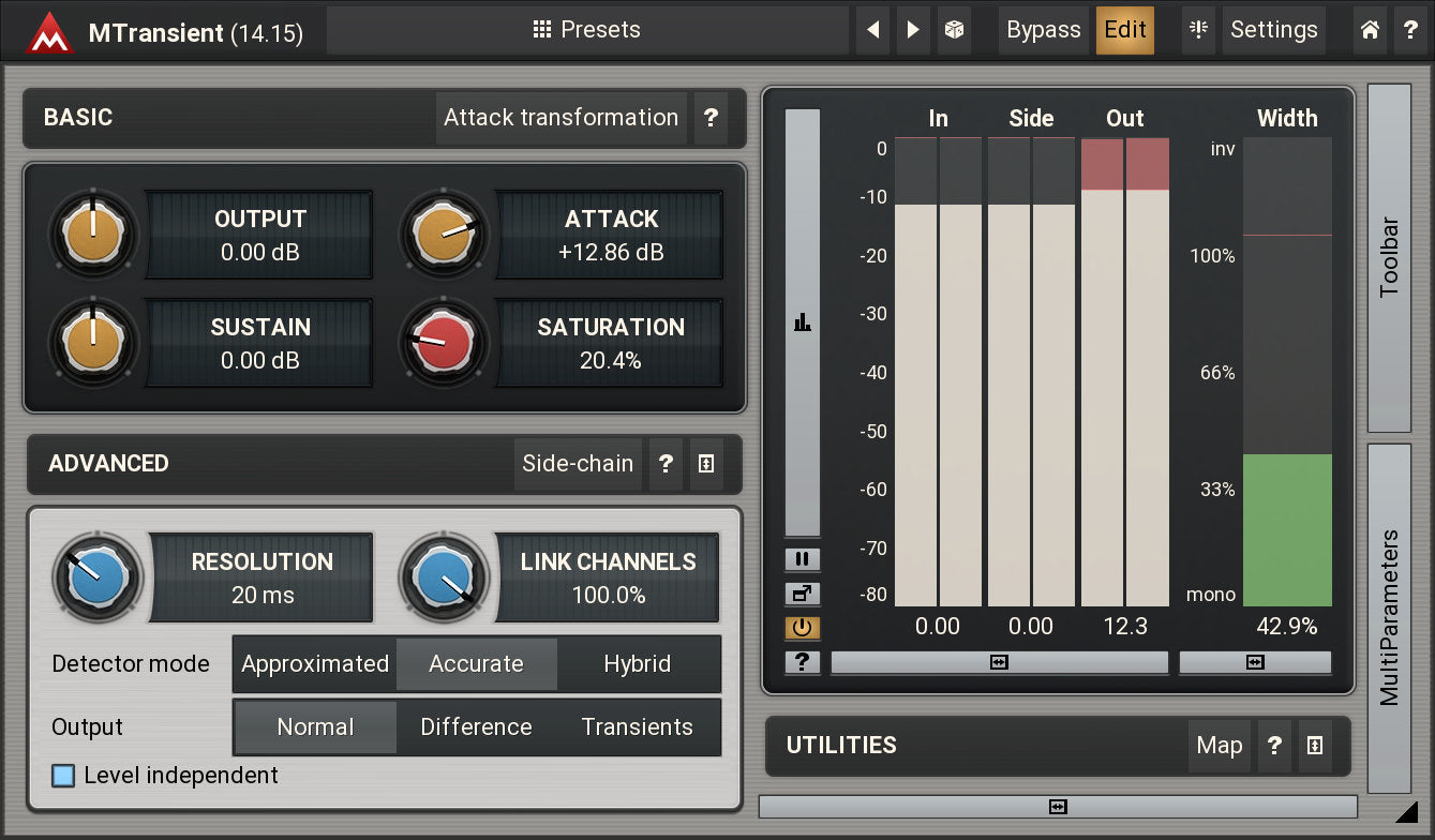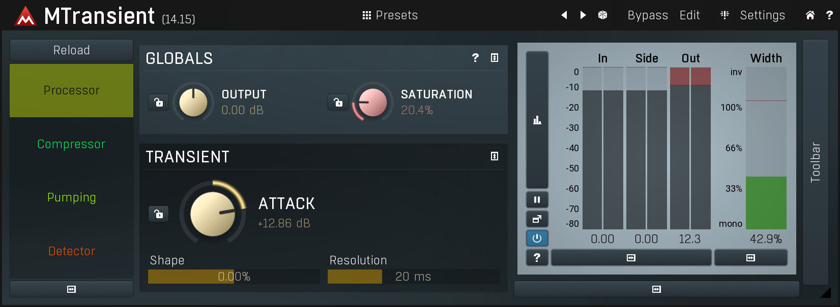 The plugin can not only bring the transients up and down, it can make them more textural using our magnificent saturation system, which can add a pleasant analogue character.