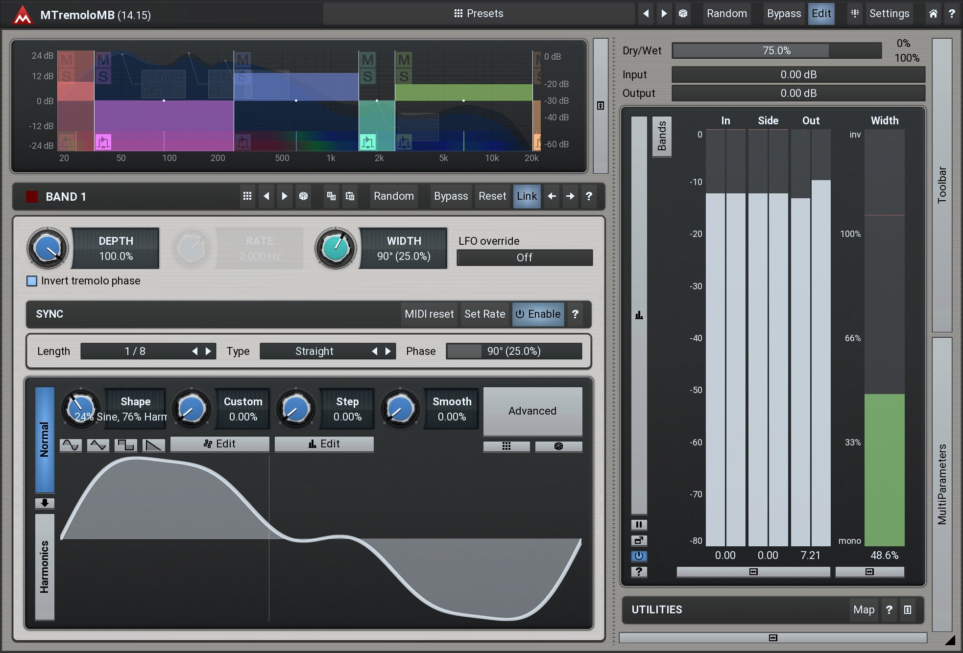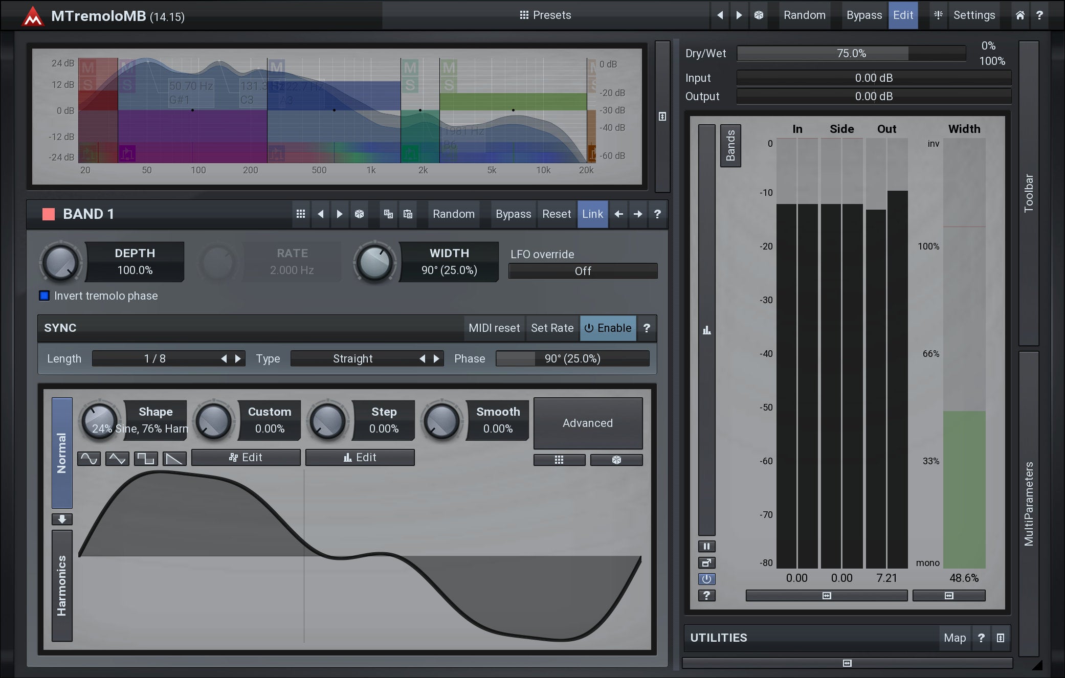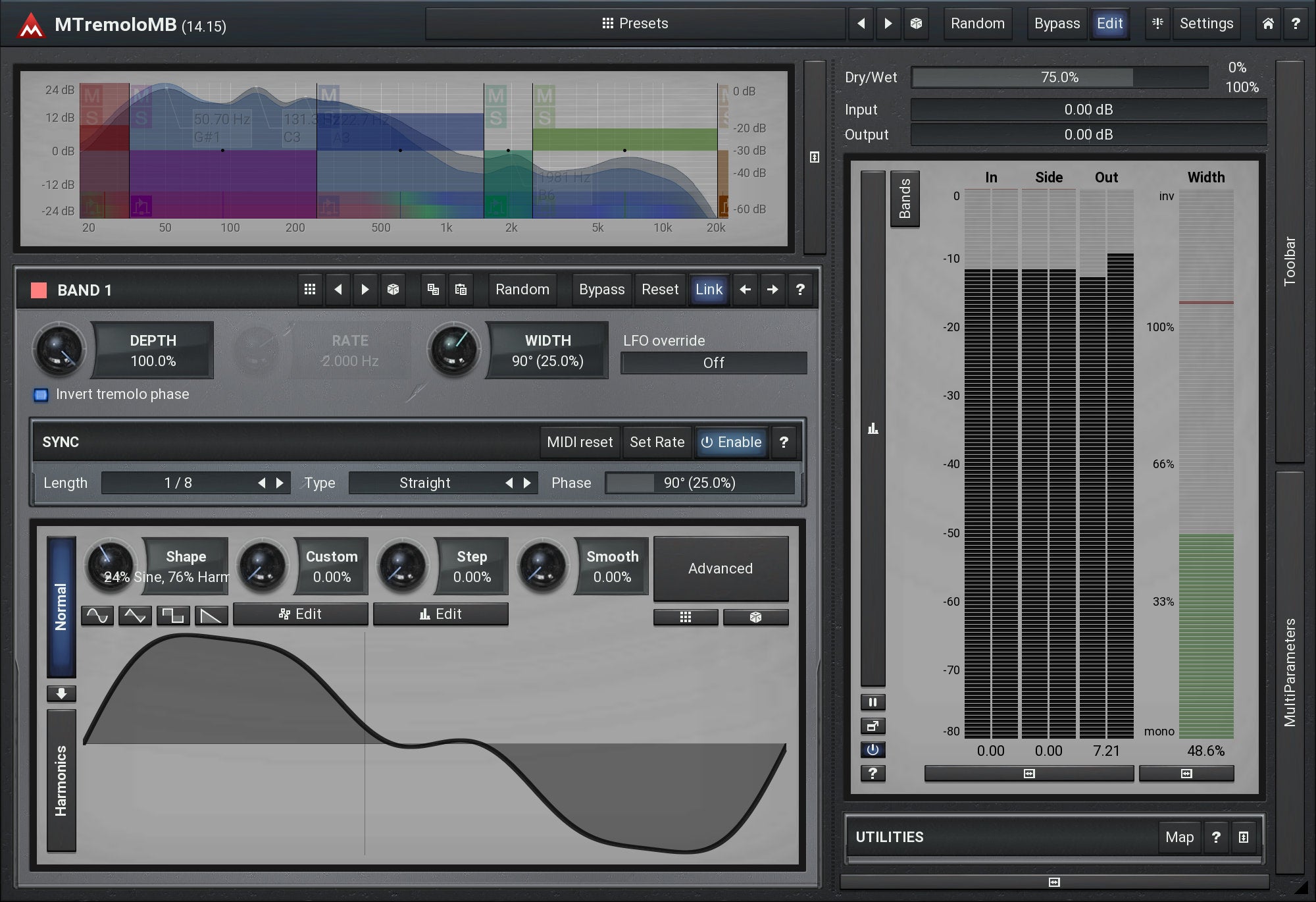 MTremoloMB, the most powerful tremolo in the world, is an essential tool for any audio engineer. Whether you just want to add some flavour to an electric piano, add some stereo width, or start being really creative, MTremoloMB will deliver astonishing results in no time at all.