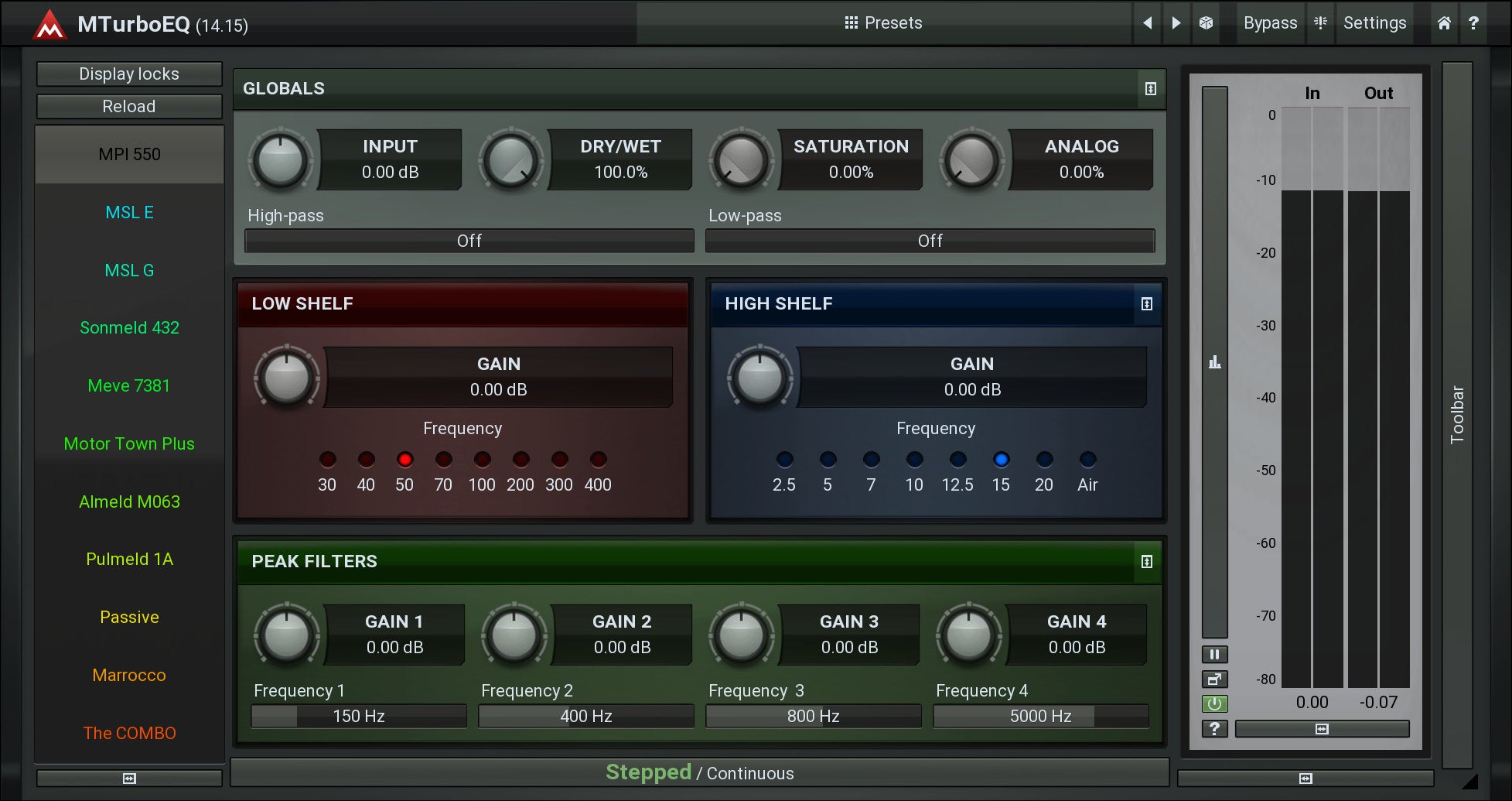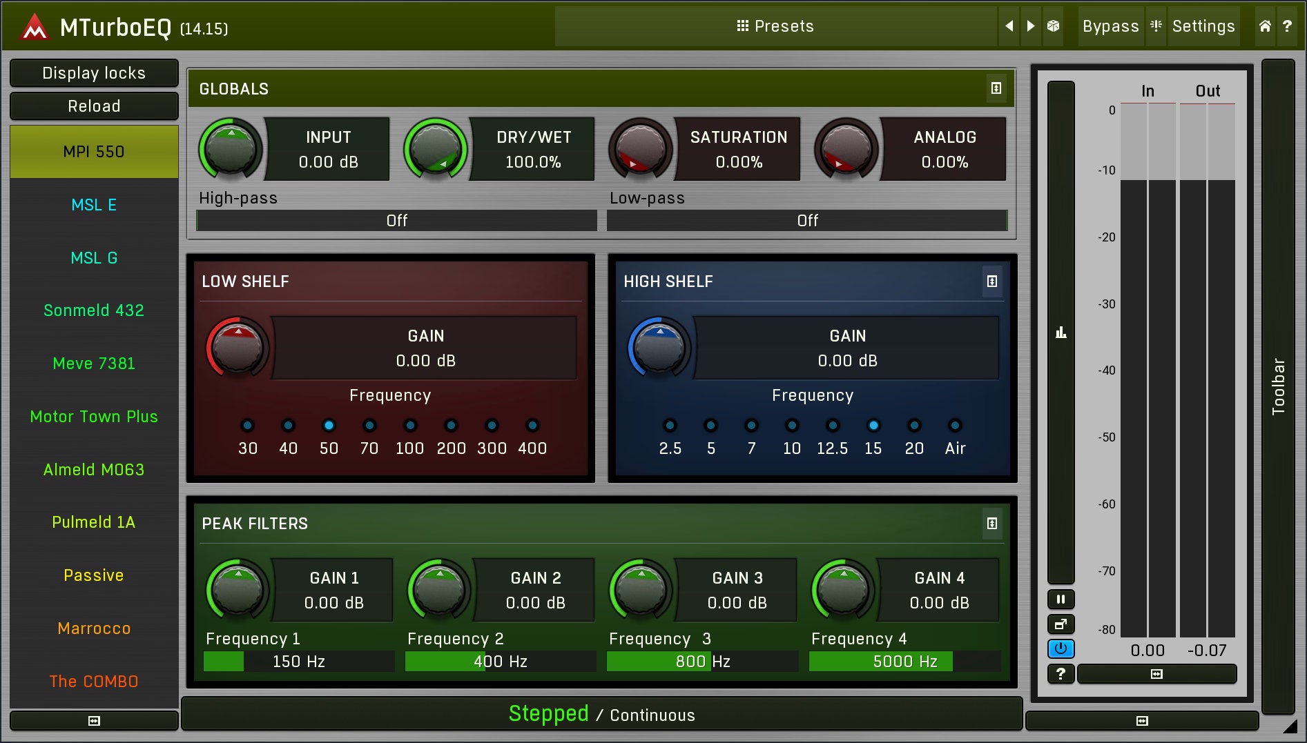 Some people just like lots of versatility, others prefer having limited options. MTurboEQ provides both options. In Stepped mode almost everything has limited values - predefined frequencies for each filter, gain increasing by single decibels etc. It is much faster to make a decision this way, especially since bigger differences are easier to compare by ear. And when (if) you are ready, you can just switch to Continous mode for fine-tuning. MTurboEQ then lets you access all of the frequencies etc., even if the original hardware (and all emulations) didn't have that. Courtesy of the digital world.
