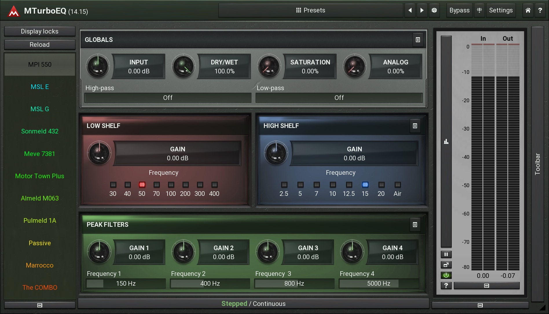 MTurboEQ speeds up the workflow tremendously by providing access to so many classic equalizers in a single click. But it doesn't stop there. The controls in each hardware were very different, and very weird in many cases, so one had to take a lot of time learning to work with such a clumsy interface. All models in MTurboEQ have pretty much the same user interface and features. There is always a low-shelf and a high-shelf, the most essential filters. Then there are usually 4 peak filters, even if the original had just one, and they always work the same way. And of course there are the classic goodies such as high-pass and low-pass filters (which are used on pretty much all tracks these days, but not many vintage equalizers actually had them), saturation to get some of the analogue feel, dry/wet for easy control of the amount of equalization, automatic gain compensation to avoid loudness trickery, mid/side/surround and more.