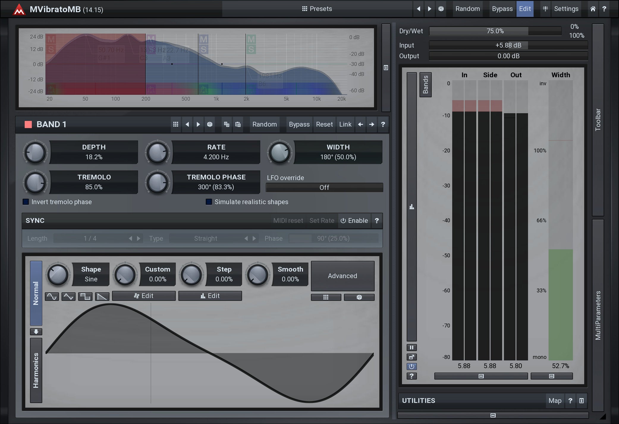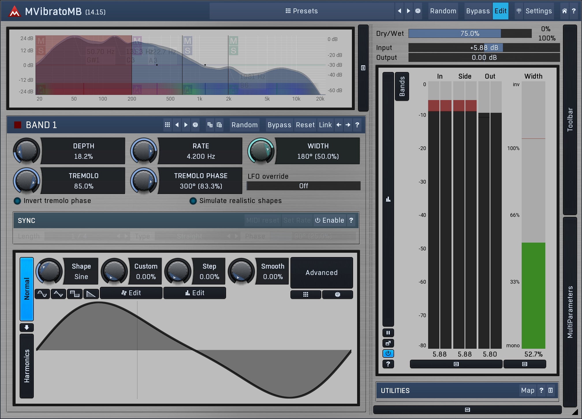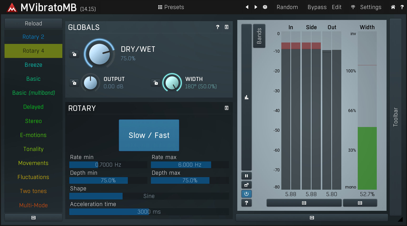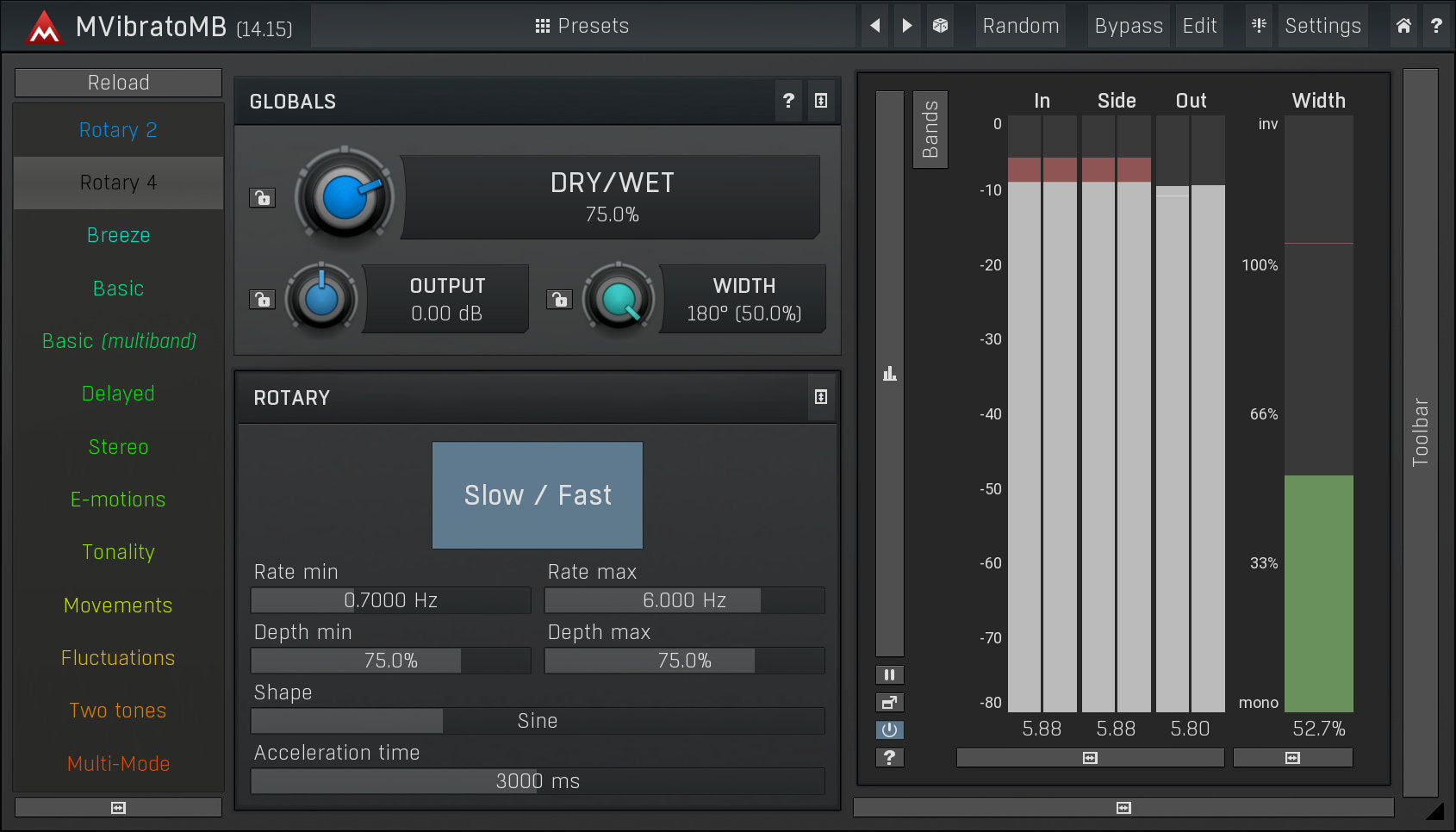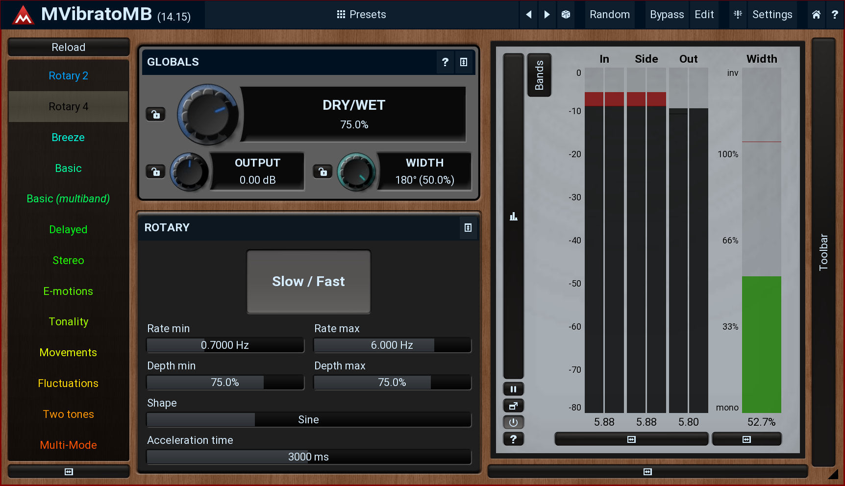 MVibratoMB combines the vibrato effect with a tremolo and multiband design. This provides enough power to build a 2-speaker rotary simulation, like the famous Leslie speaker. But why to stop there, when you can have a 6-band rotary! With up to 16x upsampling and sinc-interpolation MVibratoMB is simply the best sounding rotary simulator on the market.