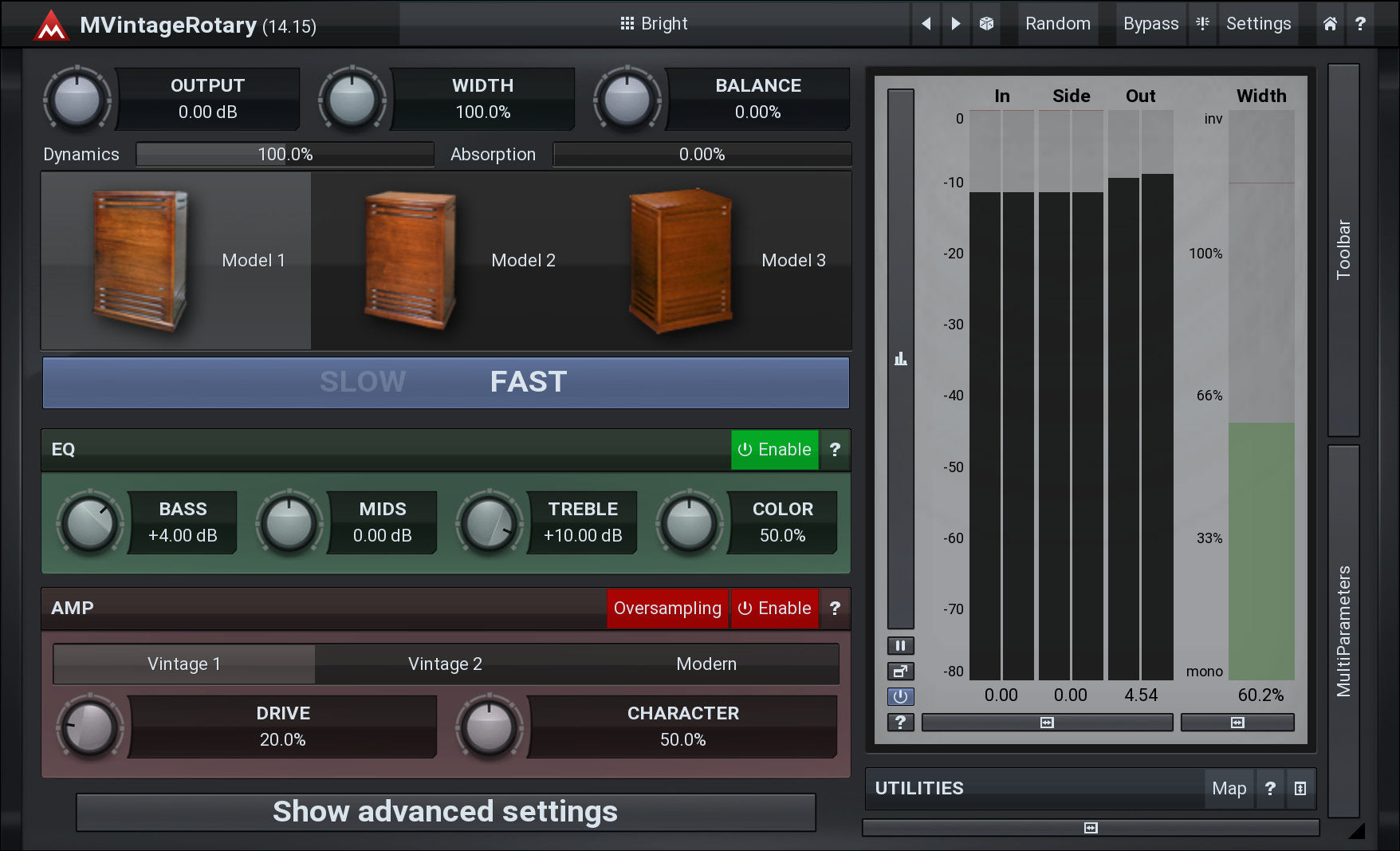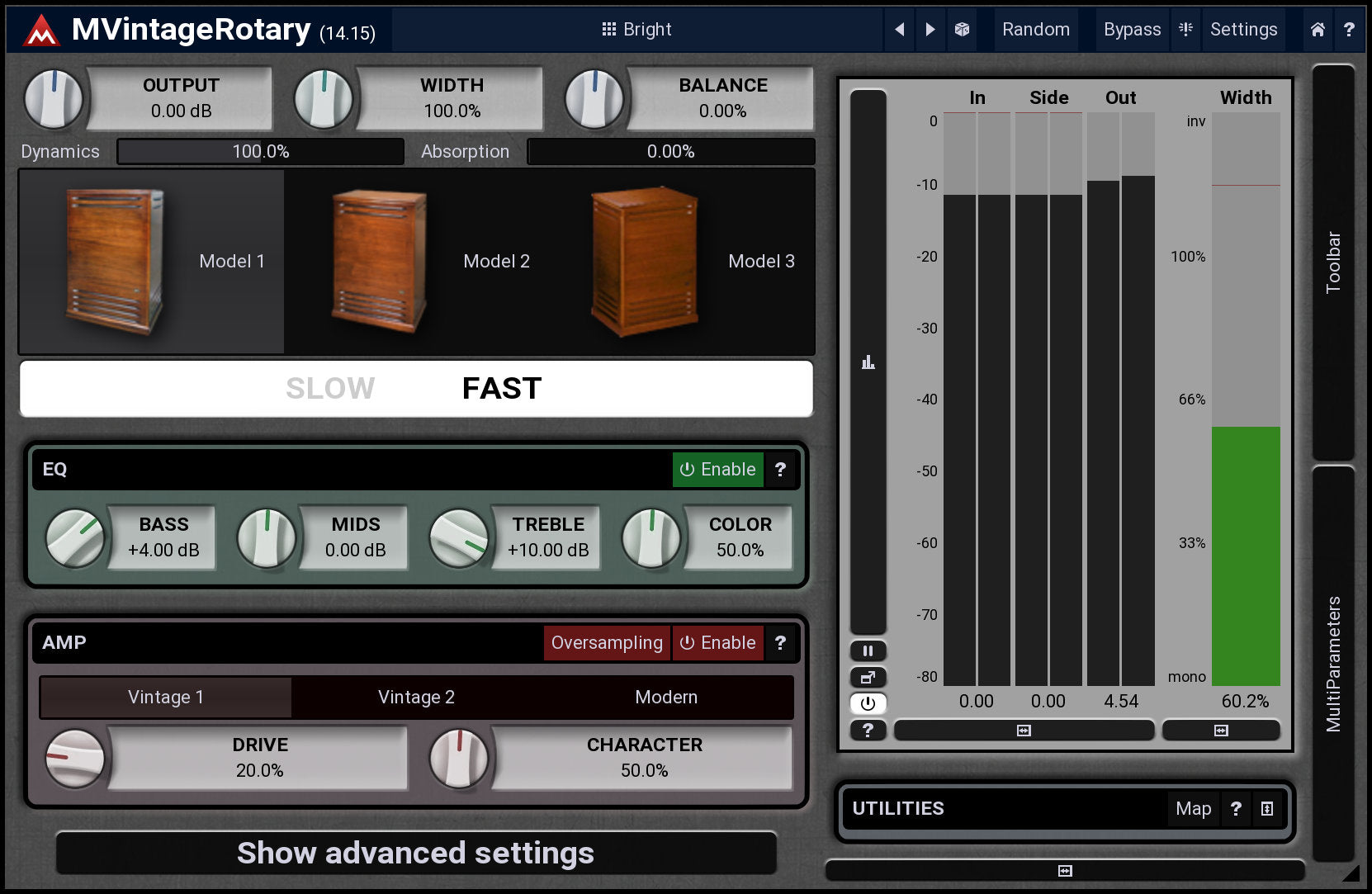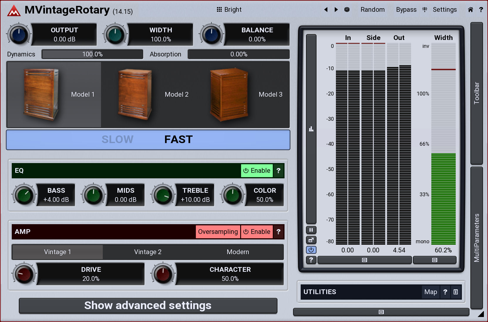 MVintageRotary not only sounds like (or maybe better than?) the original, it lets you control the stereo width, amount of the dynamics, internal dampening and much more. All of it sounds as natural as possible. And if you are ready, you can get even deeper - synchronize the rotation speeds to the tempo of your song, change rotation direction and more. You can control the slow/fast switch using your MIDI sustain pedal and modulation wheel of course, but again, you can do much more than that.
