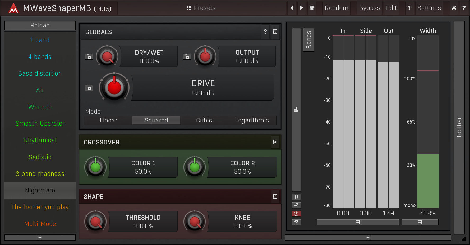 Waveshapers are the basic distortion modules but can be rather limited. But with MWaveShaperMB you can draw your own shapes and process up to 6 bands separately. Perfect for sound manglers searching for a really original distortion.