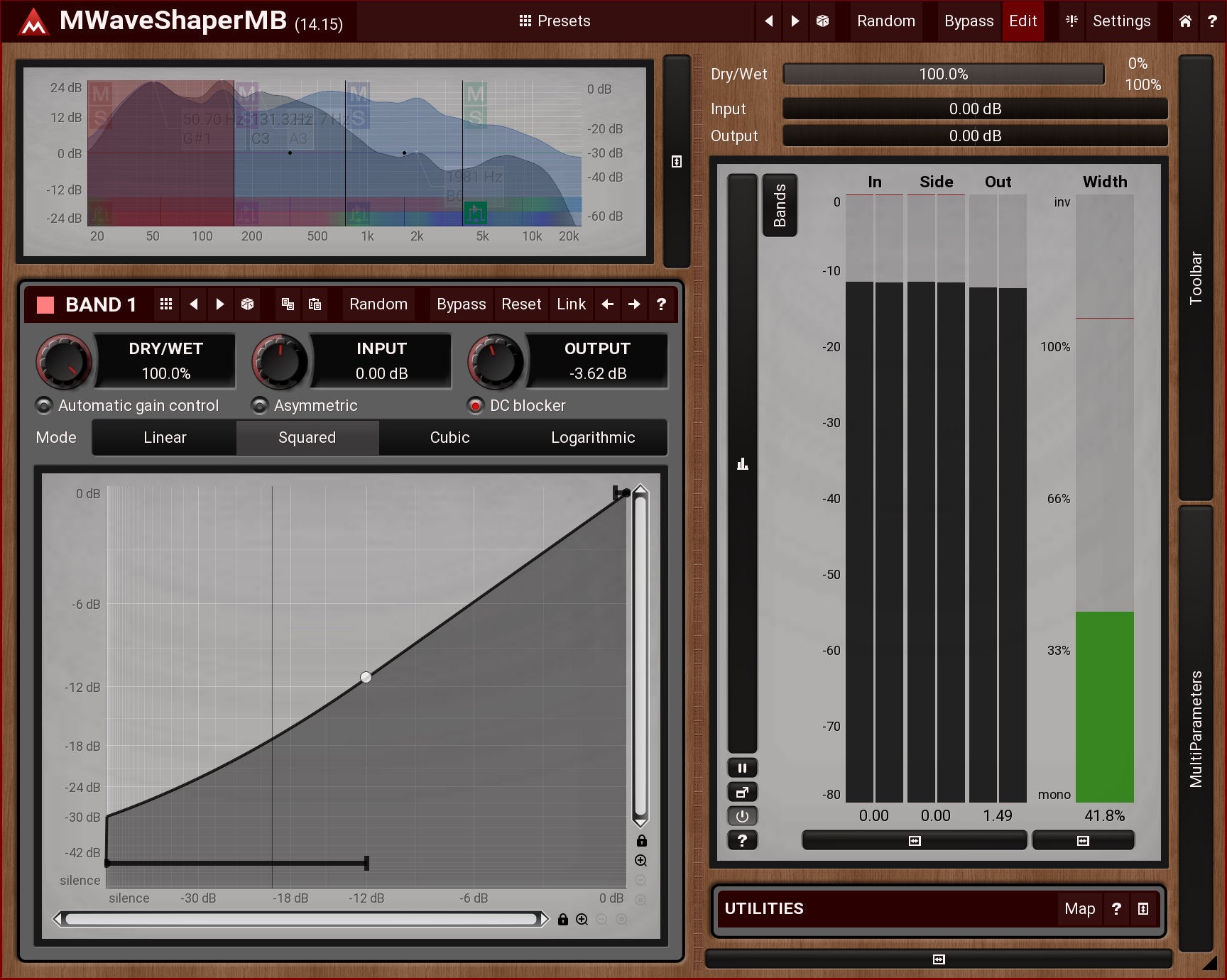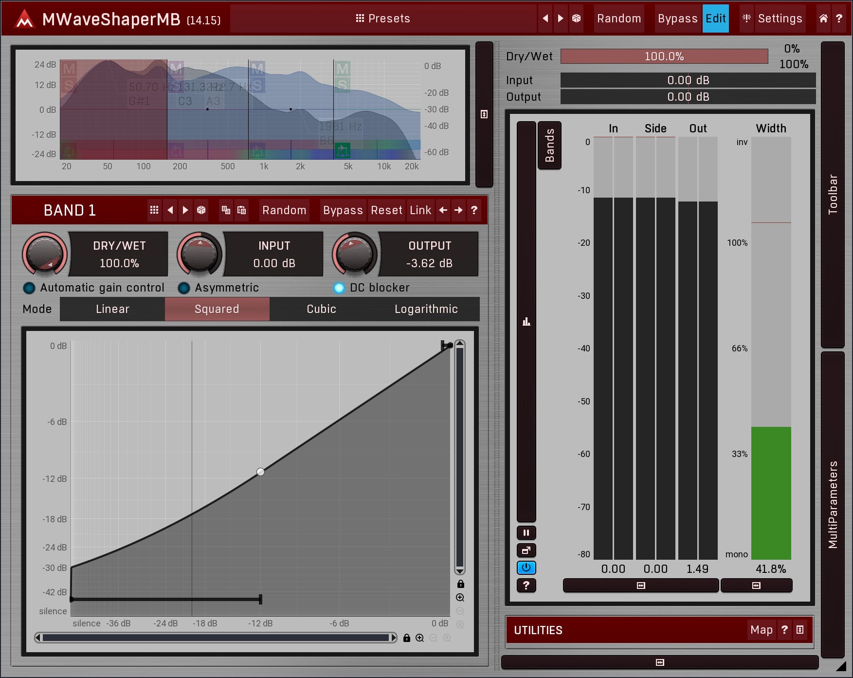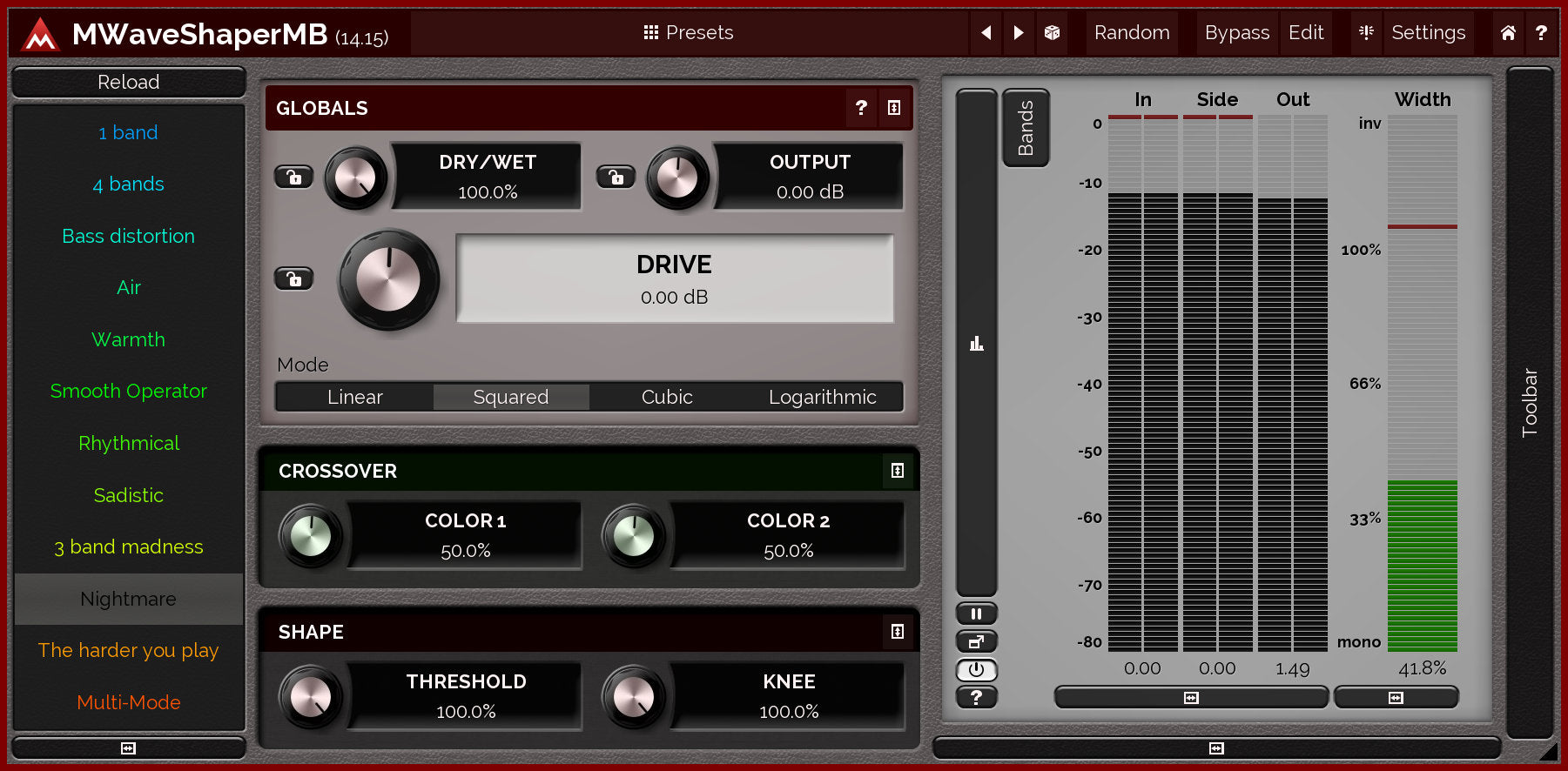 Waveshaping a broadband signal may be useful, but it's usually too overpowering and doesn't give you many options. MWaveShaperMB lets you split the input signal into up to 6 bands and use a different custom shape in each of them. You can even modulate the shapes for real distorted madness.