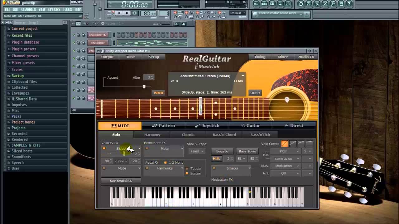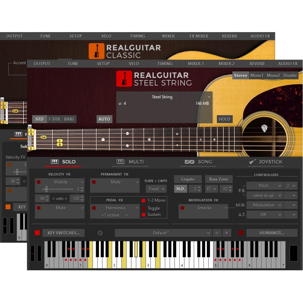 If you are serious about creating truly realistic sounding solo and accompaniment guitar stuff for your songs, our product called RealGuitar is just what you need. RealGuitar is a sample-based virtual instrument with an innovative approach to guitar sound modeling and guitar part performing on keyboard.