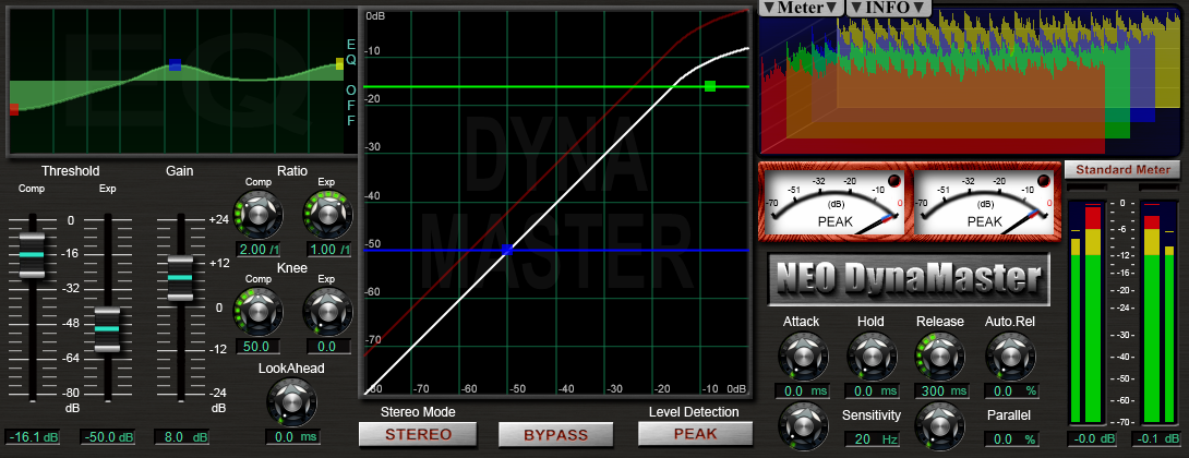 Neo DynaMaster performs simultaneous compression and expansion allowing more complex dynamics response curves than common compressors and provides huge scope to engineer your final sound. Neo DynaMaster's intuitive GUI allows you to precisely edit view the dynamics response curve which is essential if you want to take full control of your dynamic range.