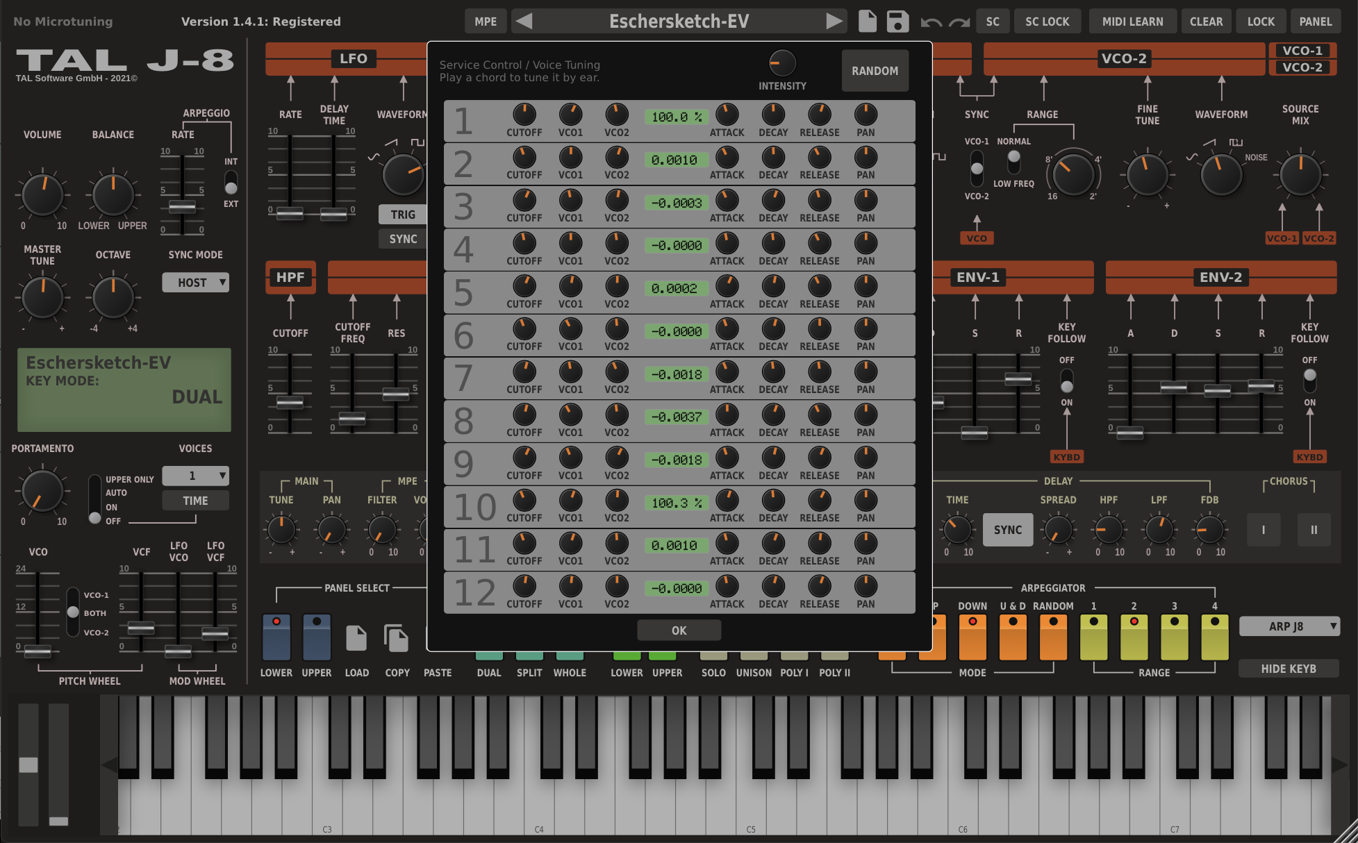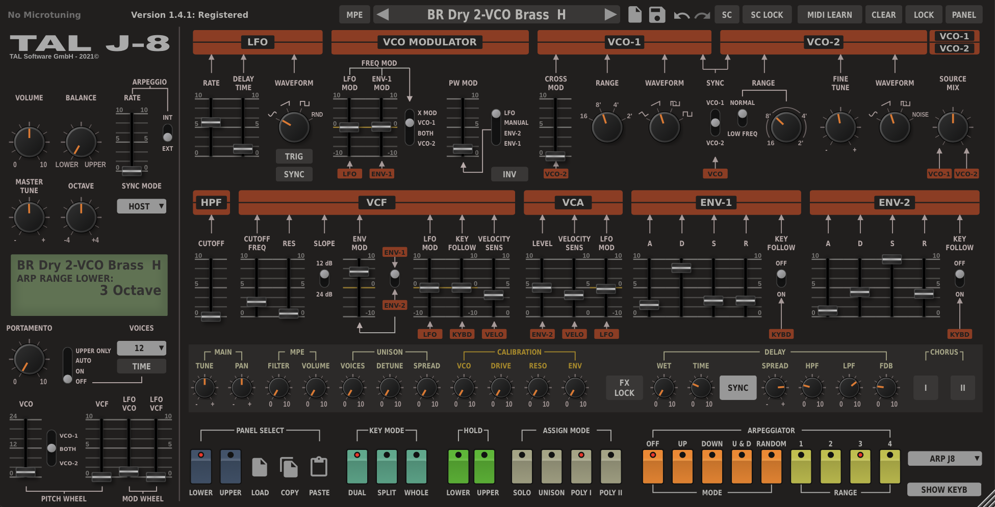 The TAL-J-8 is a very accurate emulation of the popular 80’s hardware synthesiser and calibrated after our own Jupiter 8 device. All sounds are generated in realtime without the use of any samples with the same endless modulation possibilities like the hardware and useful additional features like the calibration section that can make the filter scream.