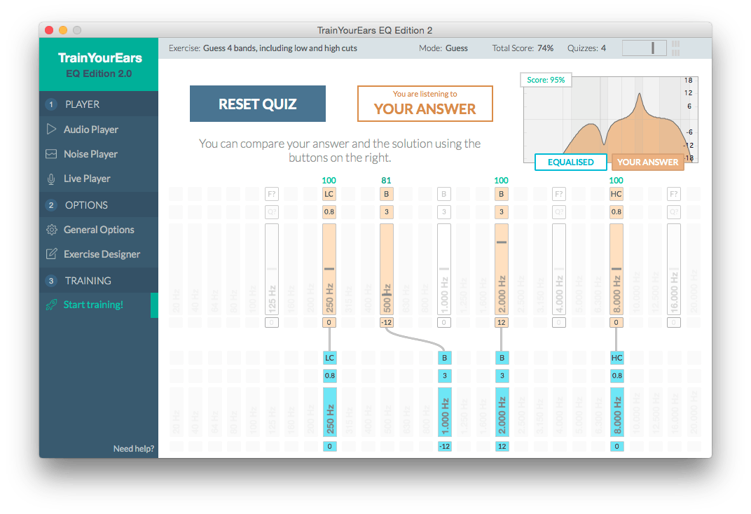 El software genera ejercicios aplicando la configuración de EQ a las canciones que ha cargado desde su biblioteca de música, o con ruído blanco o rosa. A continuación, tiene que adivinar qué frecuencia se aumentó o encogió. Finalmente, su respuesta será evaluada, y será capaz de comparar su respuesta con la respuesta correcta.