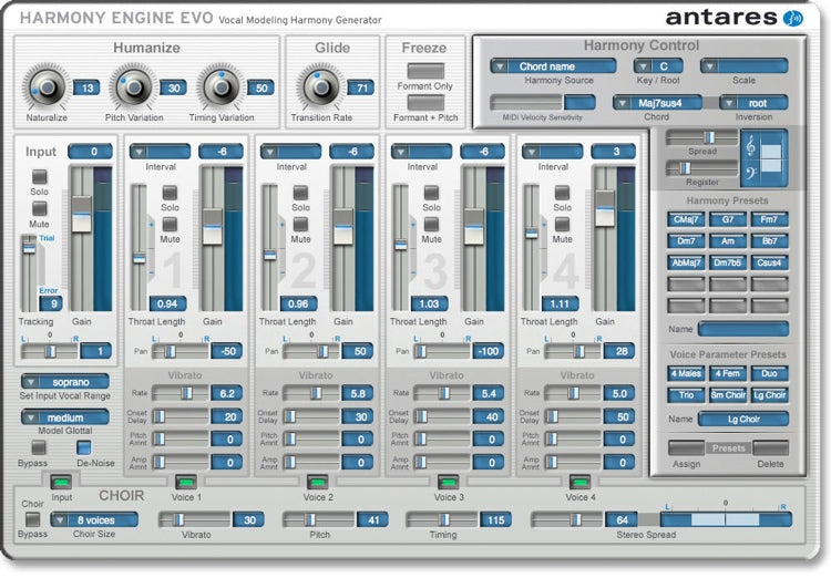 Harmony Engine features four high-quality harmony voices with independently adjustable vocal character, vibrato, and pan settings for realistic or extreme effects. And five channels of our Choir vocal multiplier lets you turn each harmony voice into 2, 4, 8, or 16 individual unison voices.