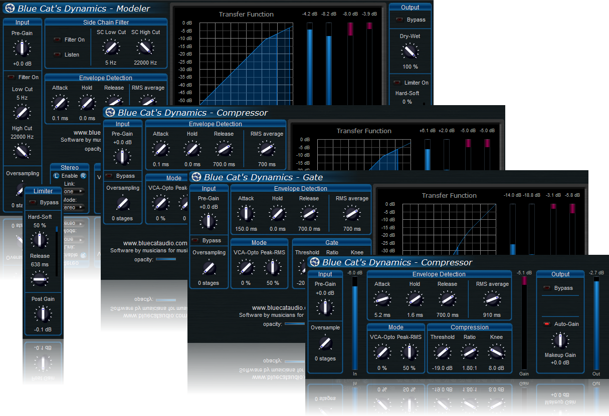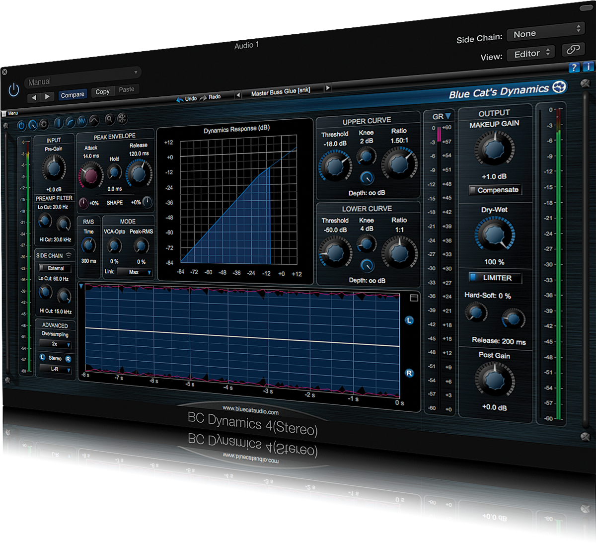 Blue Cat's Dynamics is a complete dynamics effect processor: it can be used as a compressor, limiter, gate, expander or even waveshaper for distortion. You can manage the dynamics response of the plug-in with a unique two-thresholds system. The plug-in includes an input filter as well as a side chain filter, in order to control the frequencies affected by the compression. Its continuous VCA/Opto and Peak/RMS controls let you smoothly and precisely choose the behavior of the envelope detection like you have never been able to.