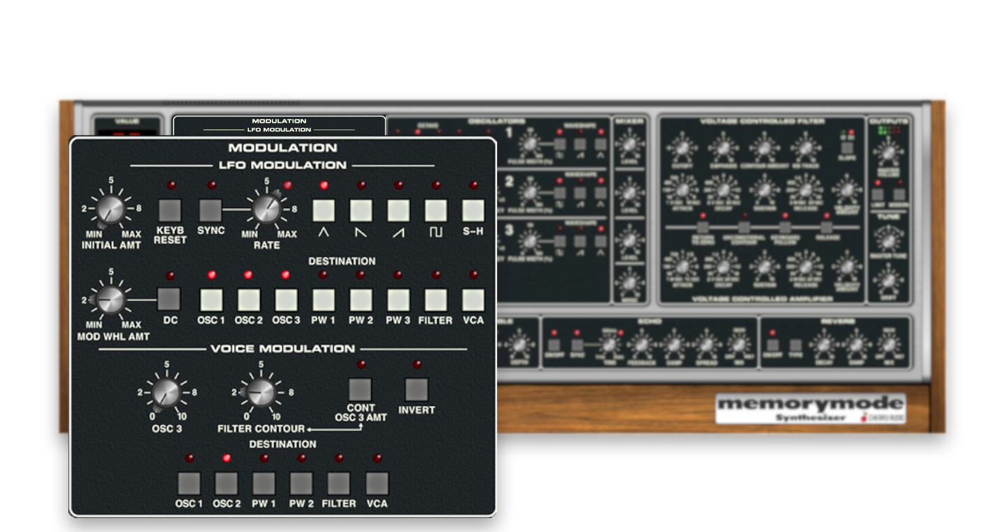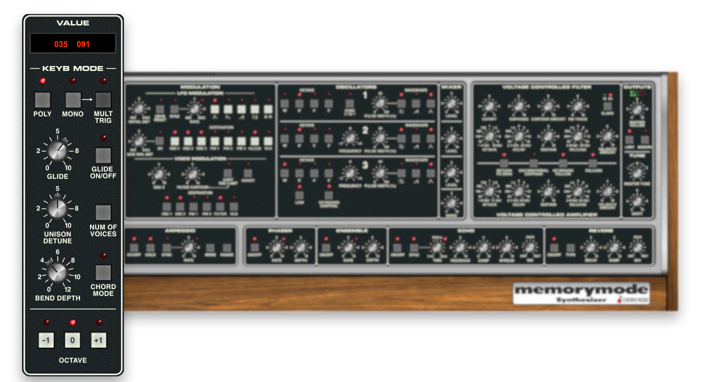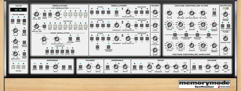 Memorymode replicates the incredible sound and feel of the original instrument at a tiny fraction of the cost of a vintage original, delivering all the power and musicality of the Memorymoog at a price anyone can afford.