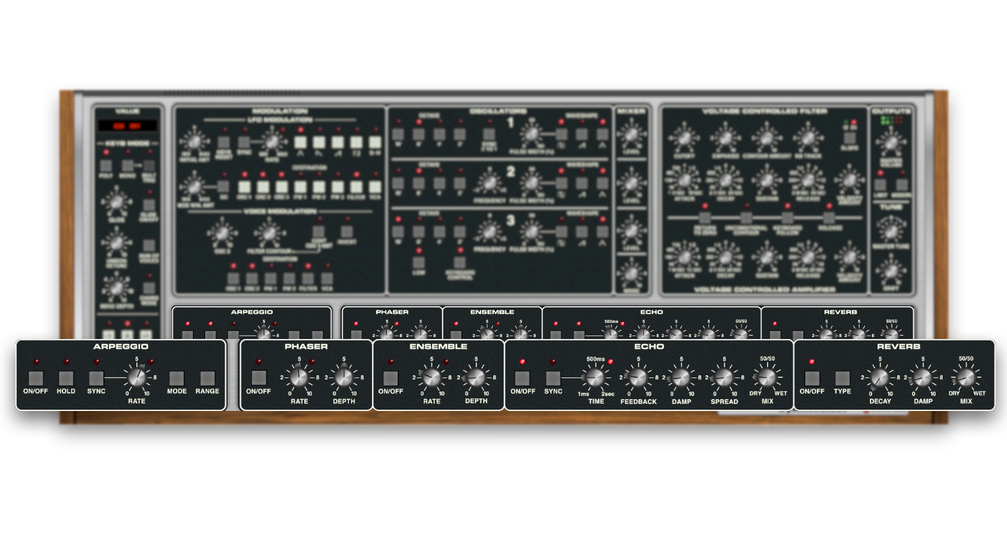 In addition to all of the voicing and modulation that made the original sound so great, we’ve added a number of creative and convenient features aimed at modern music makers. Memorymode’s LFO, arpeggio, and delay effects all feature one-button tempo sync, and filter and amplitude velocity sensitivity add a whole new layer of expressiveness. A unique Drift parameter allows continuously-variable adjustment of tuning accuracy, from perfectly in tune, to aged and loose, or anywhere in between, and the Modern button brings Memorymode into the present with fattened bass and sparkling highs. Comprehensive MPE support is included for expressive controller performances, and Memorymode’s high-quality effects add the final polish to patches, including an earthy stereo phaser, a dreamy stereo ensemble, a flexible tempo-synced echo, and a lush reverb section.